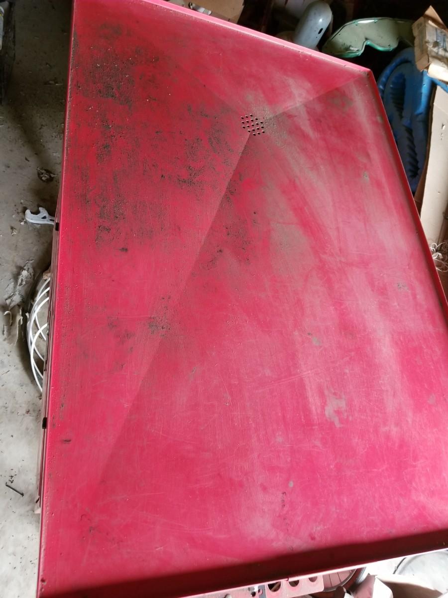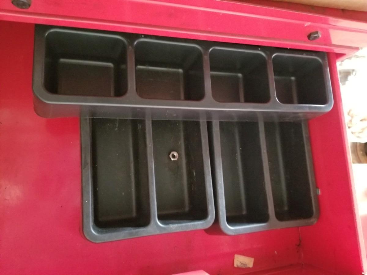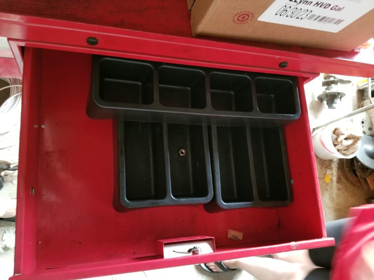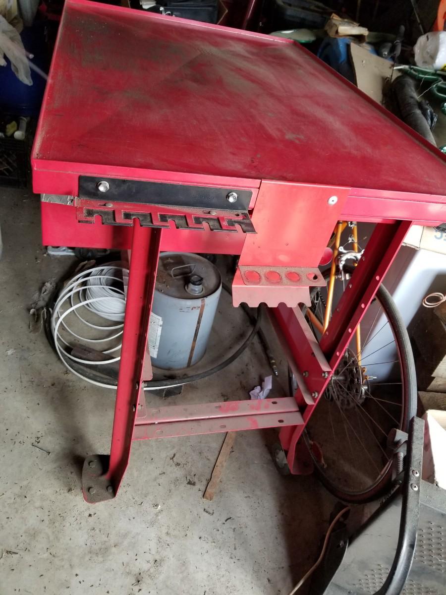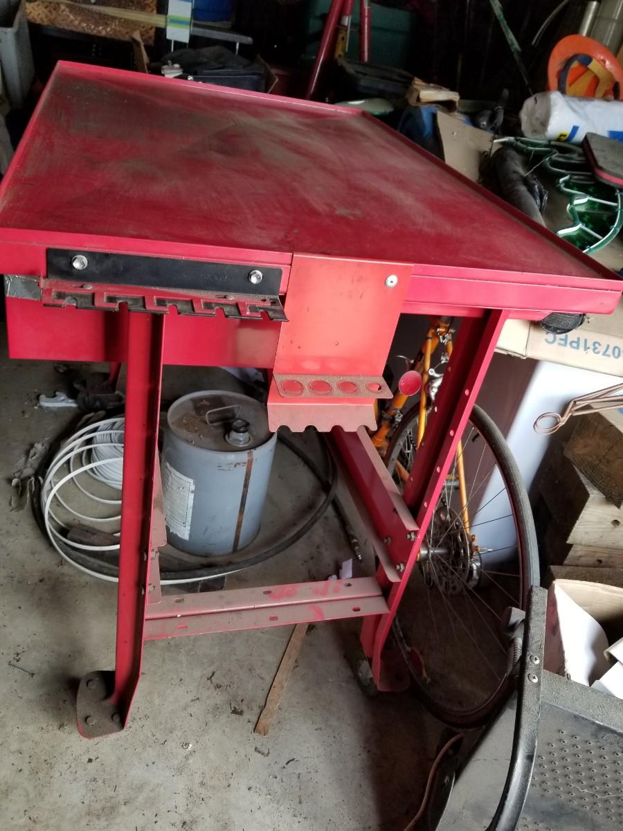 Has a single drawer and a tub to catch fluids. 47"x32"x41"