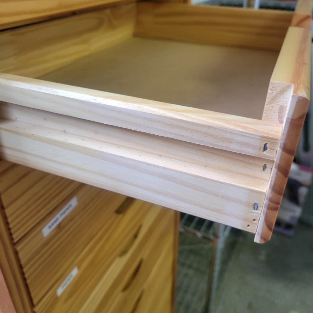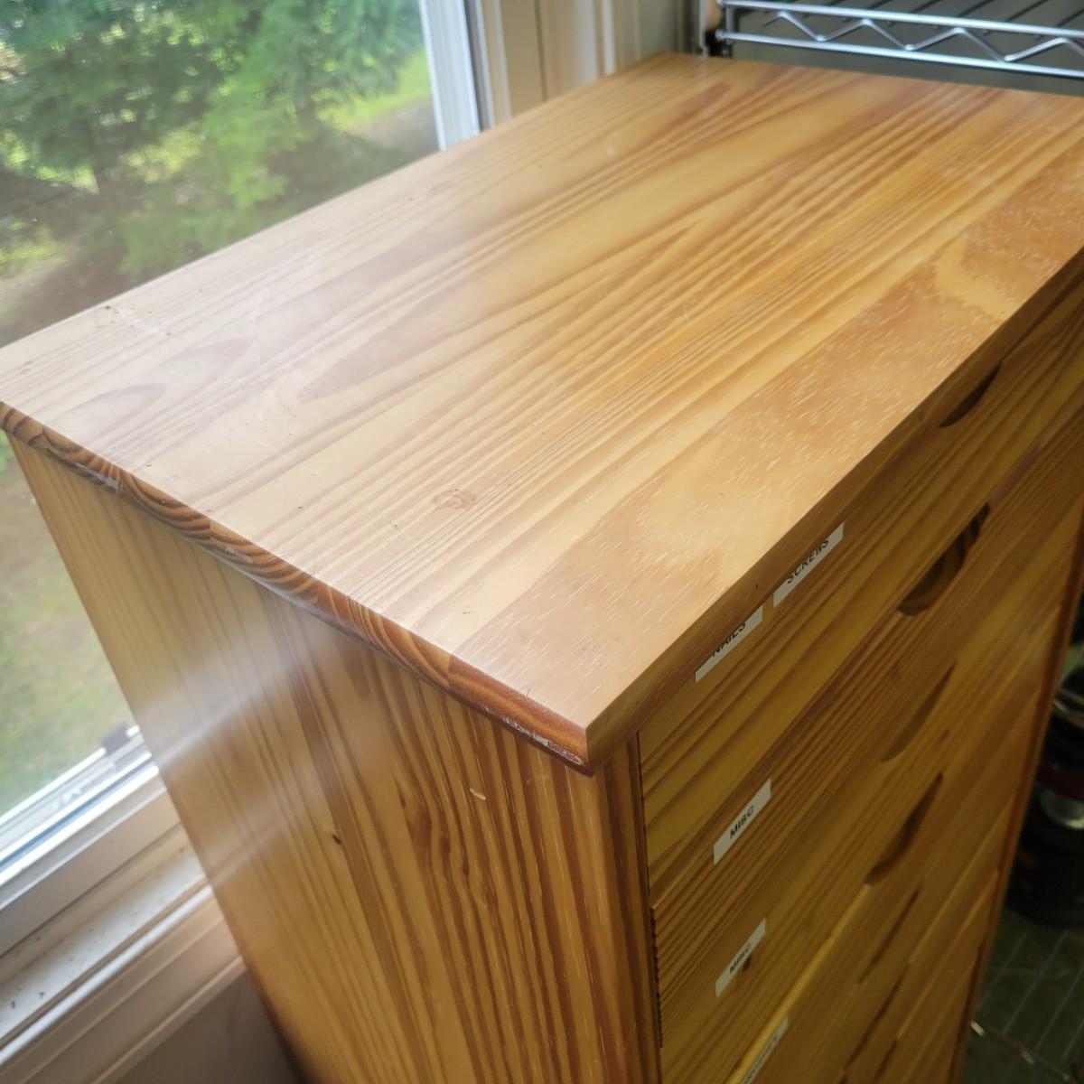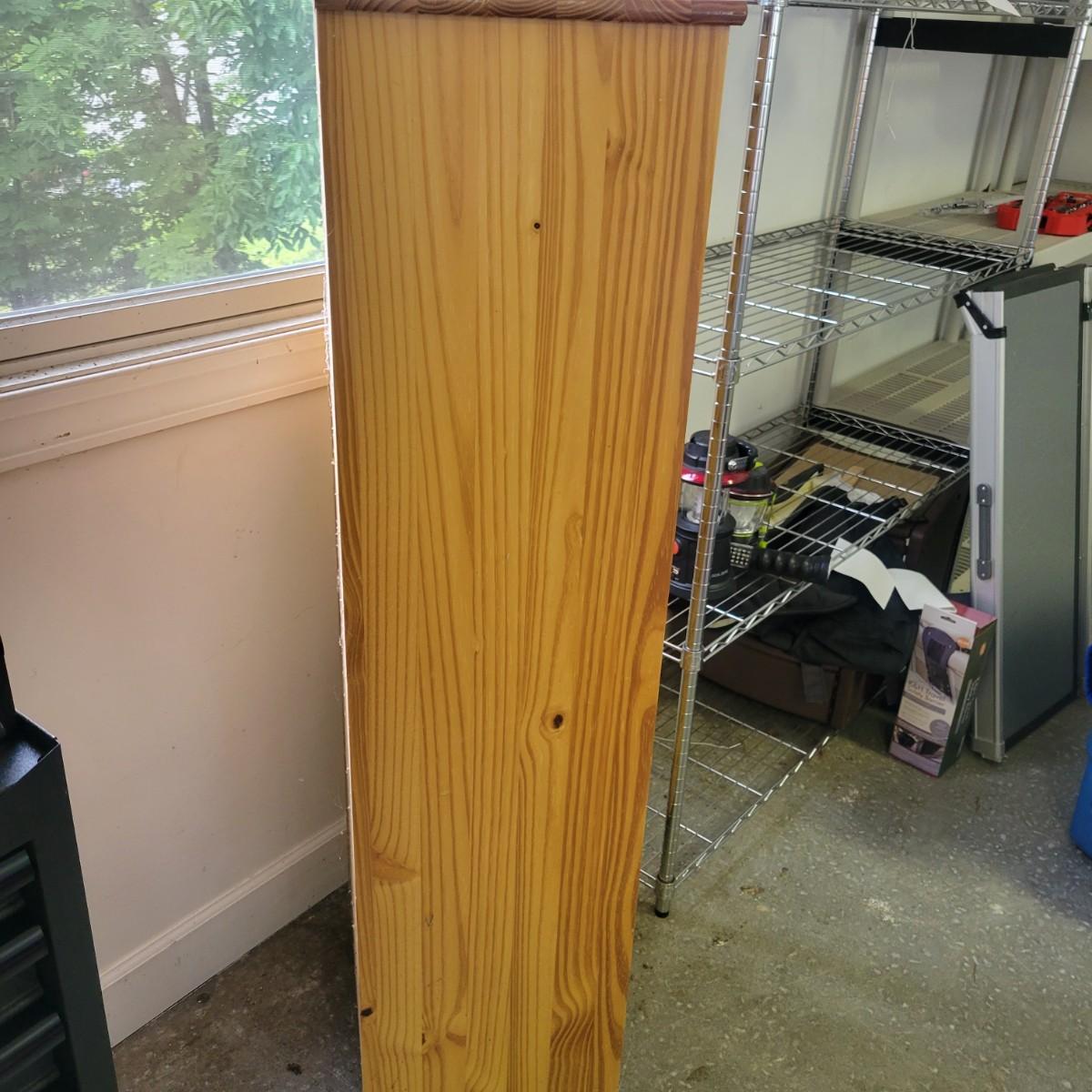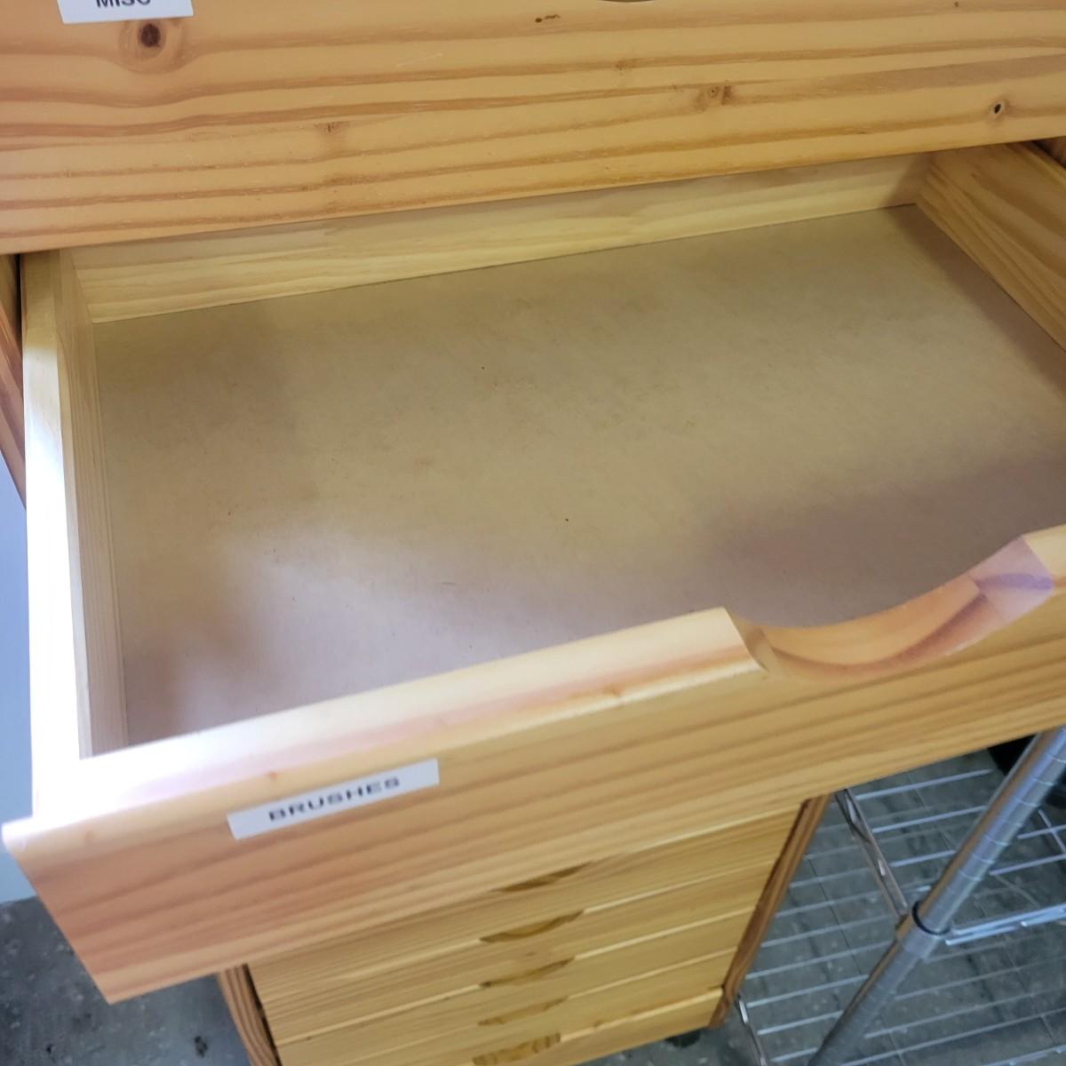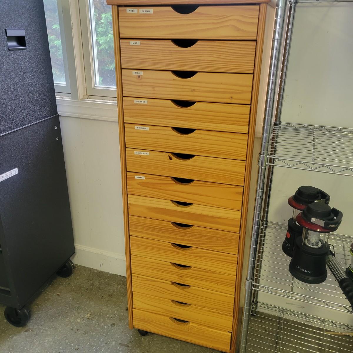 A solid wood storage cabinet made of pine with a light colored stain. This cabinet has 14 drawers and includes plastic casters. Plastic labels on drawers remain due to sticky residue left when removed. One other of these chests is in the sale. It measures approximately 20" x 13.5" x 56". Local pickup only