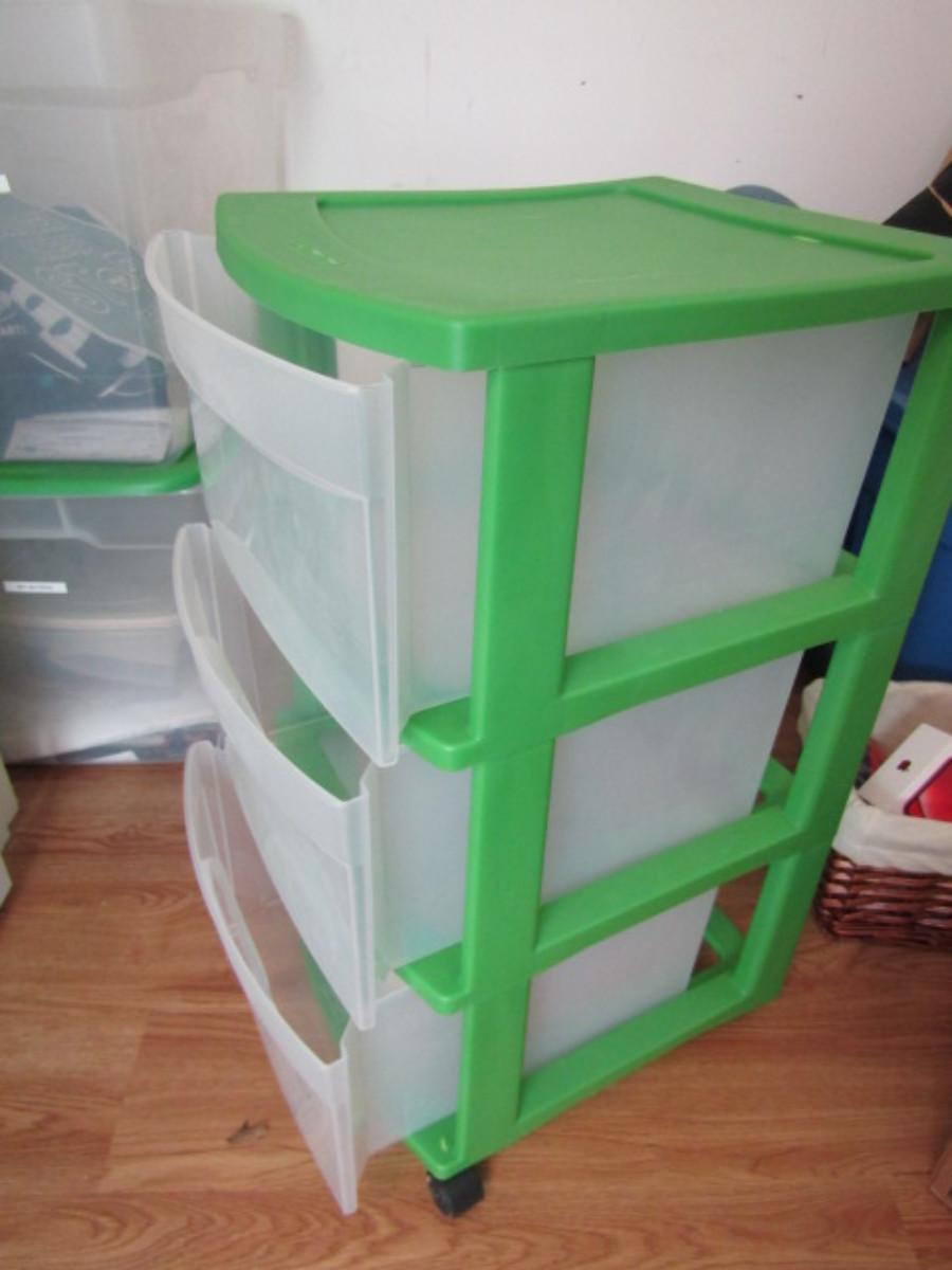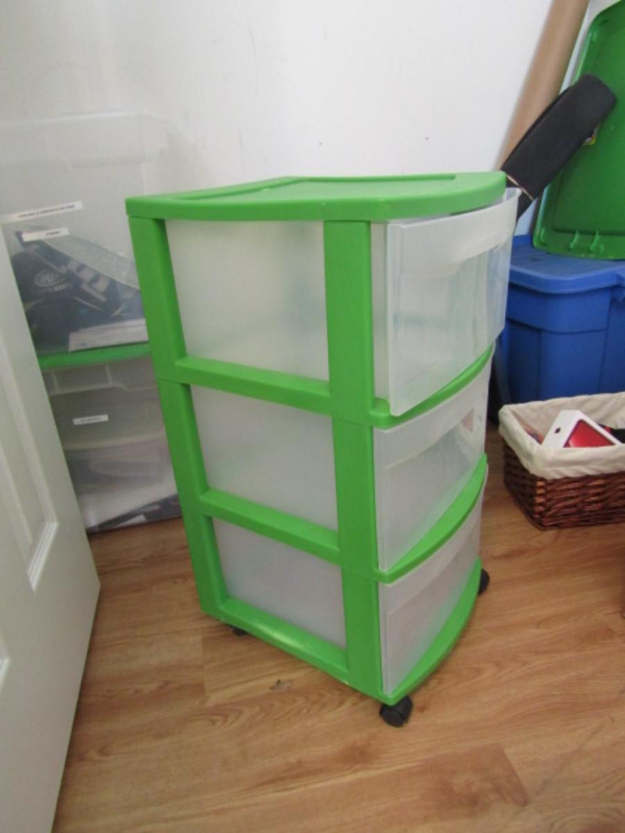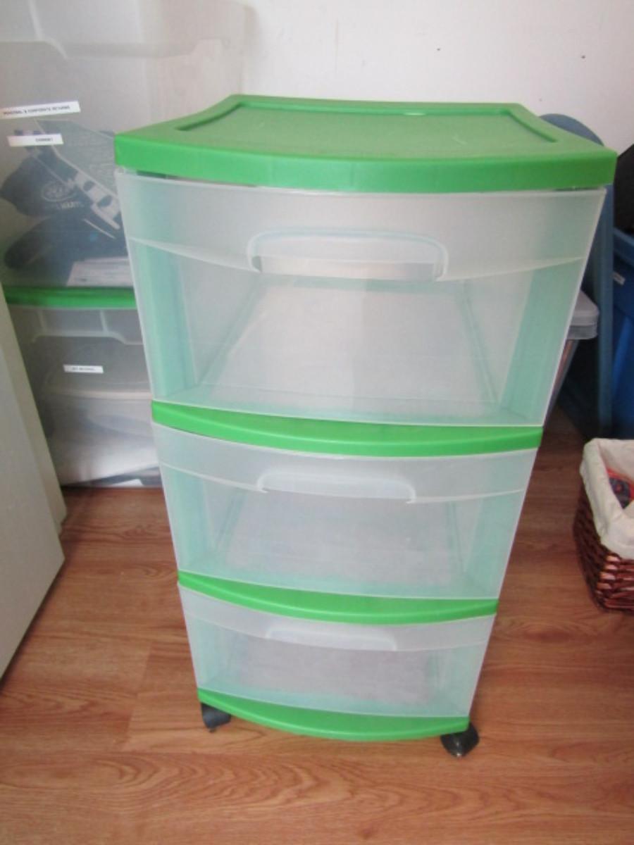 Rolling Plastic 3-Drawer Organizer by Sterilite. Some scratching/discoloration on top- please see all pictures.