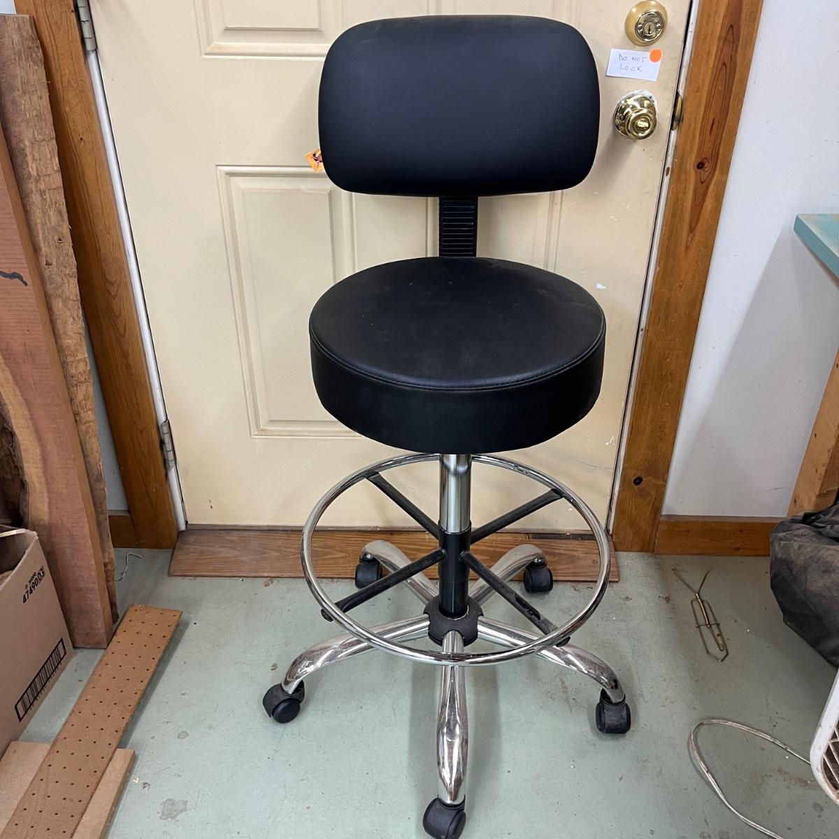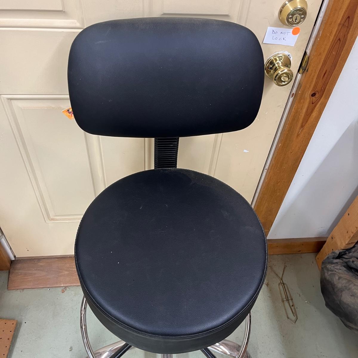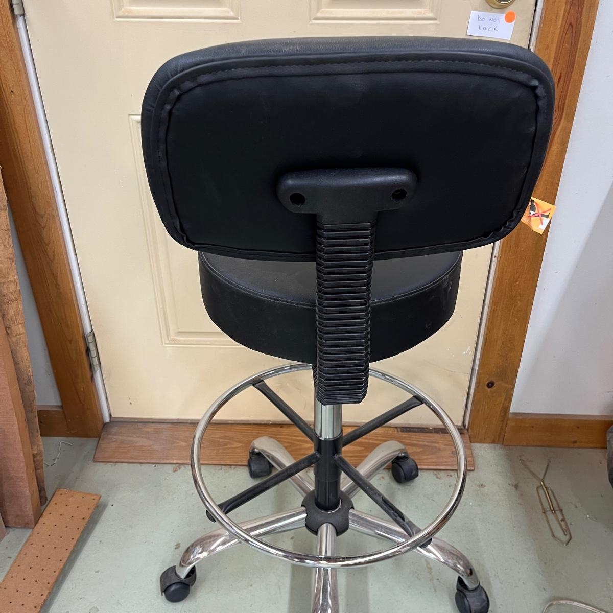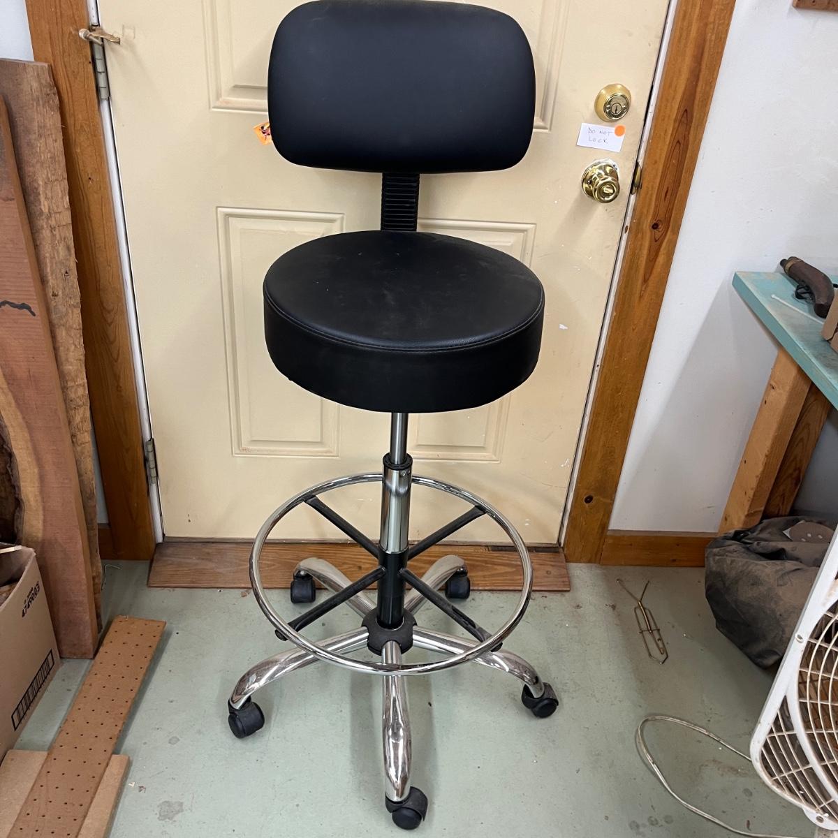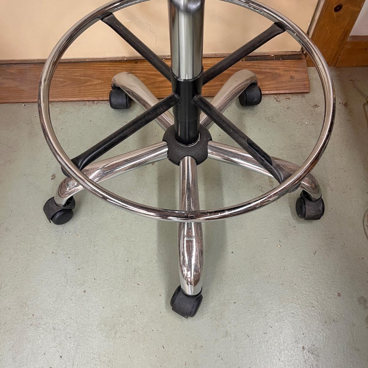 This rolling shop chair has a metal base with adjustable height vinyl covered seat. Chair measures 24”D x 48”H with a 35” seat height at maximum height and 29” at lowest height.
