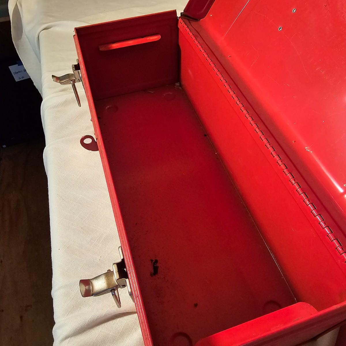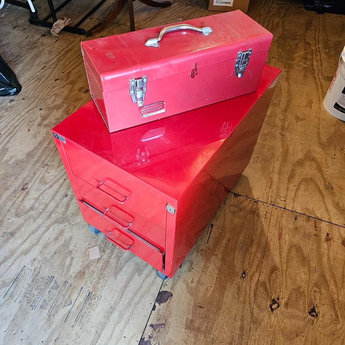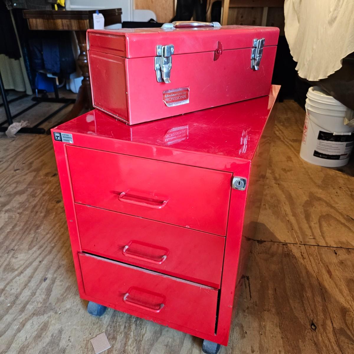 A three drawer steel rolling base and a smaller handled toolbox. Base piece has three drawers with handles, measures 16" x 26" x 22"H. No key for lock. Small toolbox is by Union Mfg., has handle and lift out tool tray inside. Measures 19" x 7" x 7"H. See photos for details. Local pickup only.