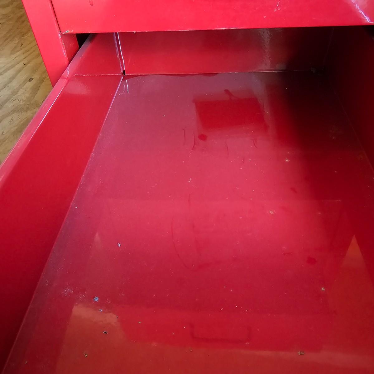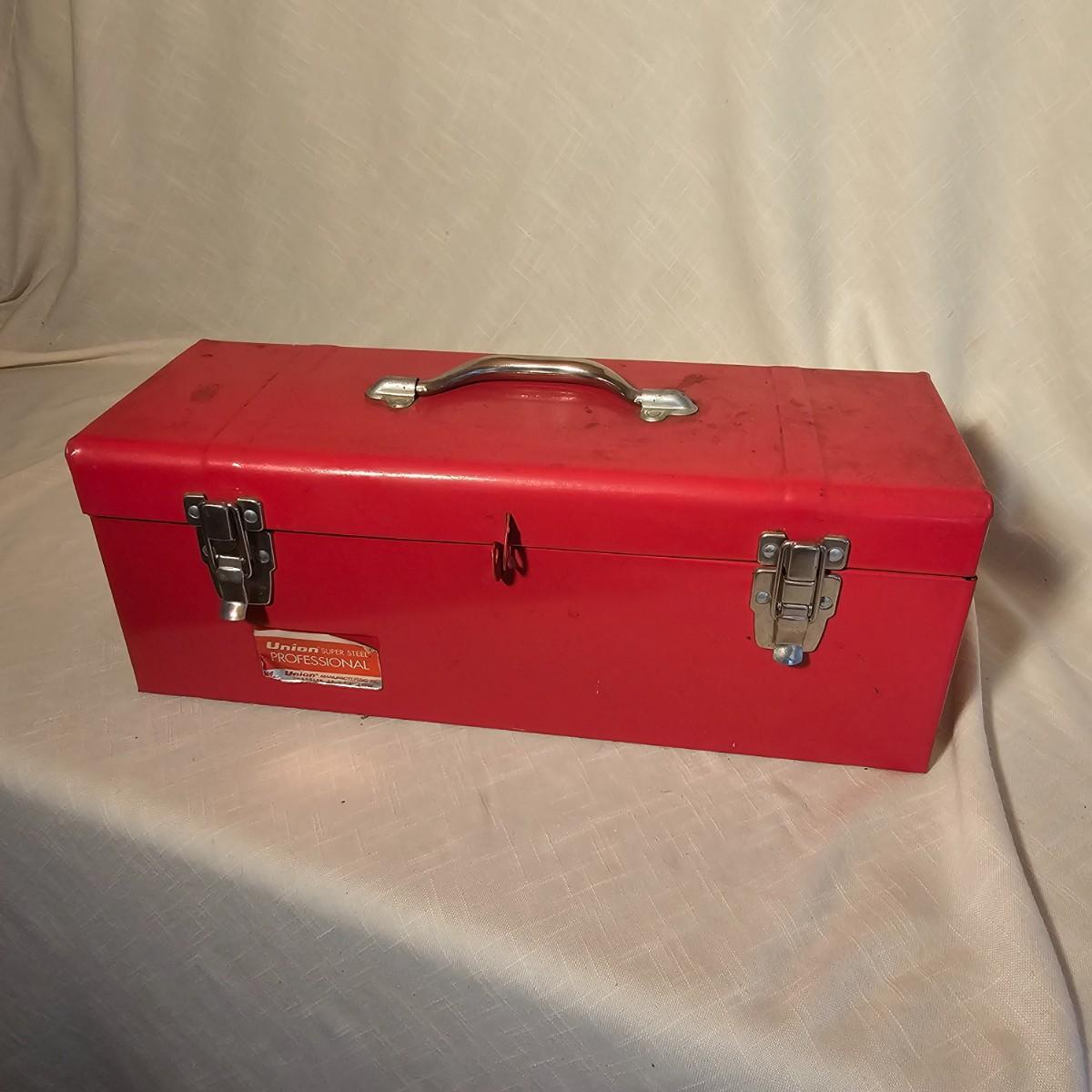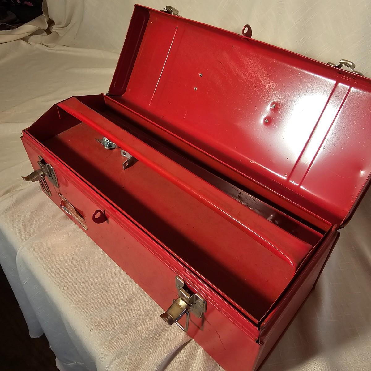 A three drawer steel rolling base and a smaller handled toolbox. Base piece has three drawers with handles, measures 16" x 26" x 22"H. No key for lock. Small toolbox is by Union Mfg., has handle and lift out tool tray inside. Measures 19" x 7" x 7"H. See photos for details. Local pickup only.