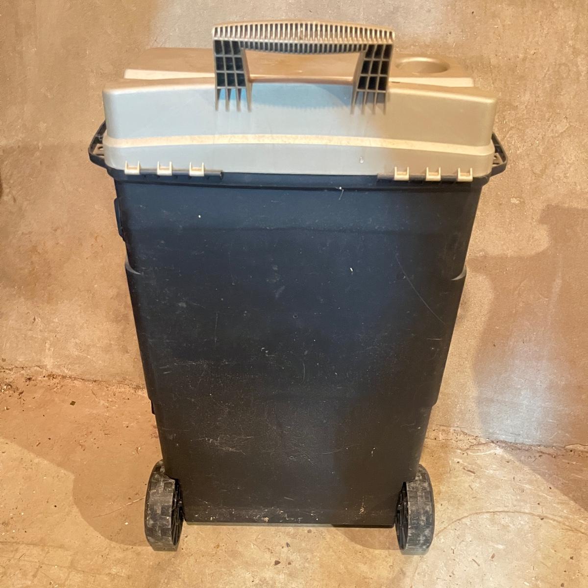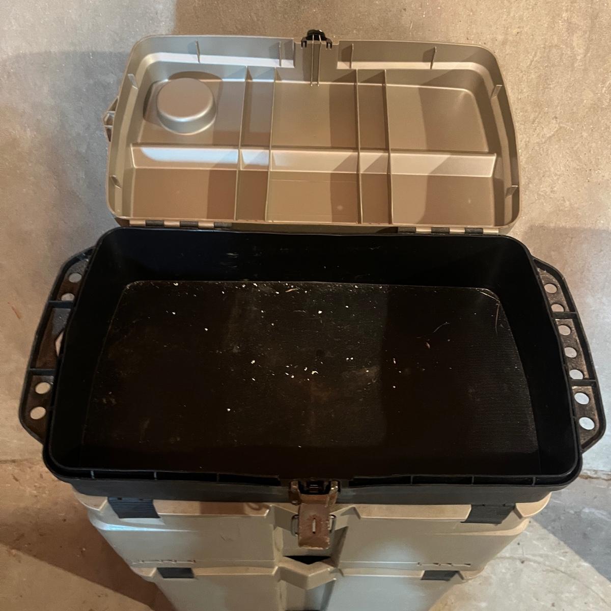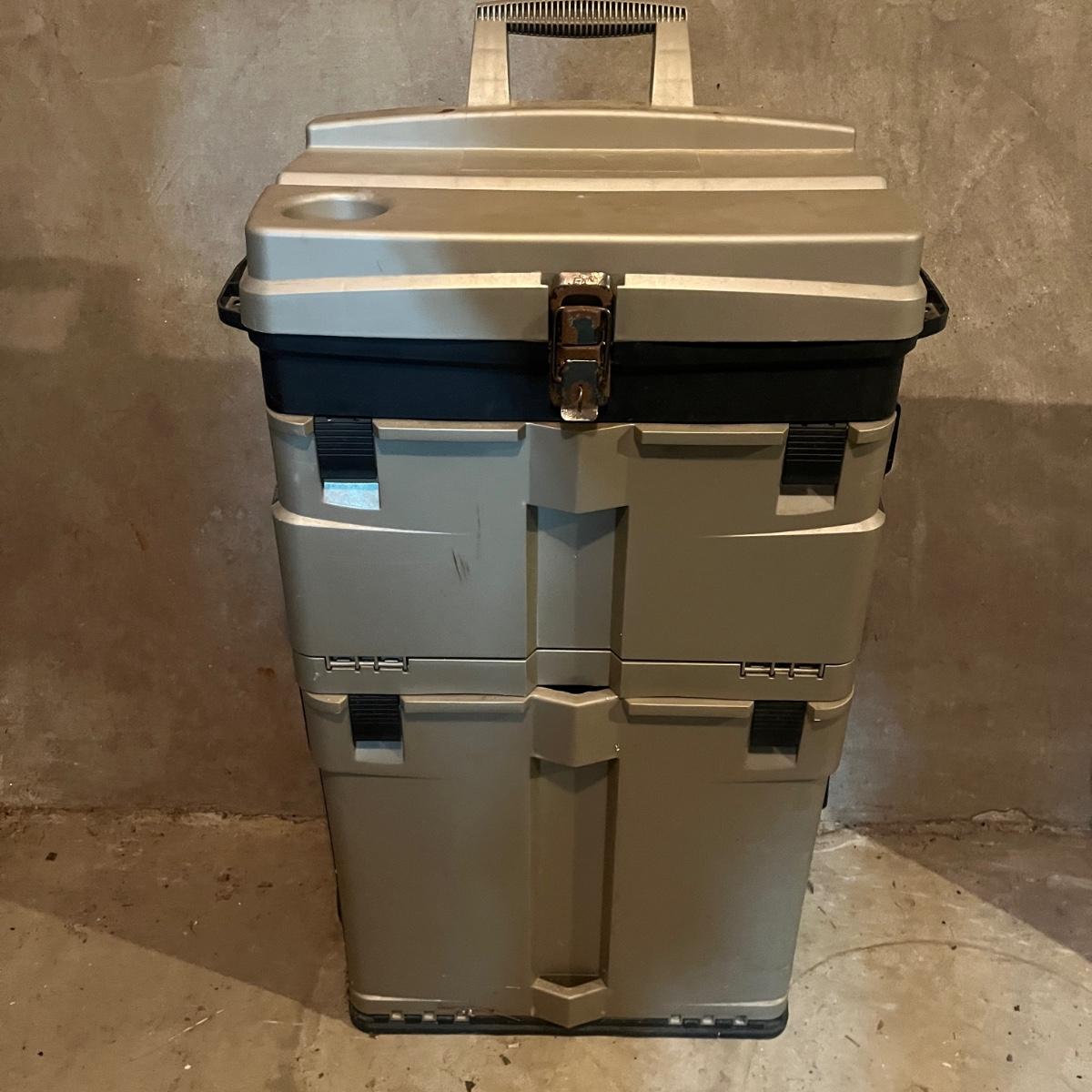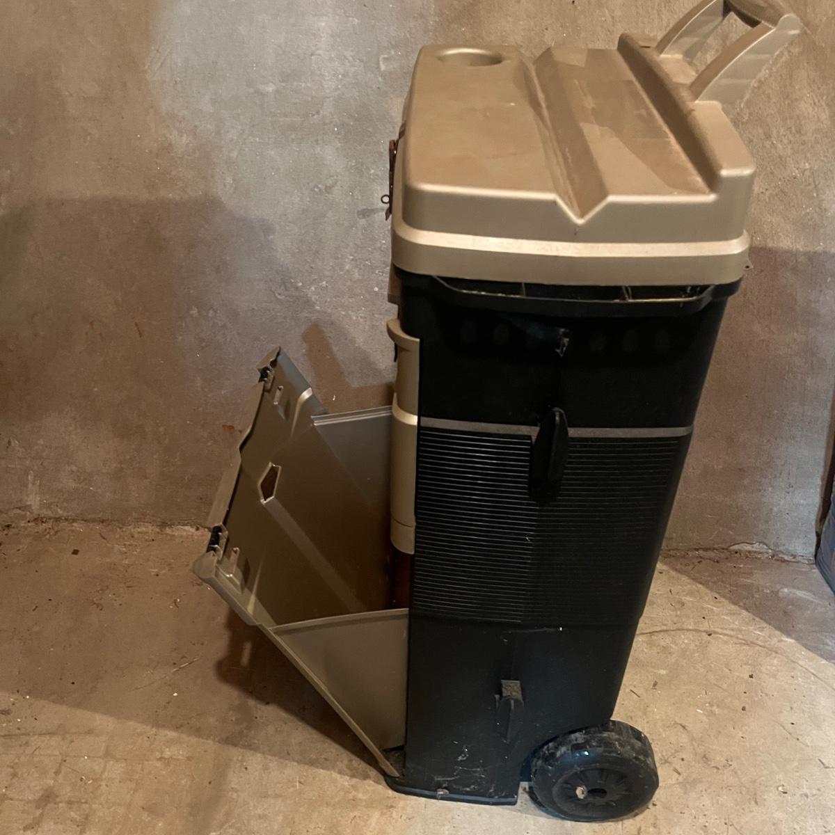 This plastic rolling storage workstation has storage on top, three drawers, storage bin and measures 21” x 14” x 36”H.