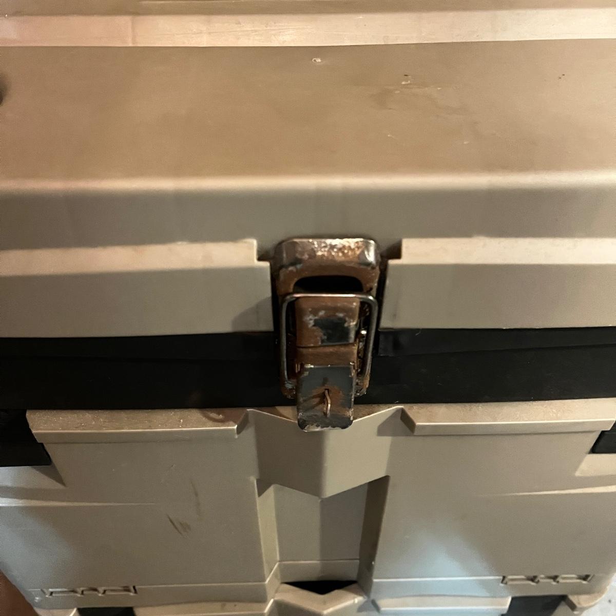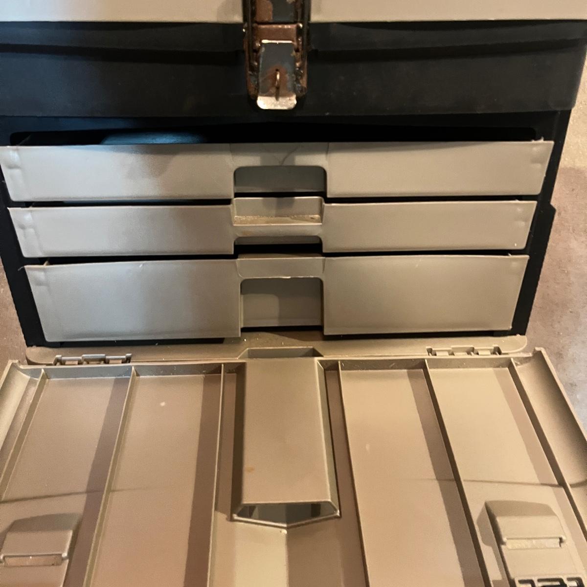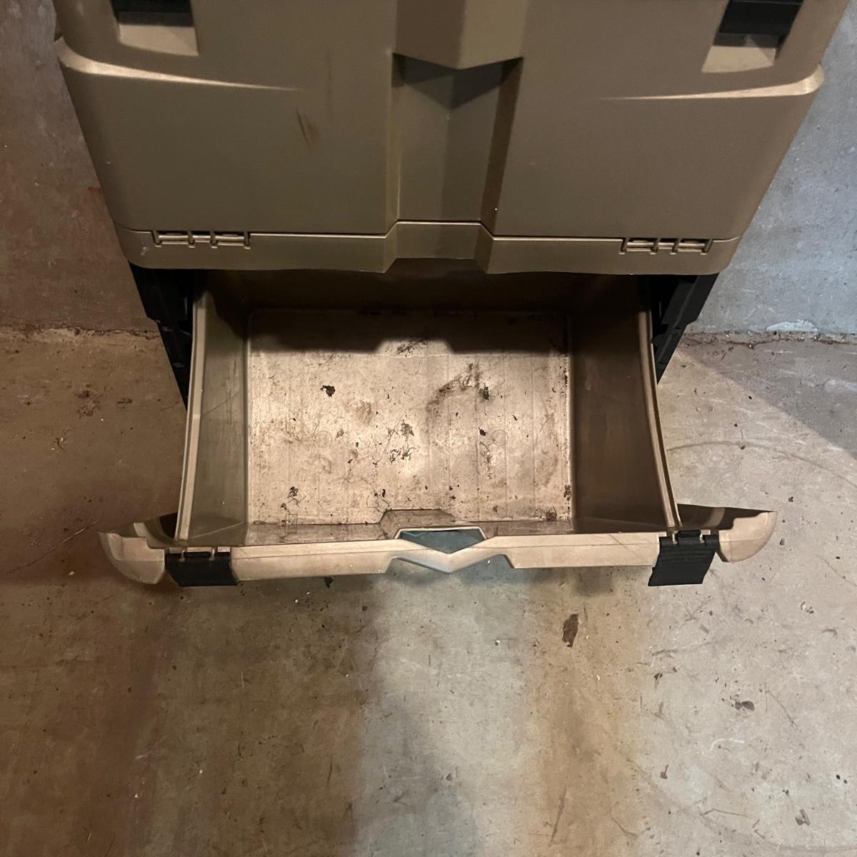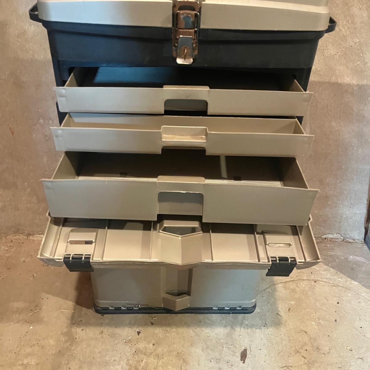 This plastic rolling storage workstation has storage on top, three drawers, storage bin and measures 21” x 14” x 36”H.