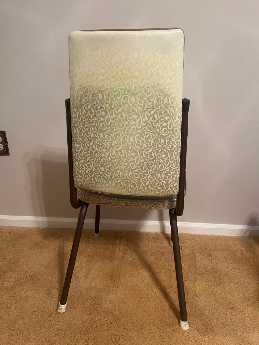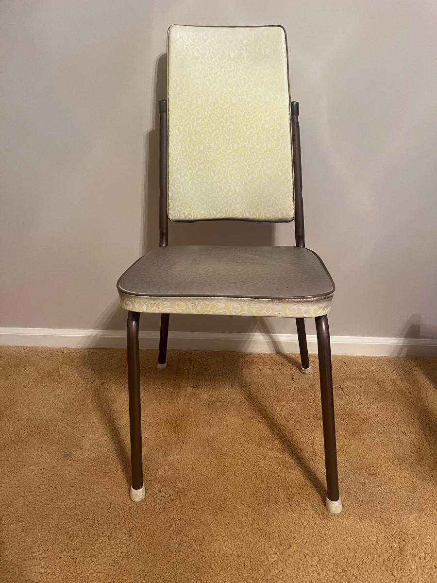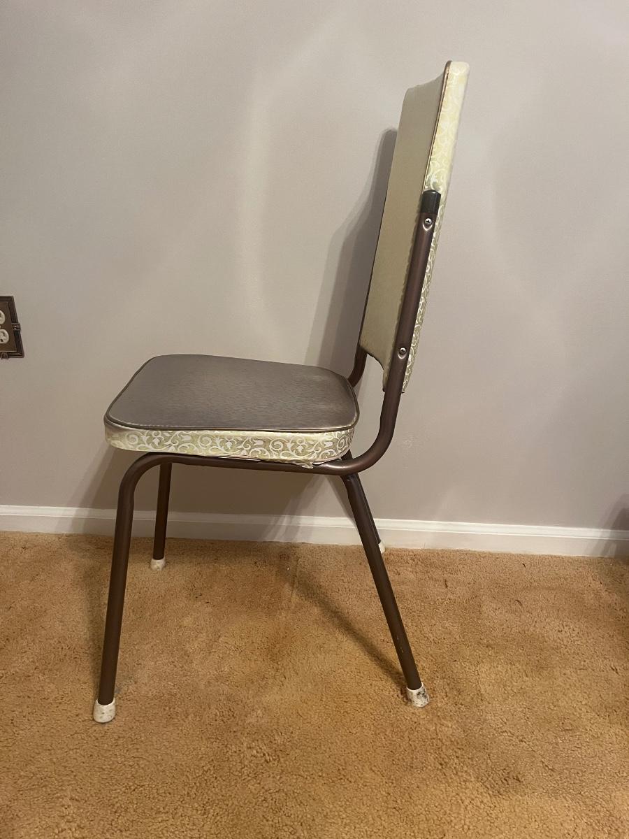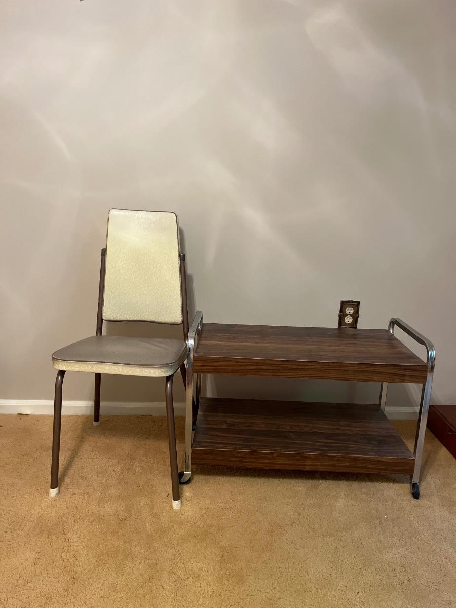 Lot includes a metal and pressed wood rolling TV cart and a retro metal framed chair with vinyl padded seat and back. Chair has fading. Chair measures approximately 15” x 15” x 34”H with 17” seat height and cart measures 30” x 16” x 22”H.