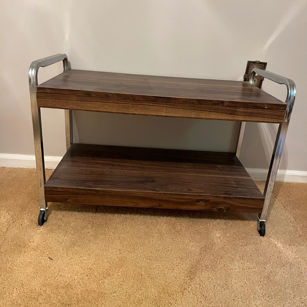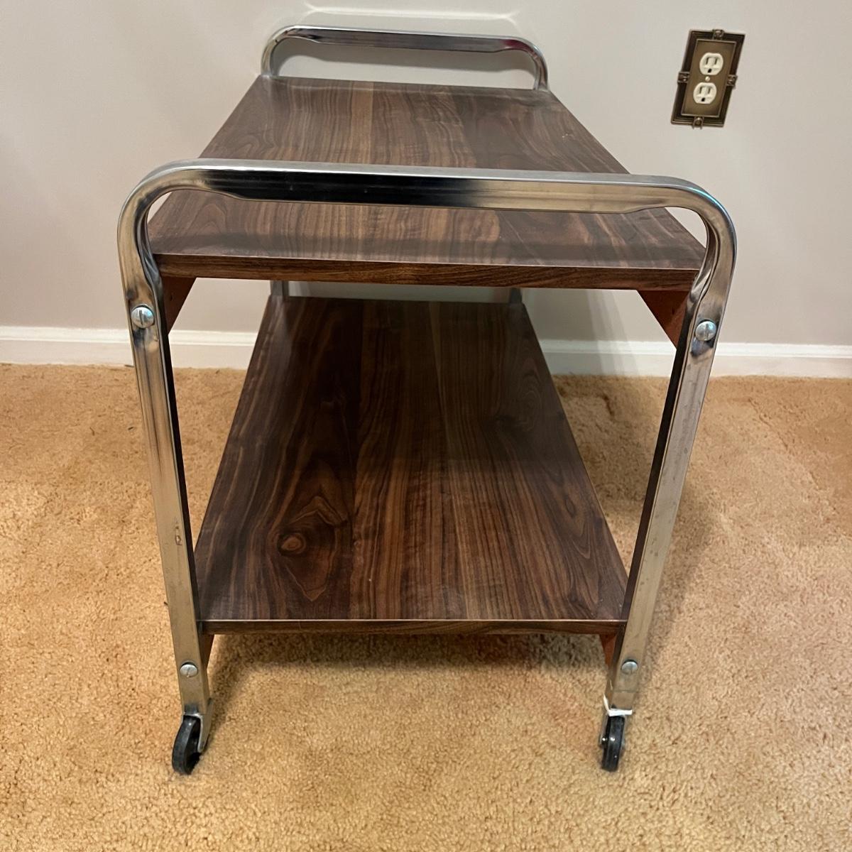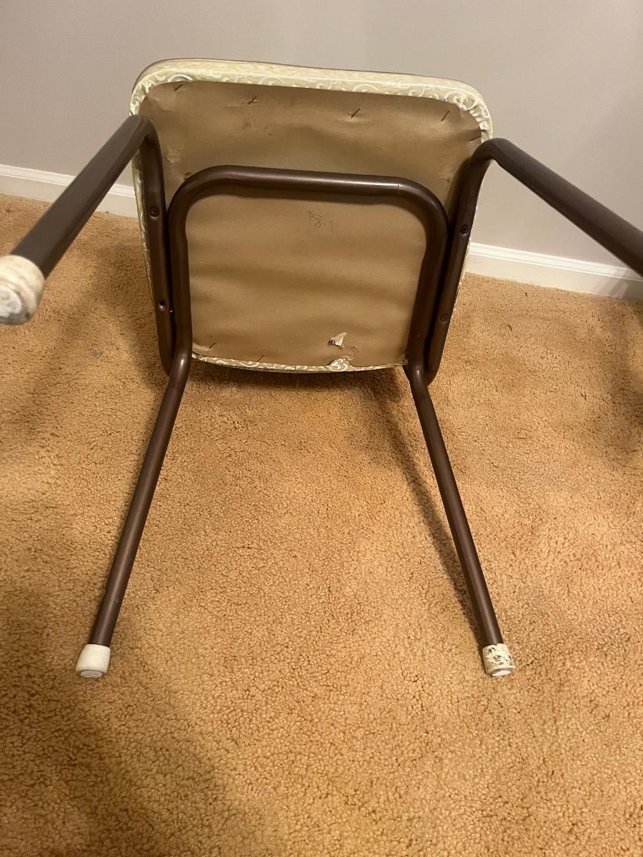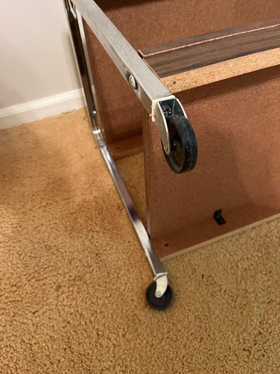 Lot includes a metal and pressed wood rolling TV cart and a retro metal framed chair with vinyl padded seat and back. Chair has fading. Chair measures approximately 15” x 15” x 34”H with 17” seat height and cart measures 30” x 16” x 22”H.