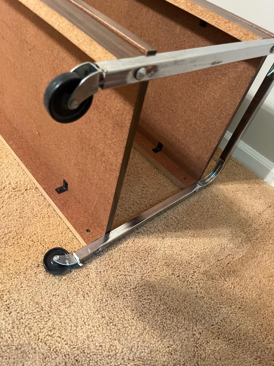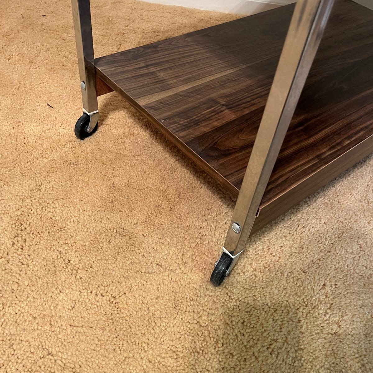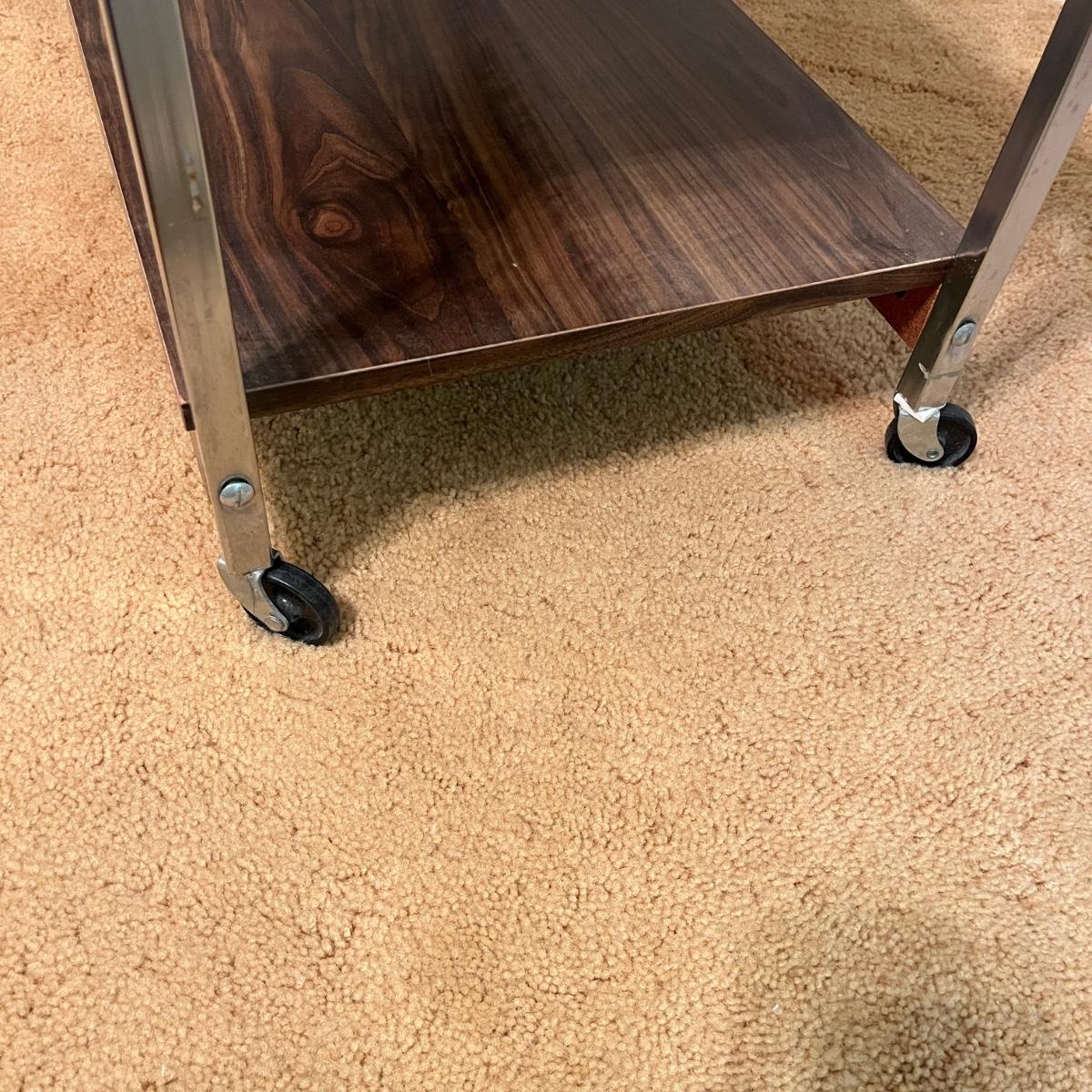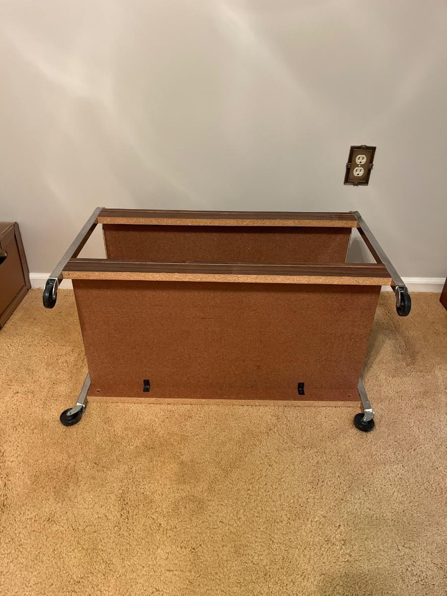 Lot includes a metal and pressed wood rolling TV cart and a retro metal framed chair with vinyl padded seat and back. Chair has fading. Chair measures approximately 15” x 15” x 34”H with 17” seat height and cart measures 30” x 16” x 22”H.