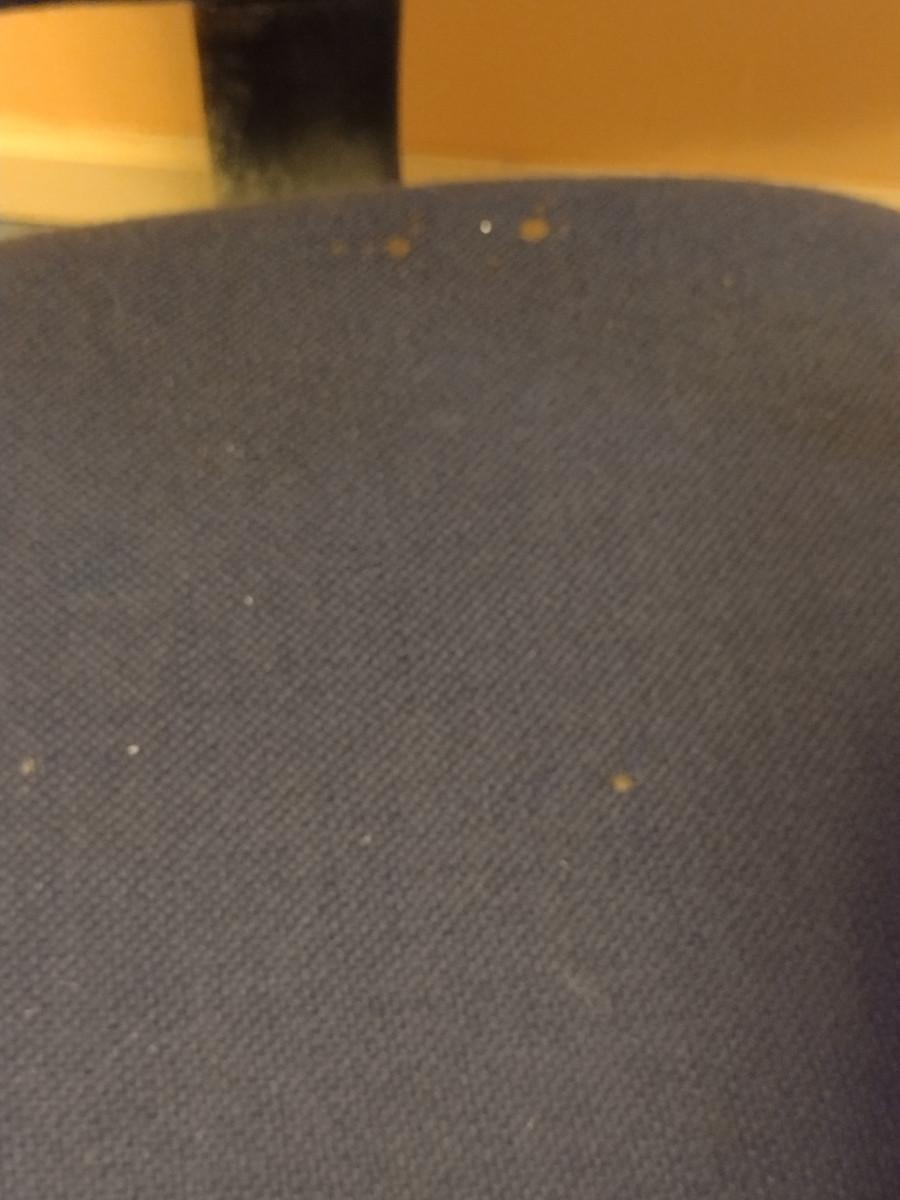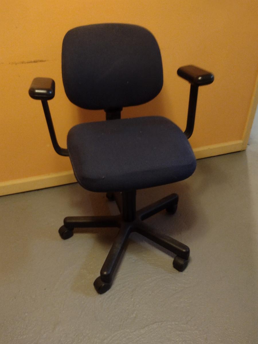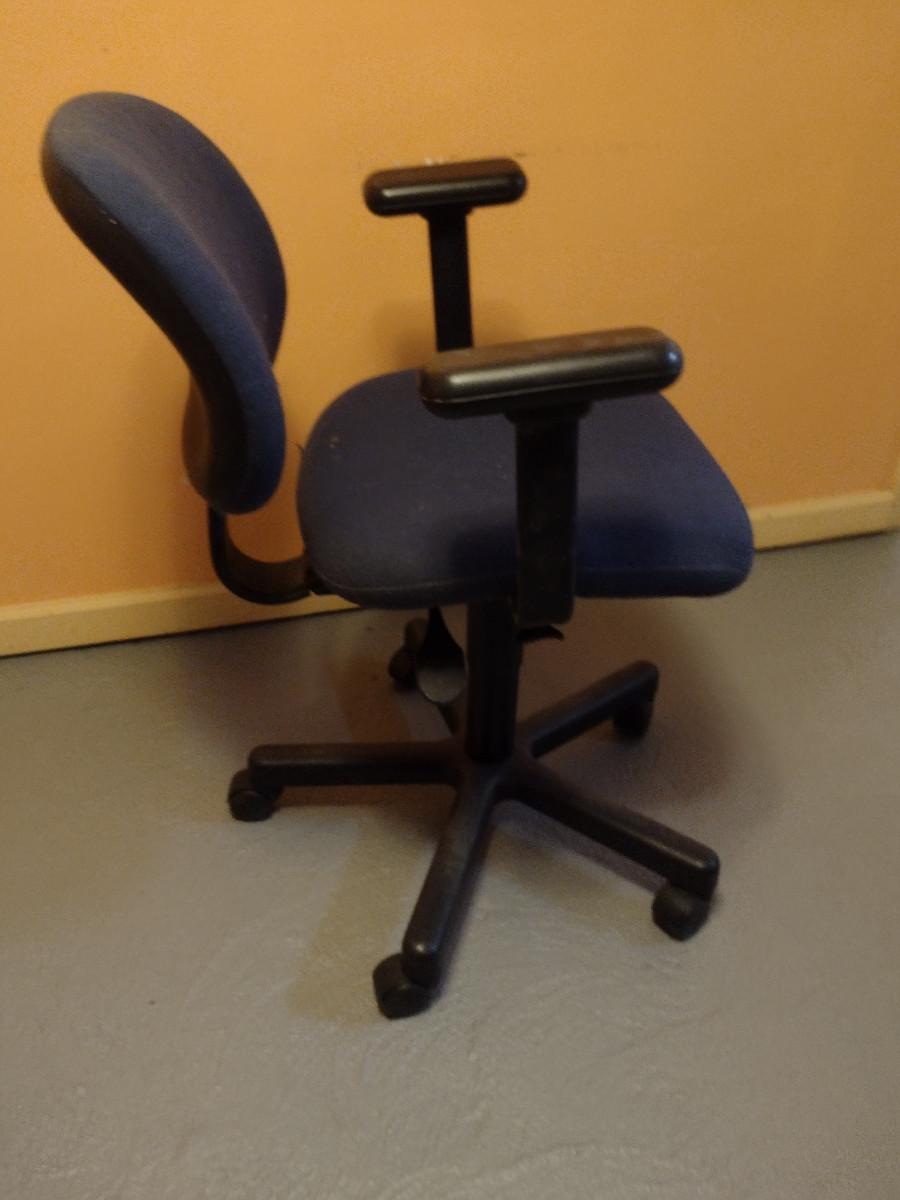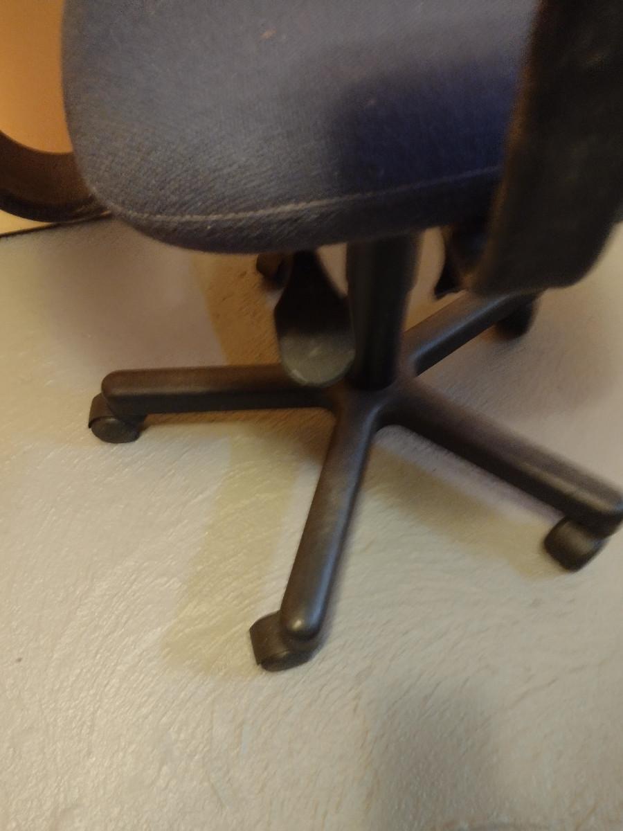 Rolling Upholstered Office Chair. Upholstery has some staining- please see all pictures. Item is located downstairs and must be brought up a flight of steps for removal.