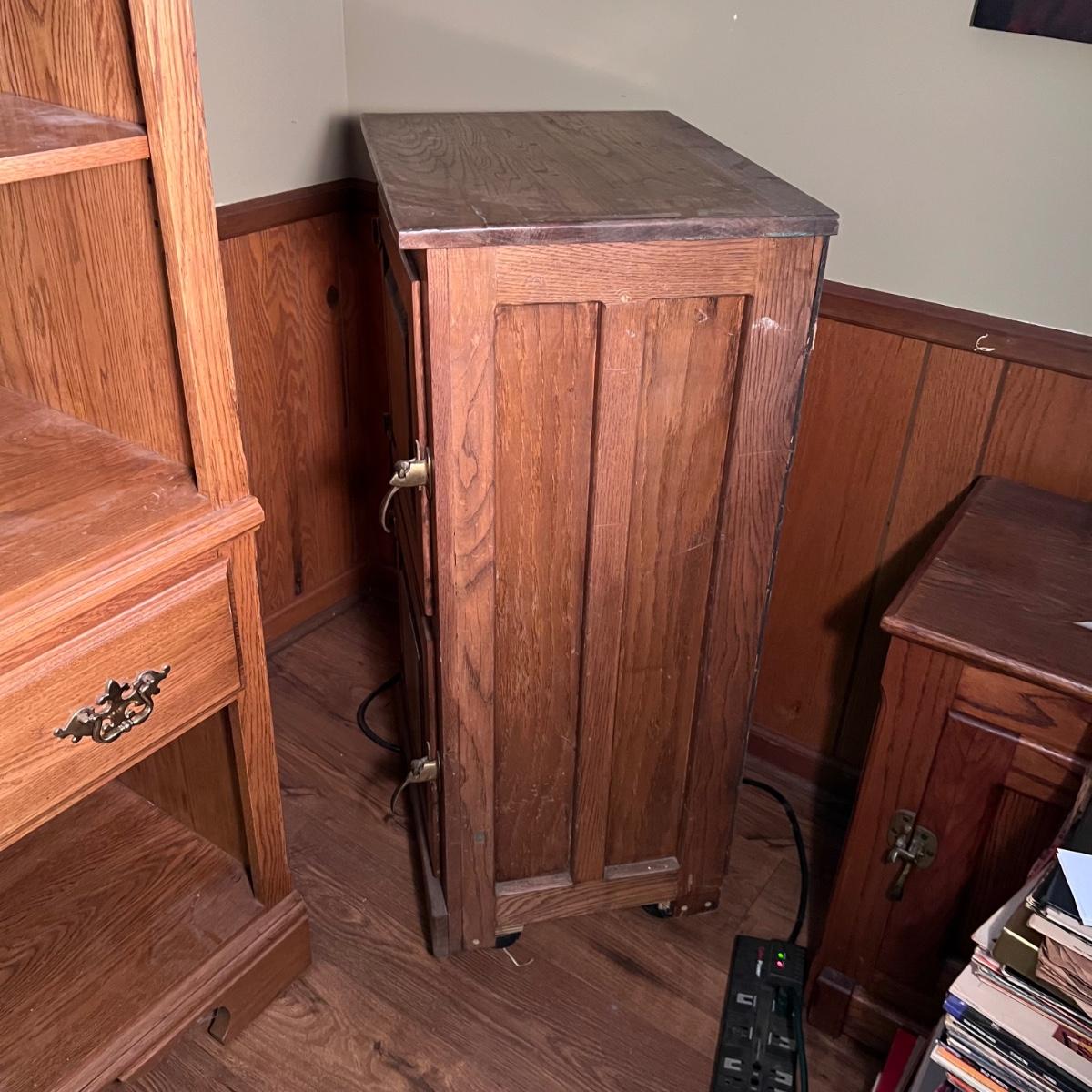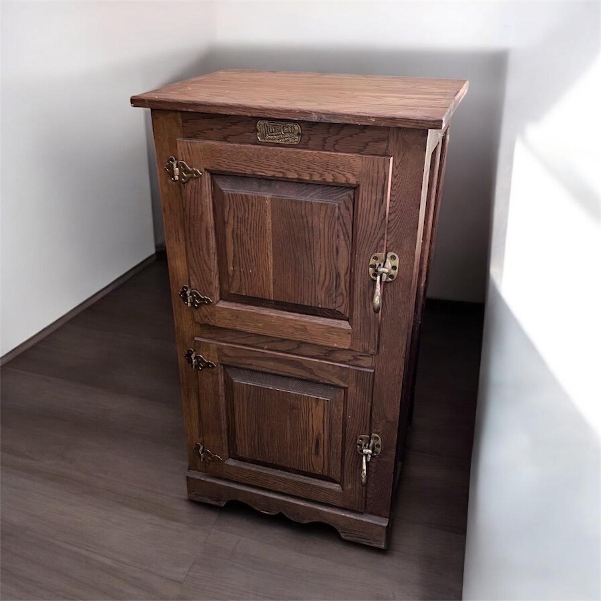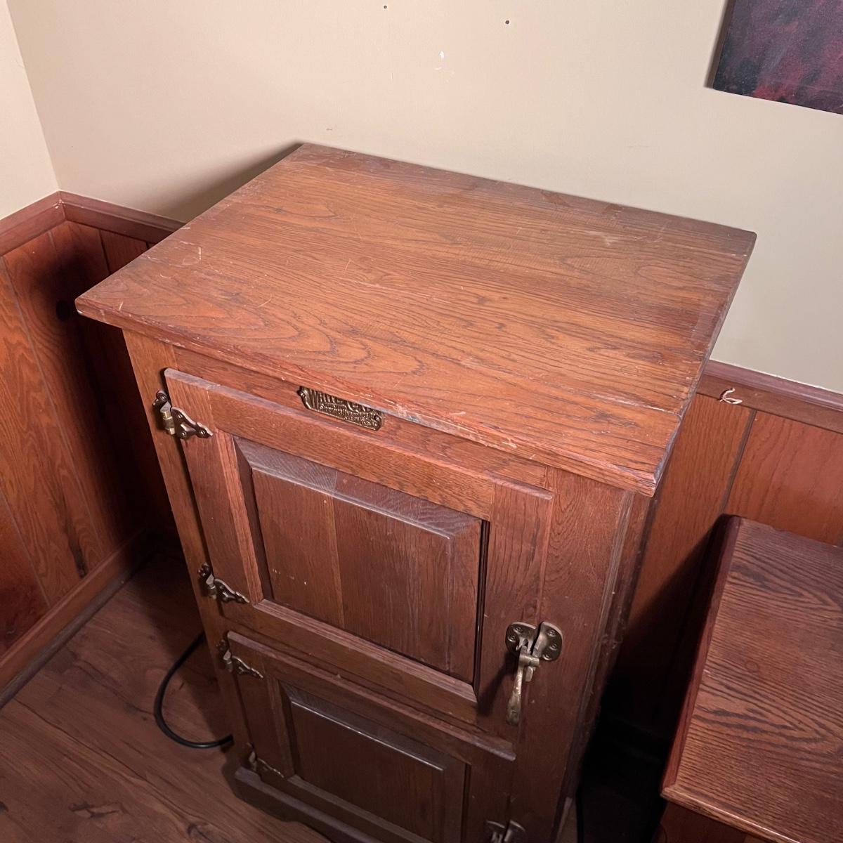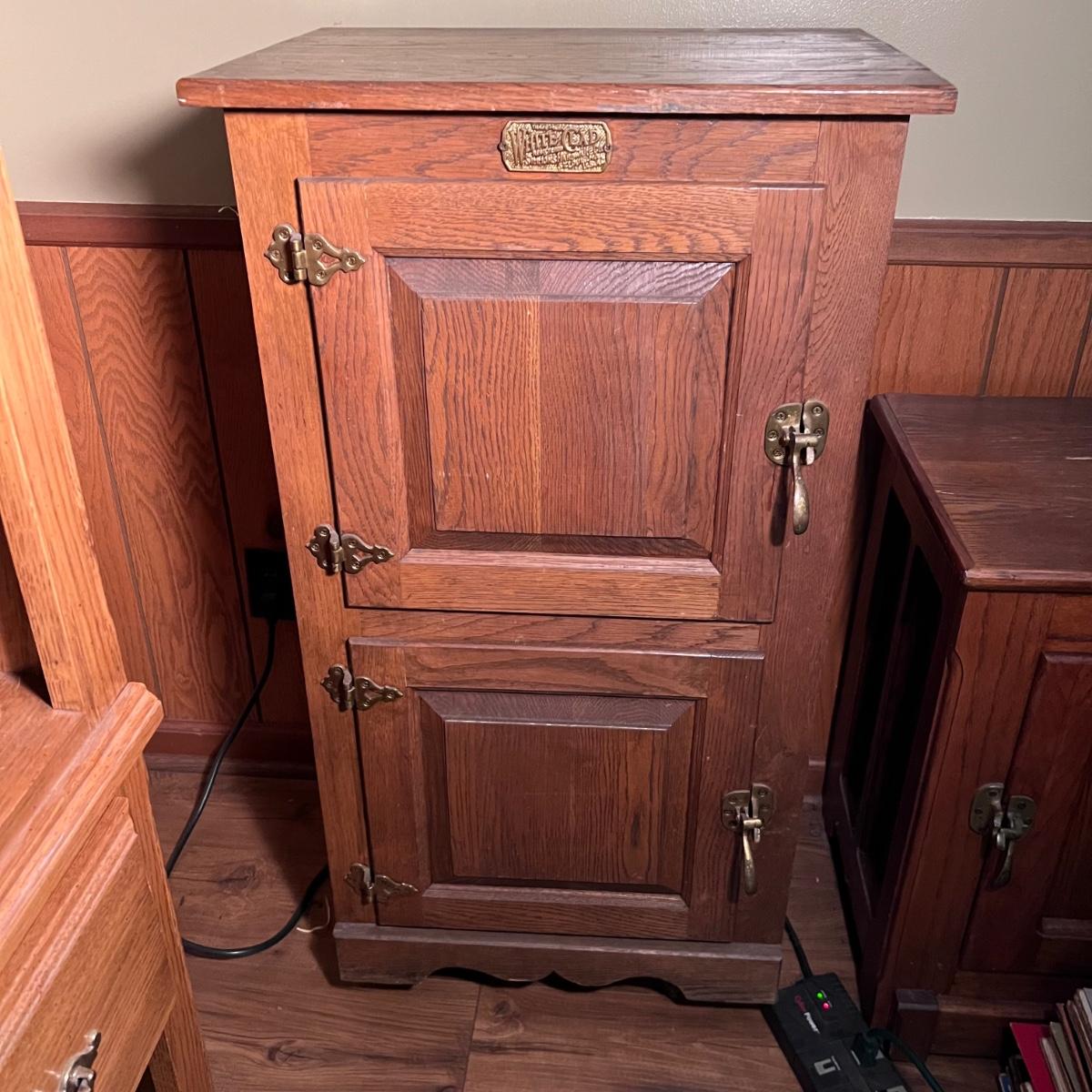 This ice box style piece is fairly lightweight and appears to be solid oak and has plastic casters. Hardware is brass.