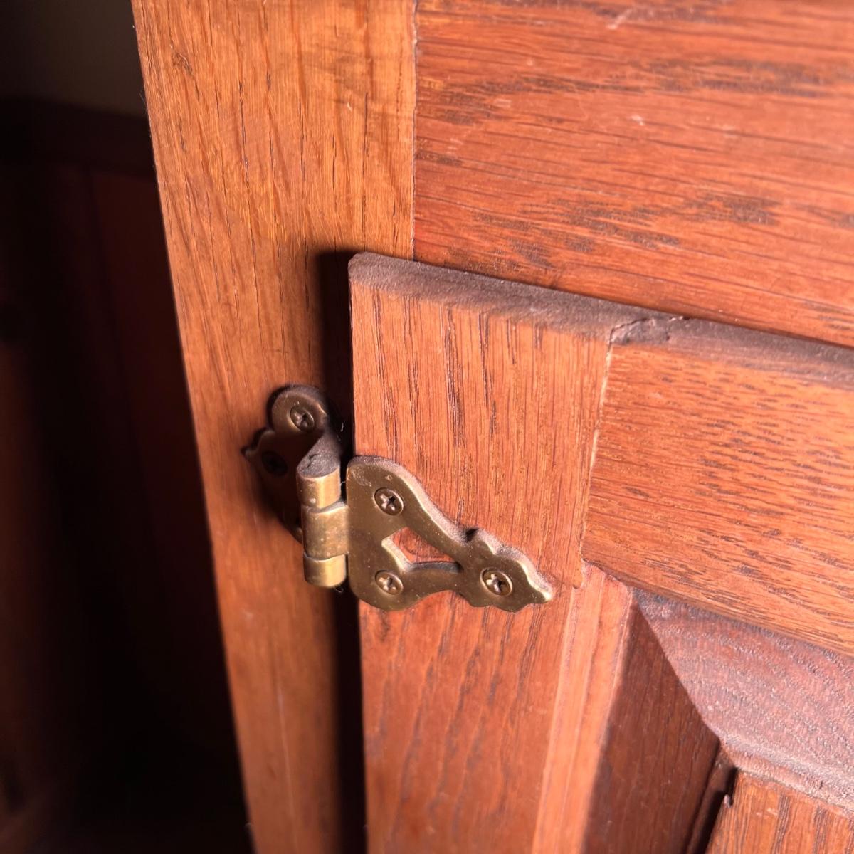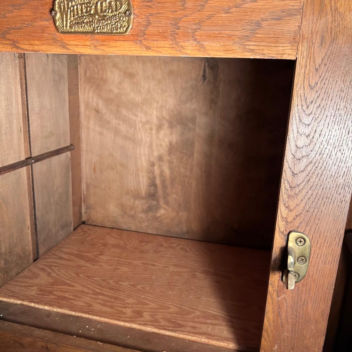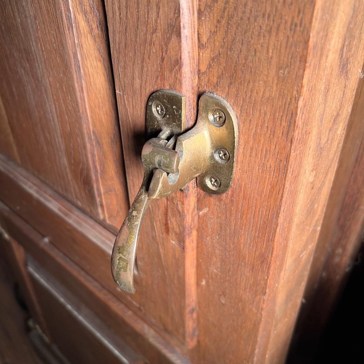 This ice box style piece is fairly lightweight and appears to be solid oak and has plastic casters. Hardware is brass.