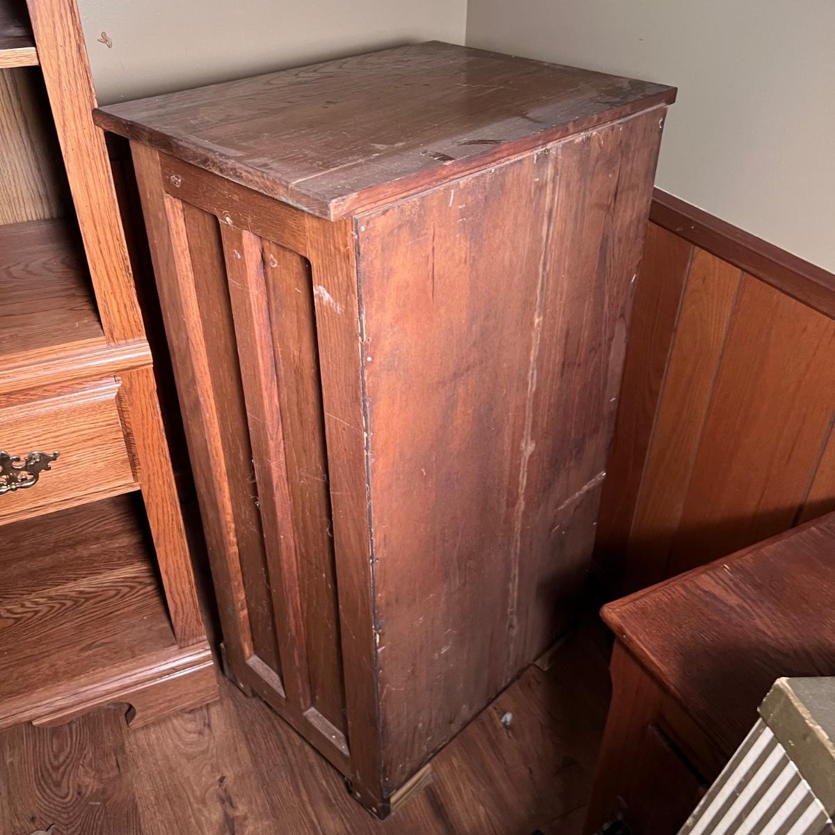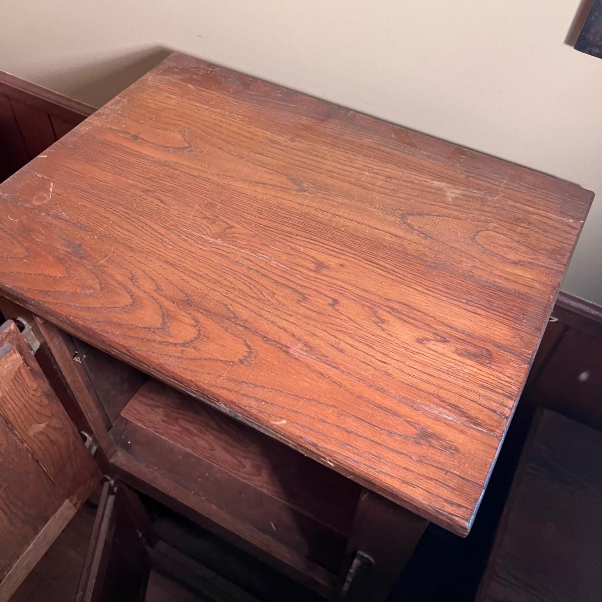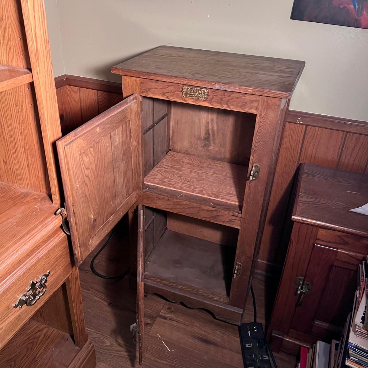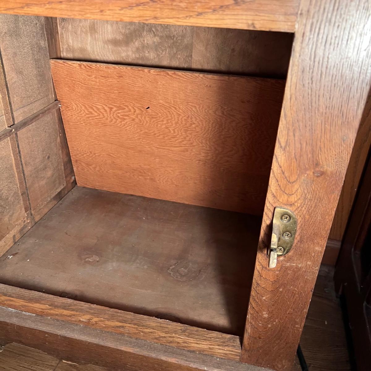 This ice box style piece is fairly lightweight and appears to be solid oak and has plastic casters. Hardware is brass.