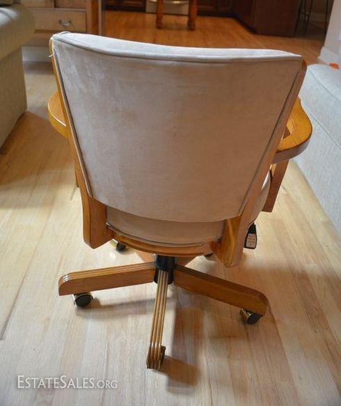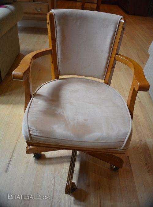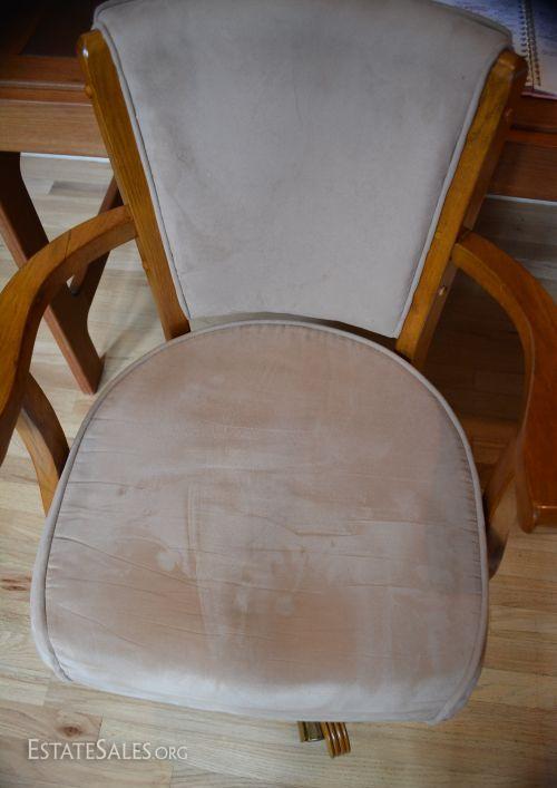 Office chair has an oak frame and arms along with a padded back and seat cushion. Fabric has a couple of stains from use.