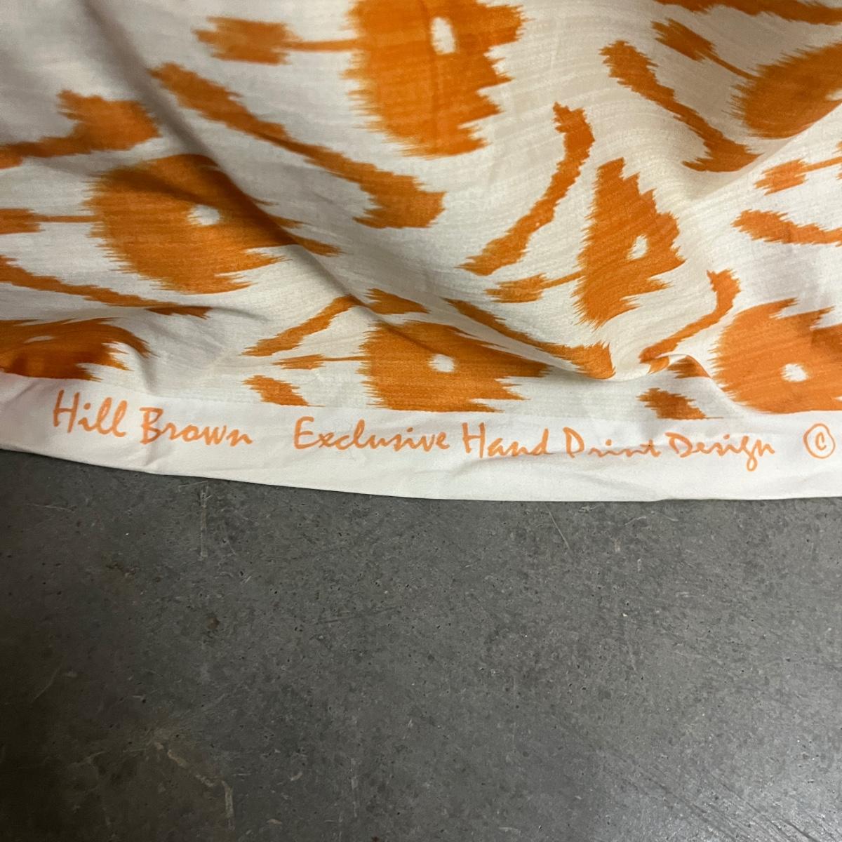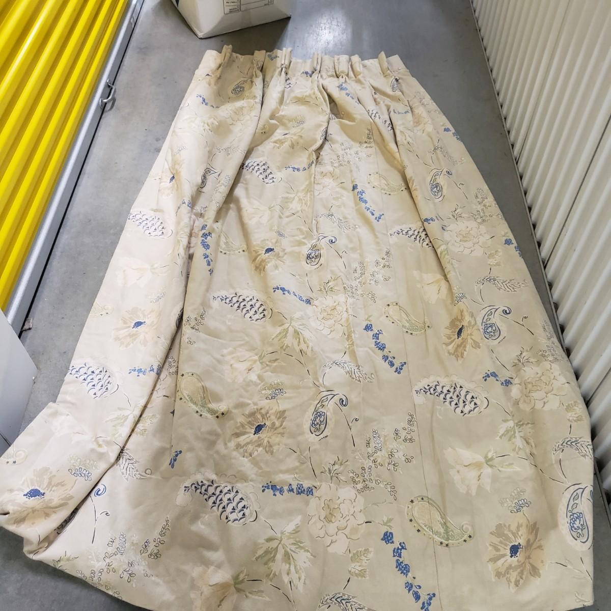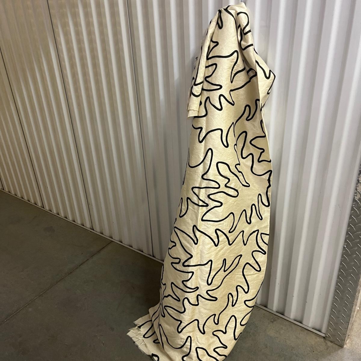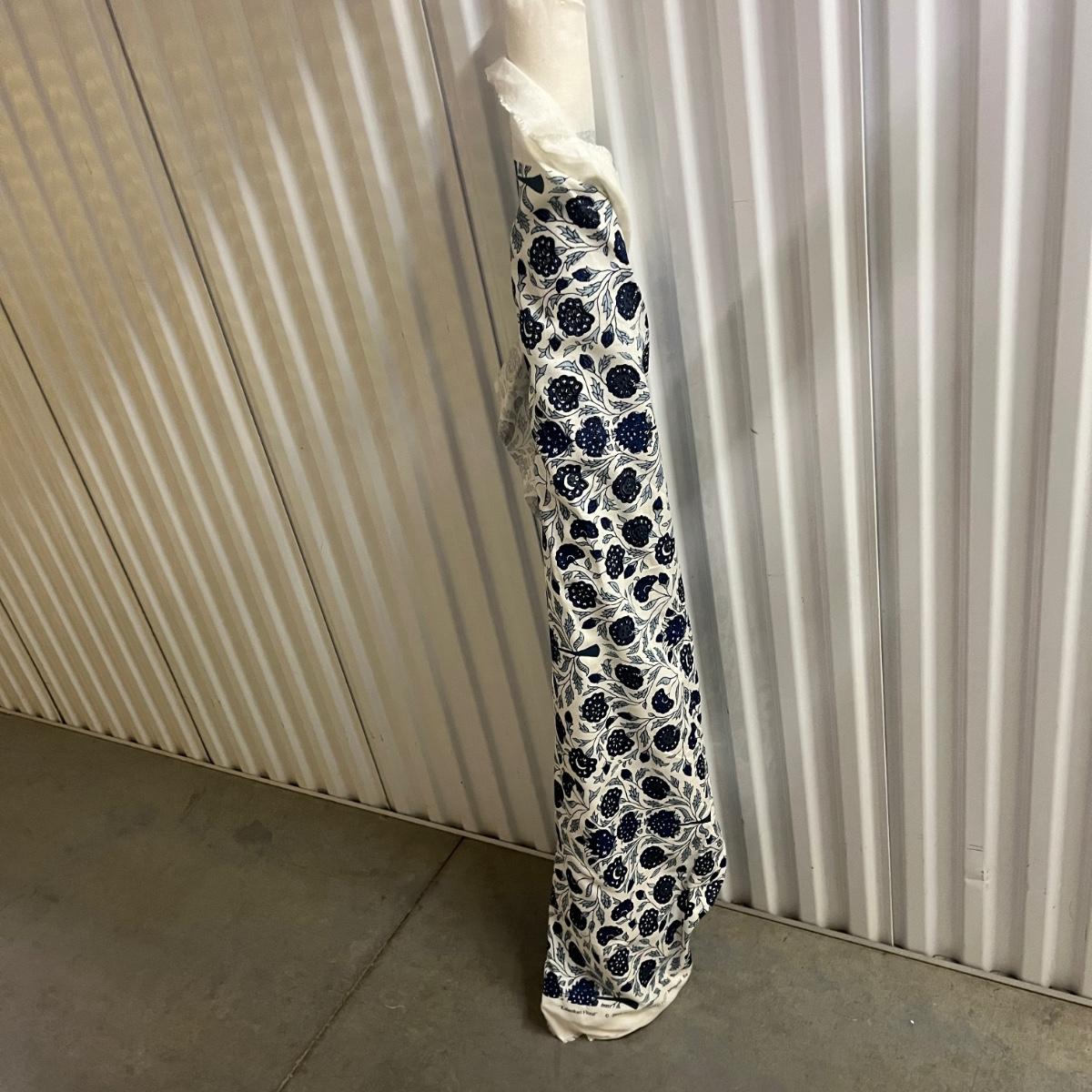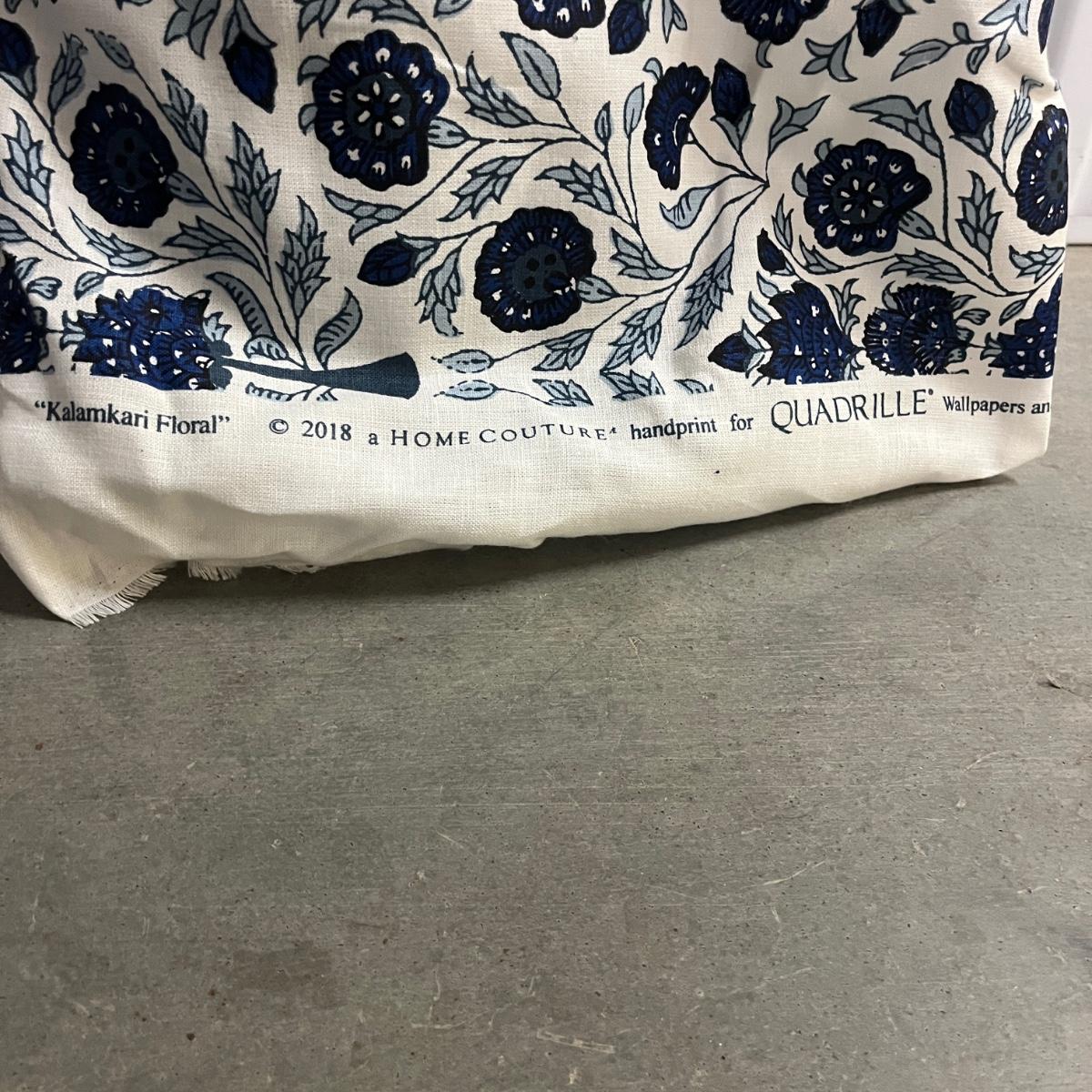 Lot includes a roll of Kalamkari Floral Home Couture handprint for Quadrille, a roll of Hill Brown exclusive hand print design, a piece marked double weight alpaca, a roll of blue and white striped fabric and a roll of white fabric Ana a small piece of fabric with a geometric design. Rolls are between 58” and 60”H. Also included are two heavy, lined drapes that measure 34" x 83"H each. The patterned drape has a wool liner as well as a sheer liner.