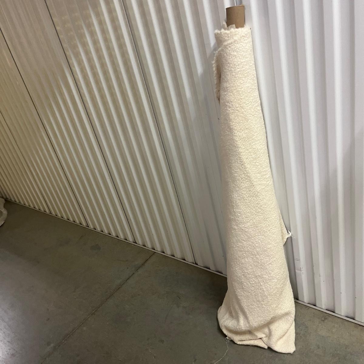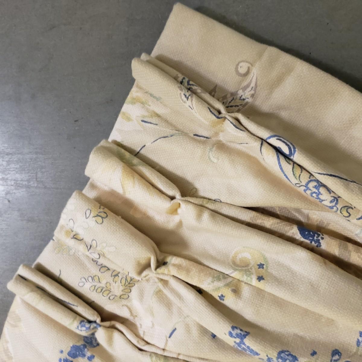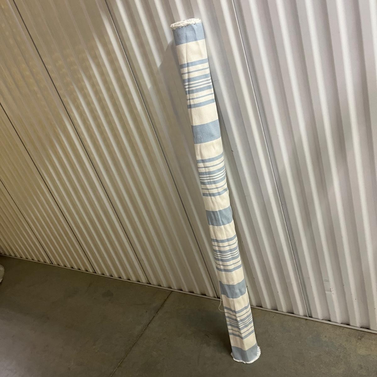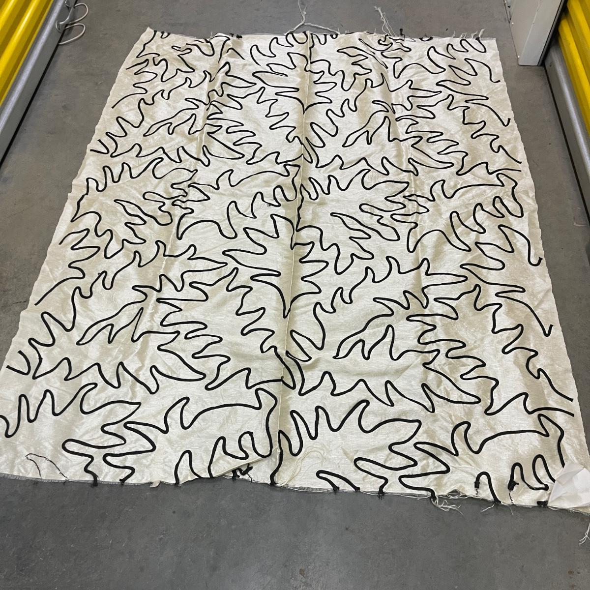 Lot includes a roll of Kalamkari Floral Home Couture handprint for Quadrille, a roll of Hill Brown exclusive hand print design, a piece marked double weight alpaca, a roll of blue and white striped fabric and a roll of white fabric Ana a small piece of fabric with a geometric design. Rolls are between 58” and 60”H. Also included are two heavy, lined drapes that measure 34" x 83"H each. The patterned drape has a wool liner as well as a sheer liner.