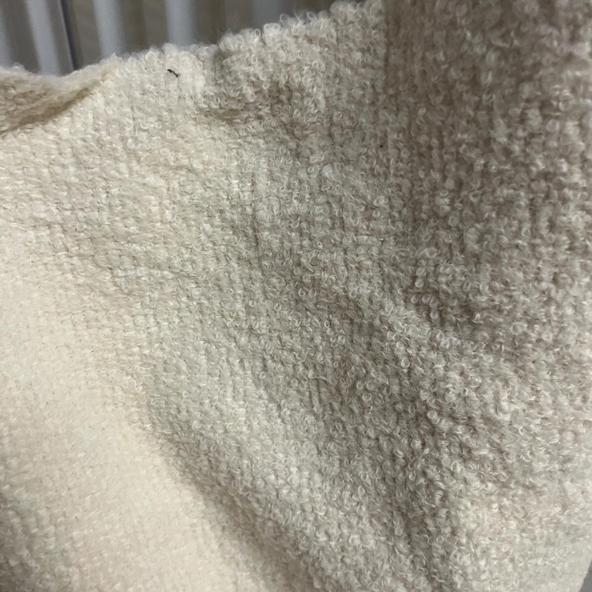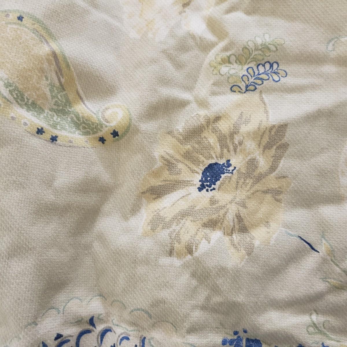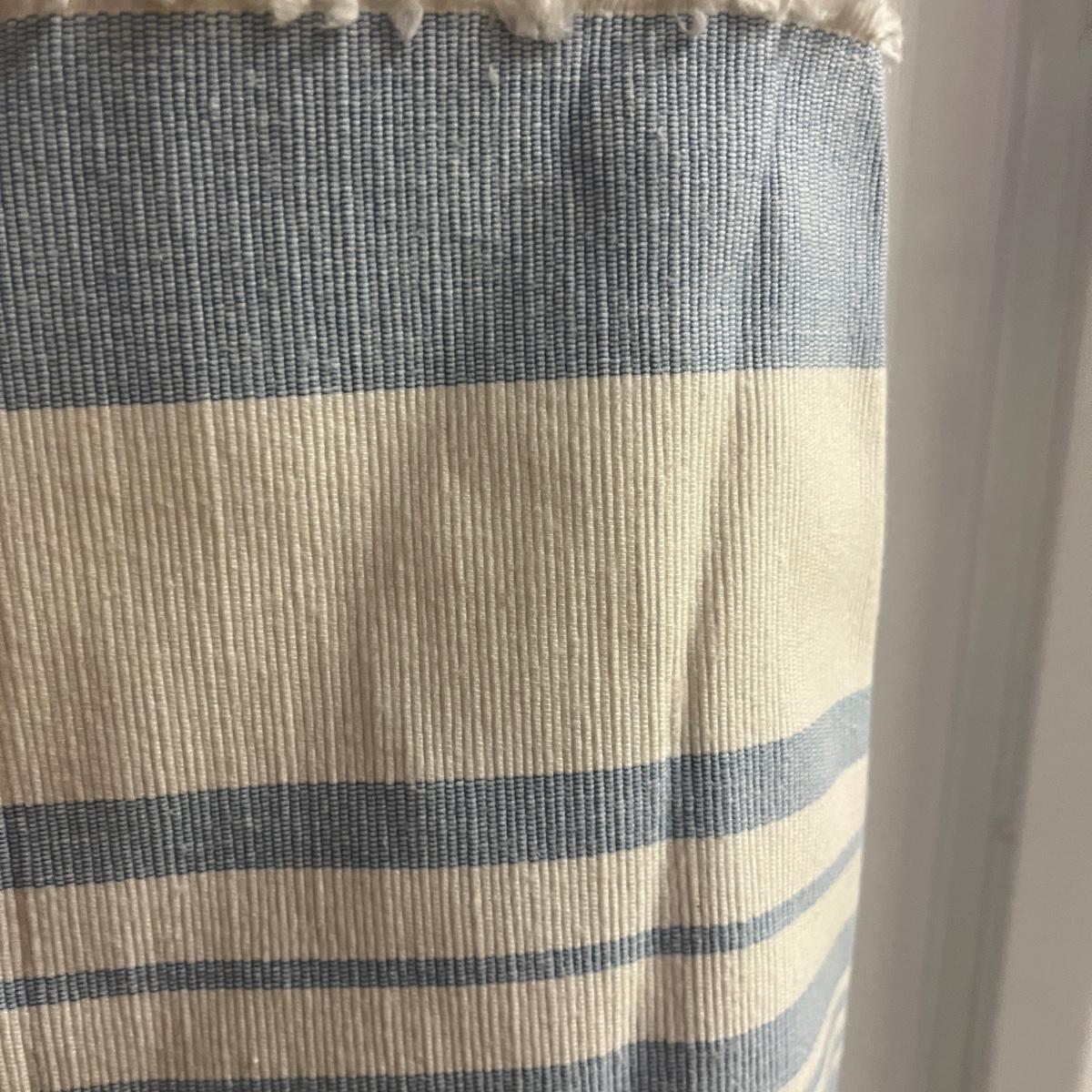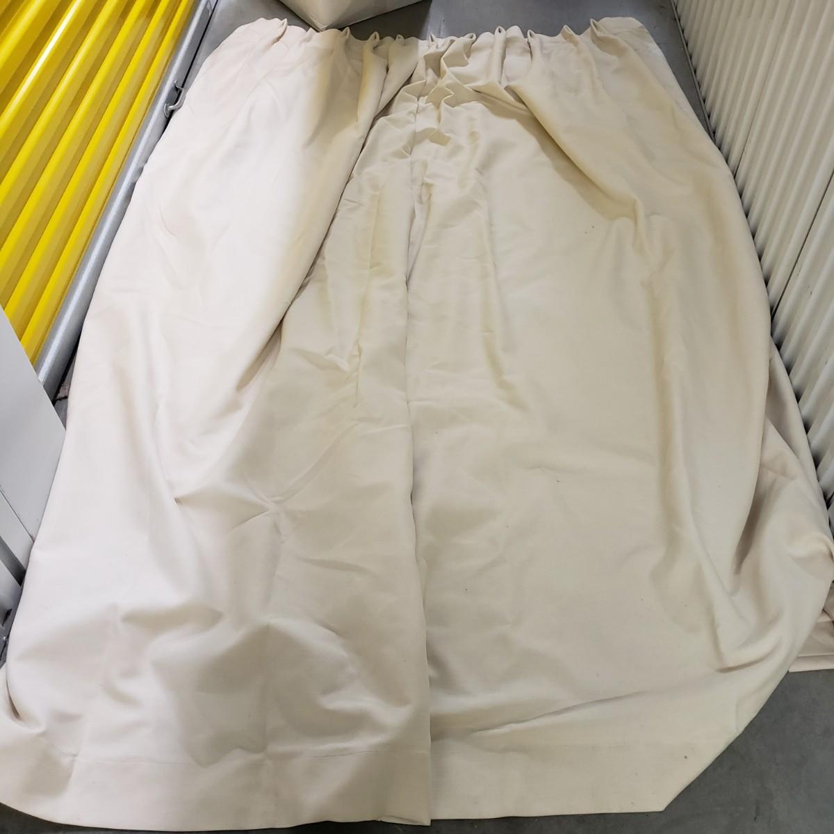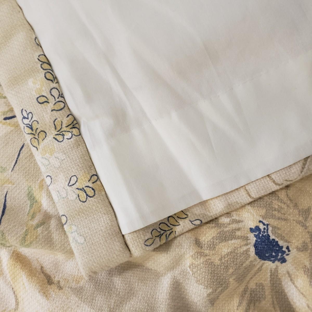 Lot includes a roll of Kalamkari Floral Home Couture handprint for Quadrille, a roll of Hill Brown exclusive hand print design, a piece marked double weight alpaca, a roll of blue and white striped fabric and a roll of white fabric Ana a small piece of fabric with a geometric design. Rolls are between 58” and 60”H. Also included are two heavy, lined drapes that measure 34" x 83"H each. The patterned drape has a wool liner as well as a sheer liner.
