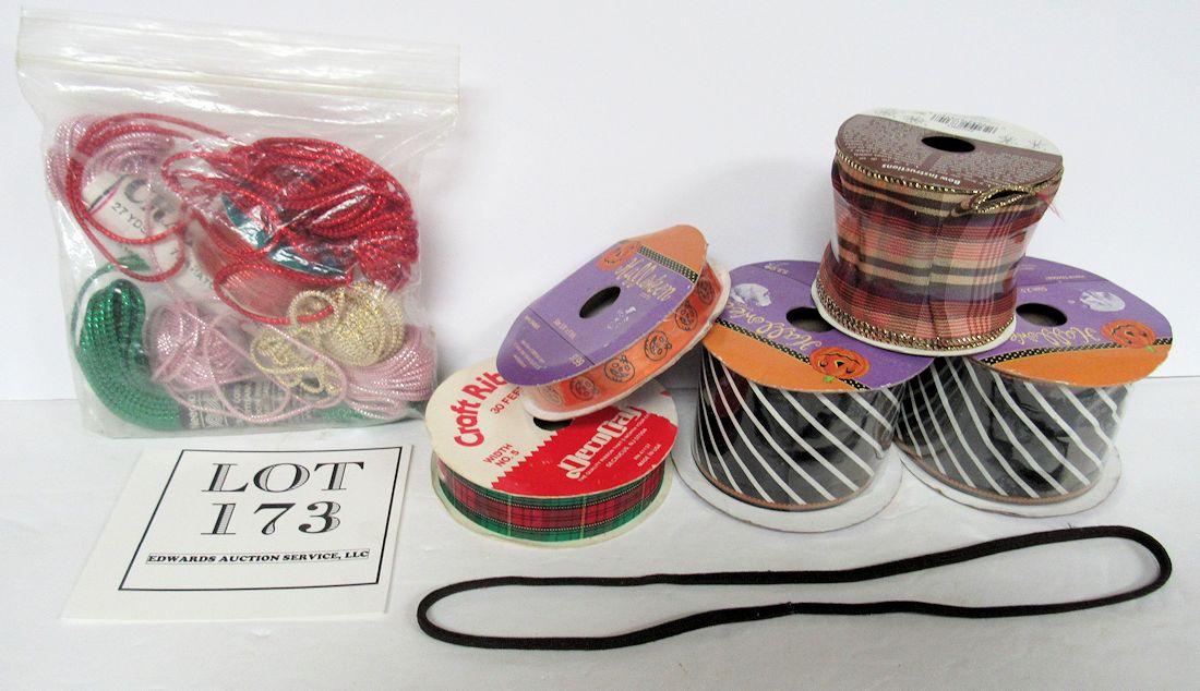 Most ribbon is unused in pack. Some cording is unused. There is a stretchy band also. Shipping is available at shipping cost plus $5.00 handling fee on up to 6 lots, $10.00 handling fee on 7 or more lots or two boxes. $15.00 handling fee on 3 boxes. Helps cover shipping materials and labor cost.
