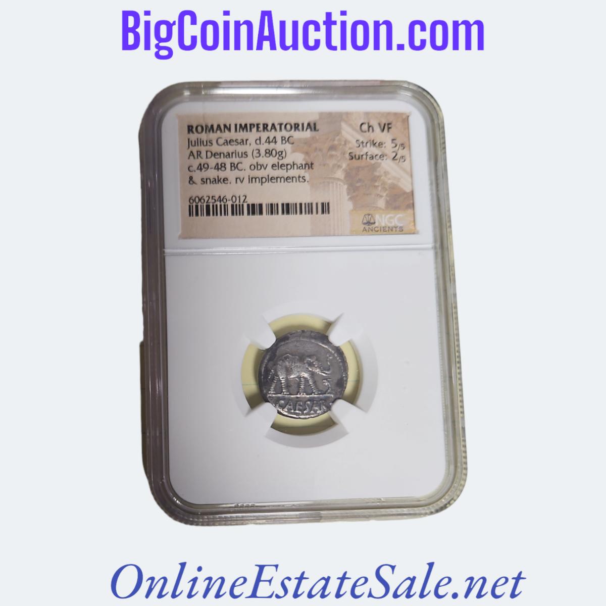 JULIUS CAESAR AR DENARIUS (3.80g) OBV ELEPHANT & SNAKE RV IMPLEMENTS
