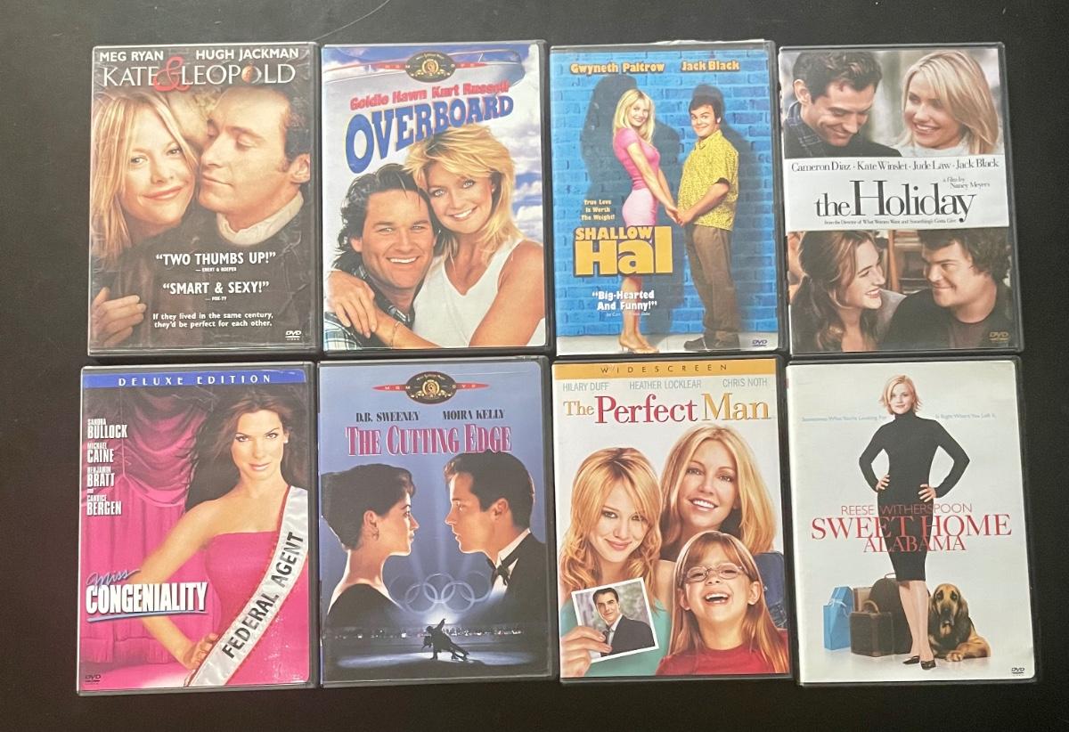 Lot includes 8 movies. Titles include: Kate and Leopold, The Holiday, The Perfect Man, Miss Congeniality, Overboard, and more.