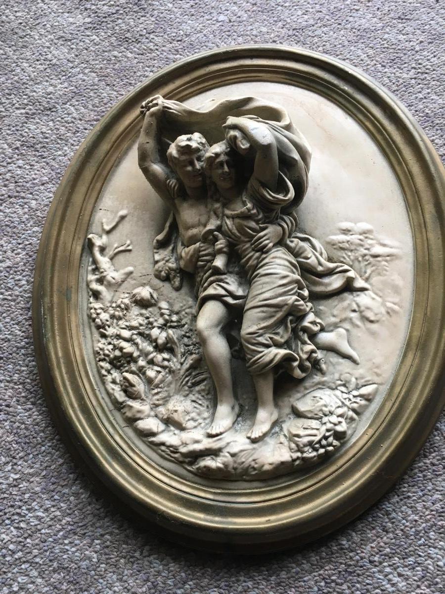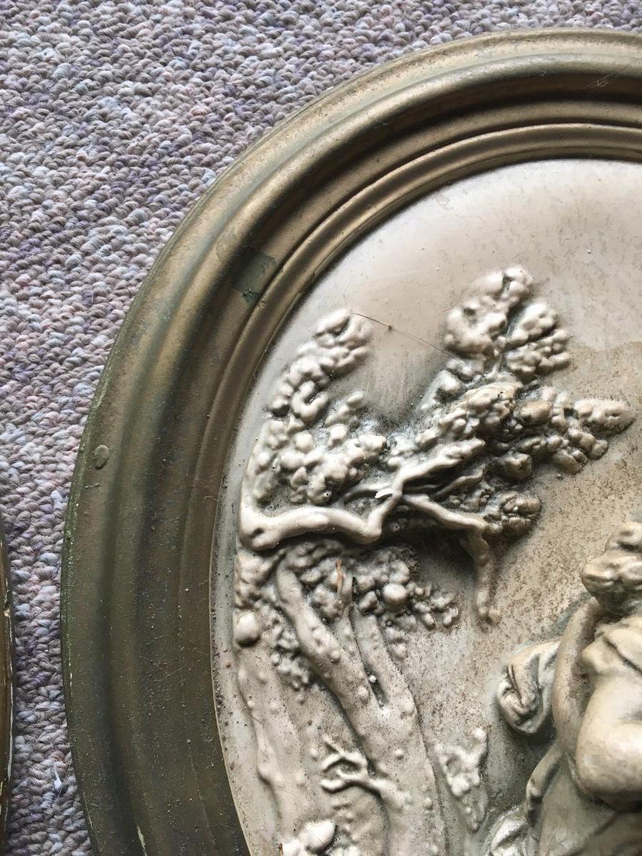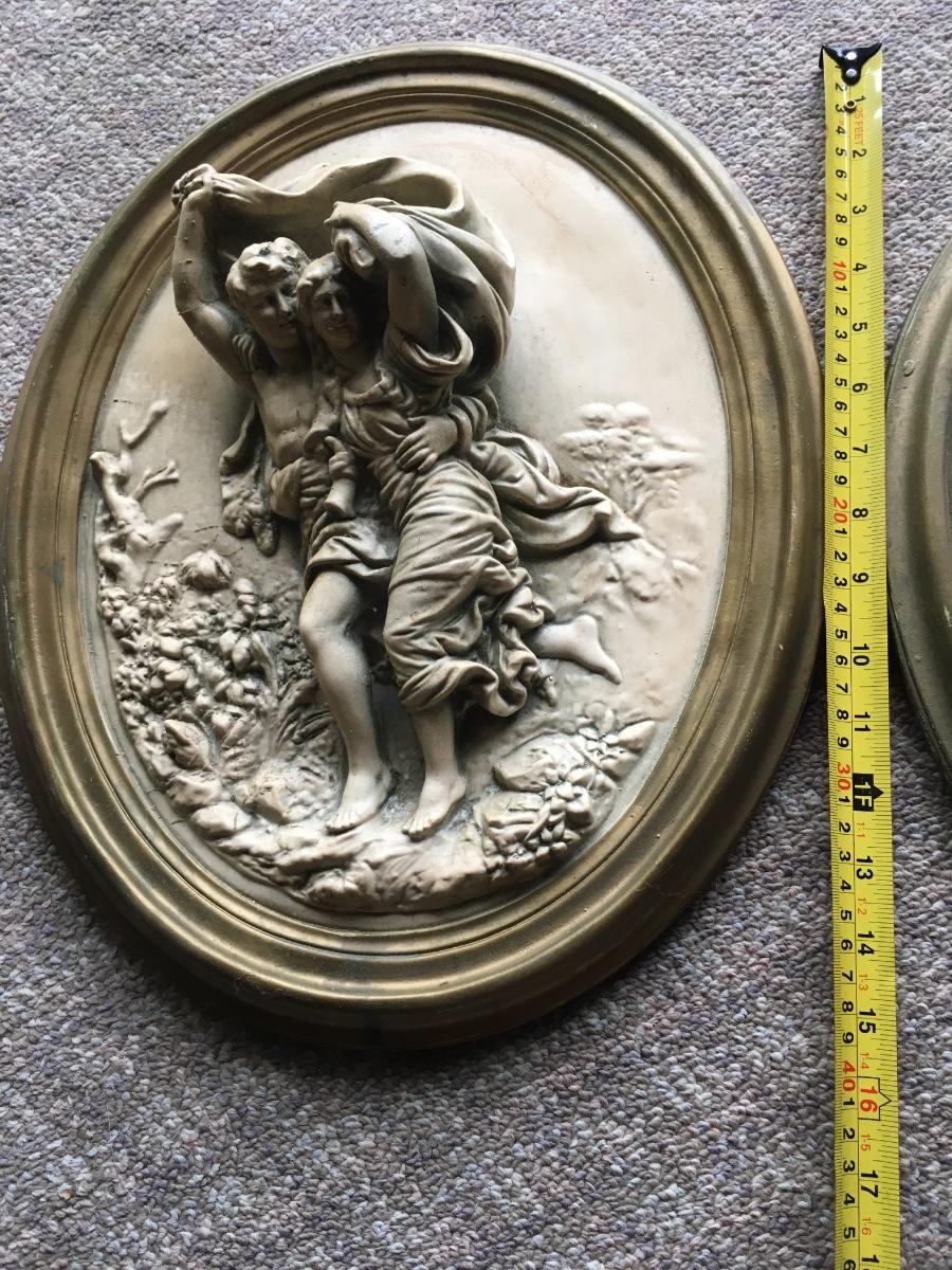 Pair of vintage chalkware wall plaques with distintive scenes. Some slight damageon one a shown in photo.