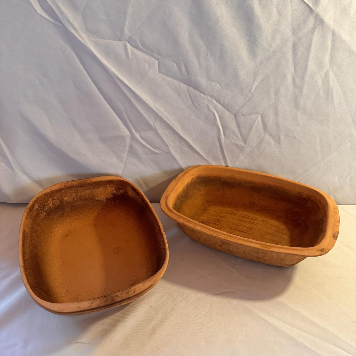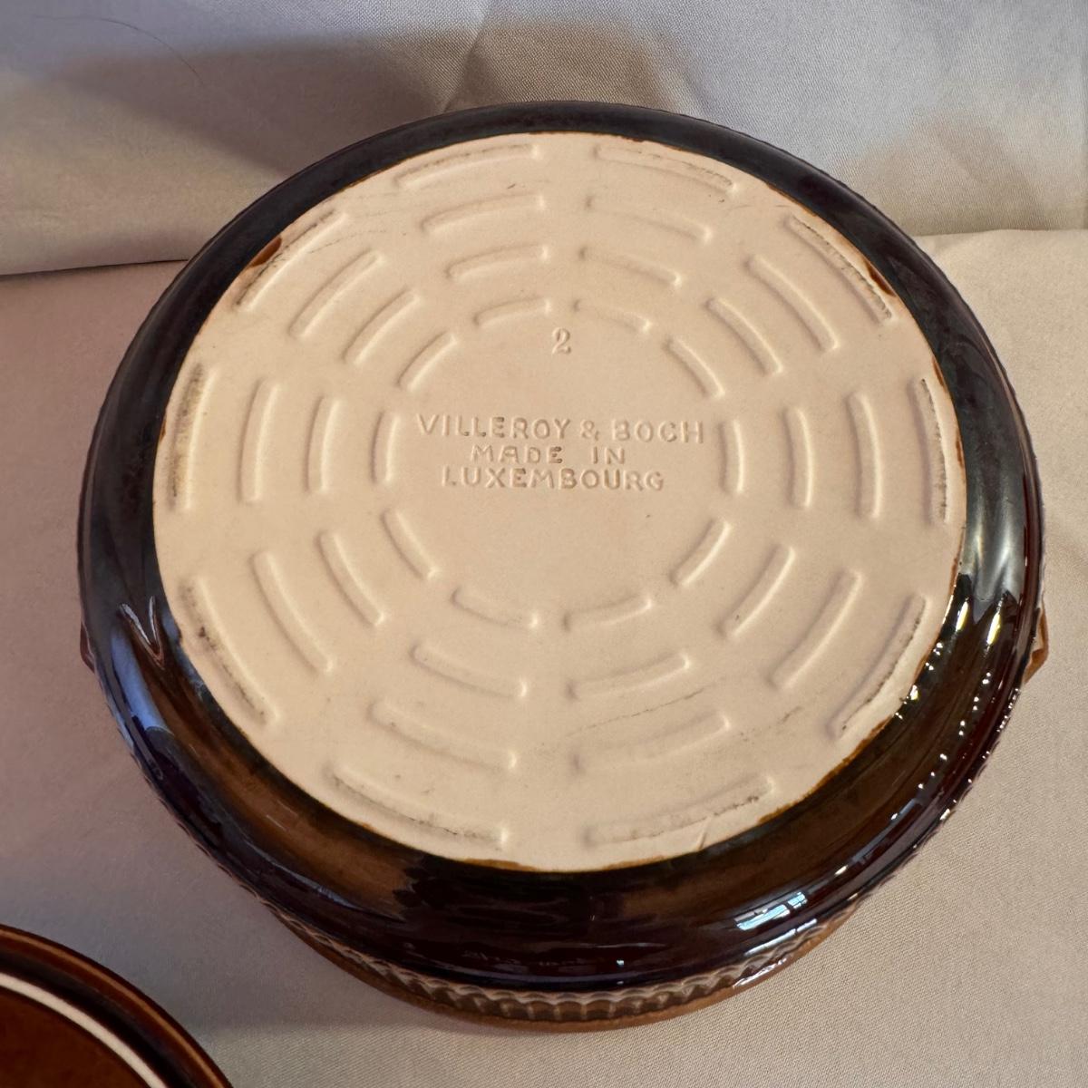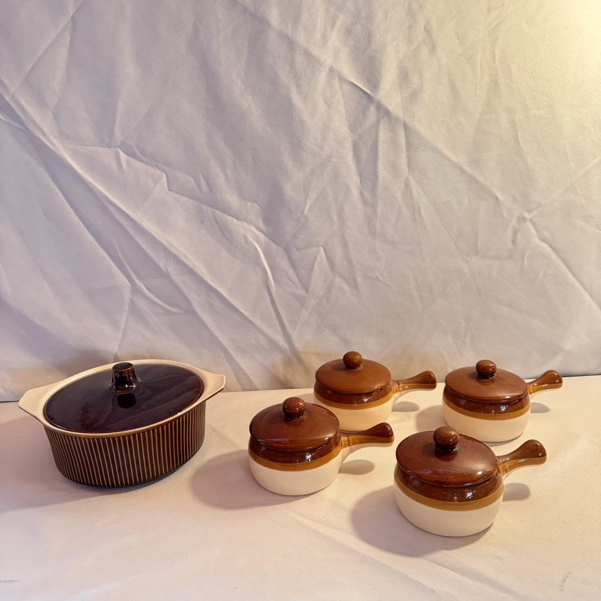 This lot includes one Romertopf terracotta clay cooking dish, one larger Romertopf terracotta clay cooking dish, one “The Complete Guide to Claypot Cooking” by Bridget Jones, one ceramic Villeroy & Boch baking dish and lid, and four ceramic french onion soup crocks. The largest Romertopf measures 15” x 9” x 8”H. Shipping available.