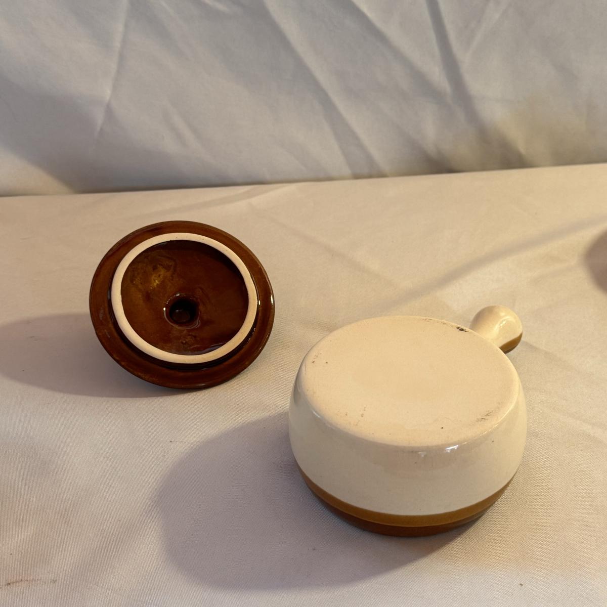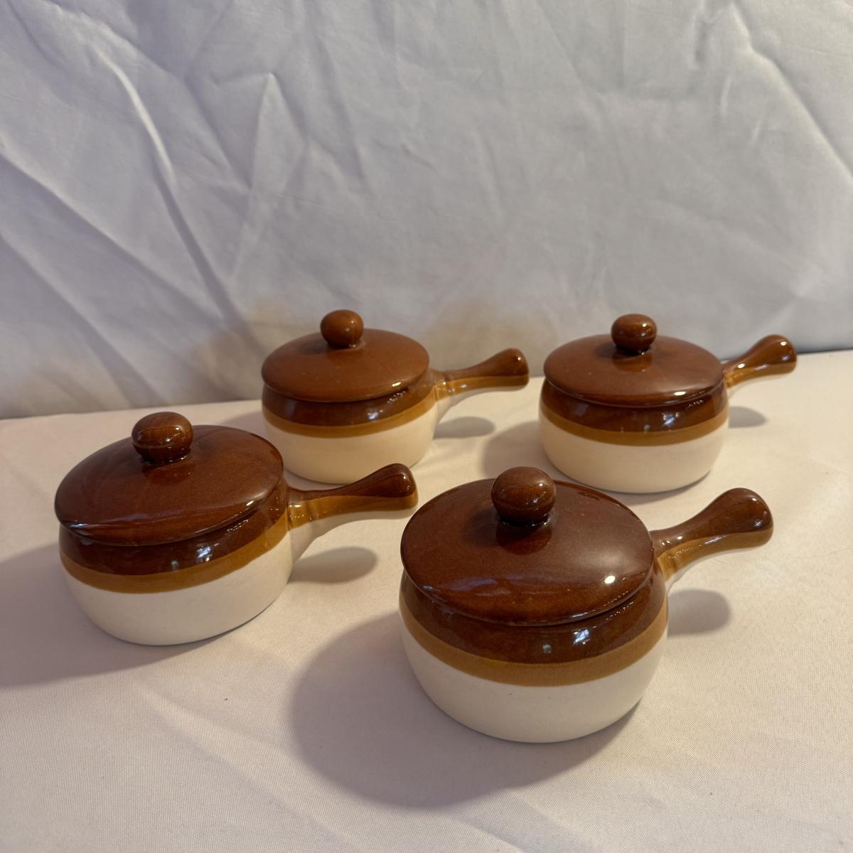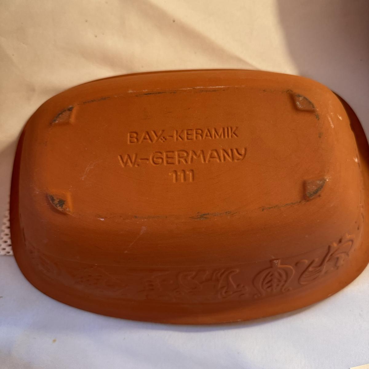 This lot includes one Romertopf terracotta clay cooking dish, one larger Romertopf terracotta clay cooking dish, one “The Complete Guide to Claypot Cooking” by Bridget Jones, one ceramic Villeroy & Boch baking dish and lid, and four ceramic french onion soup crocks. The largest Romertopf measures 15” x 9” x 8”H. Shipping available.