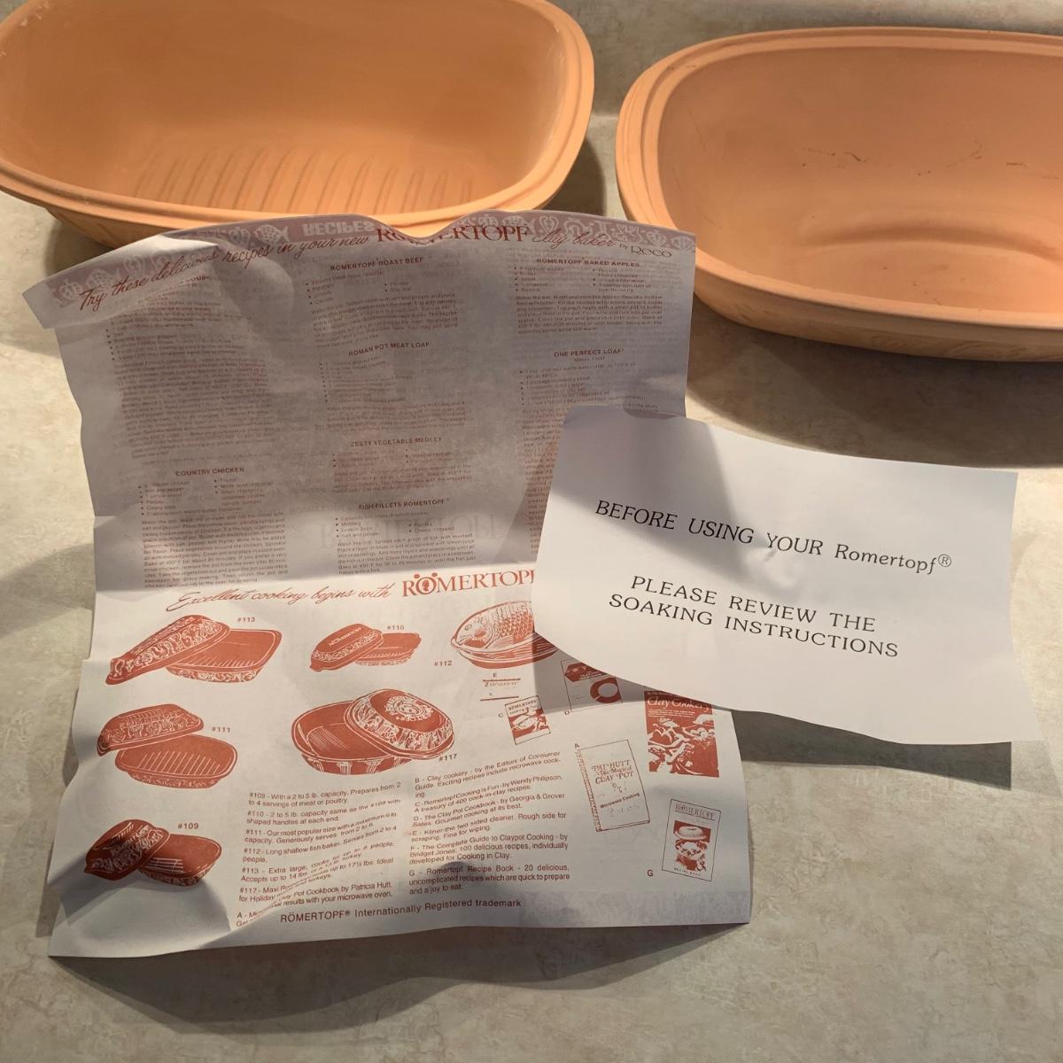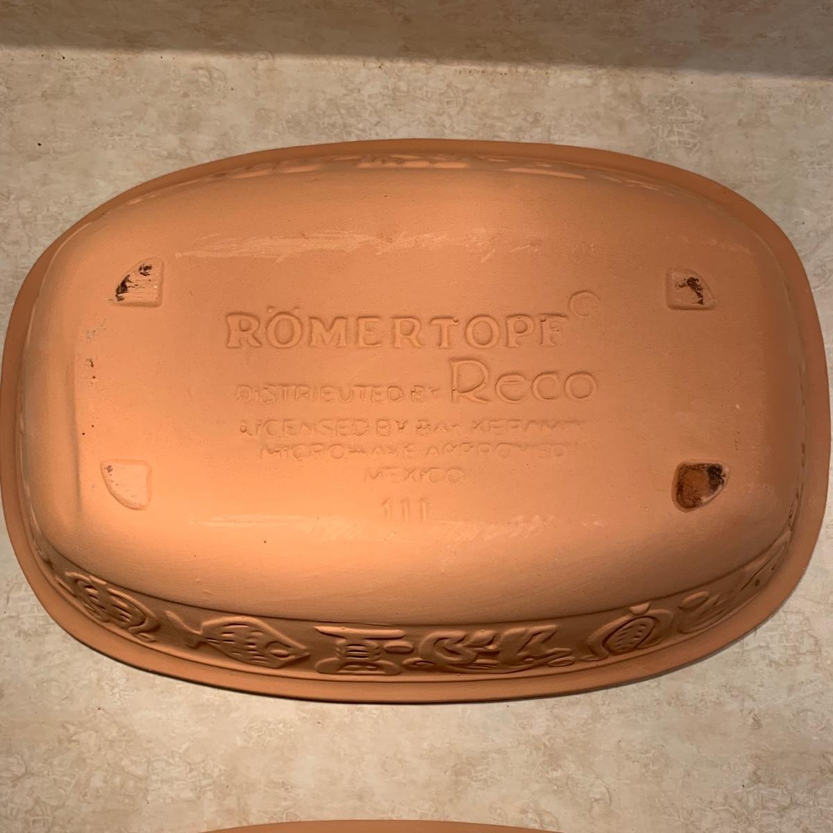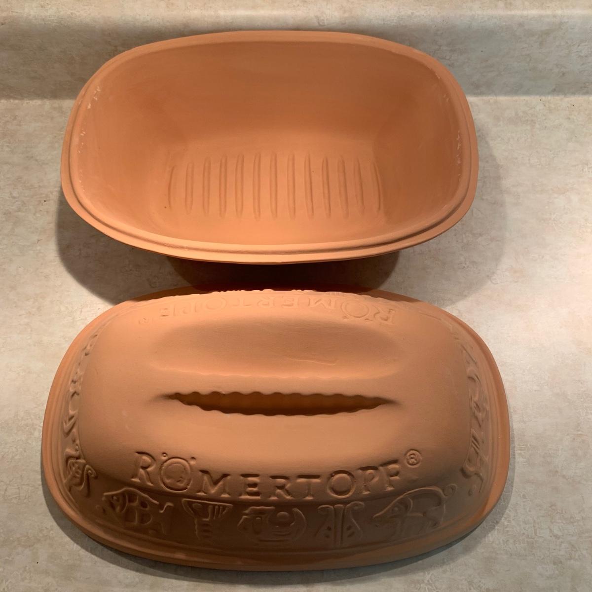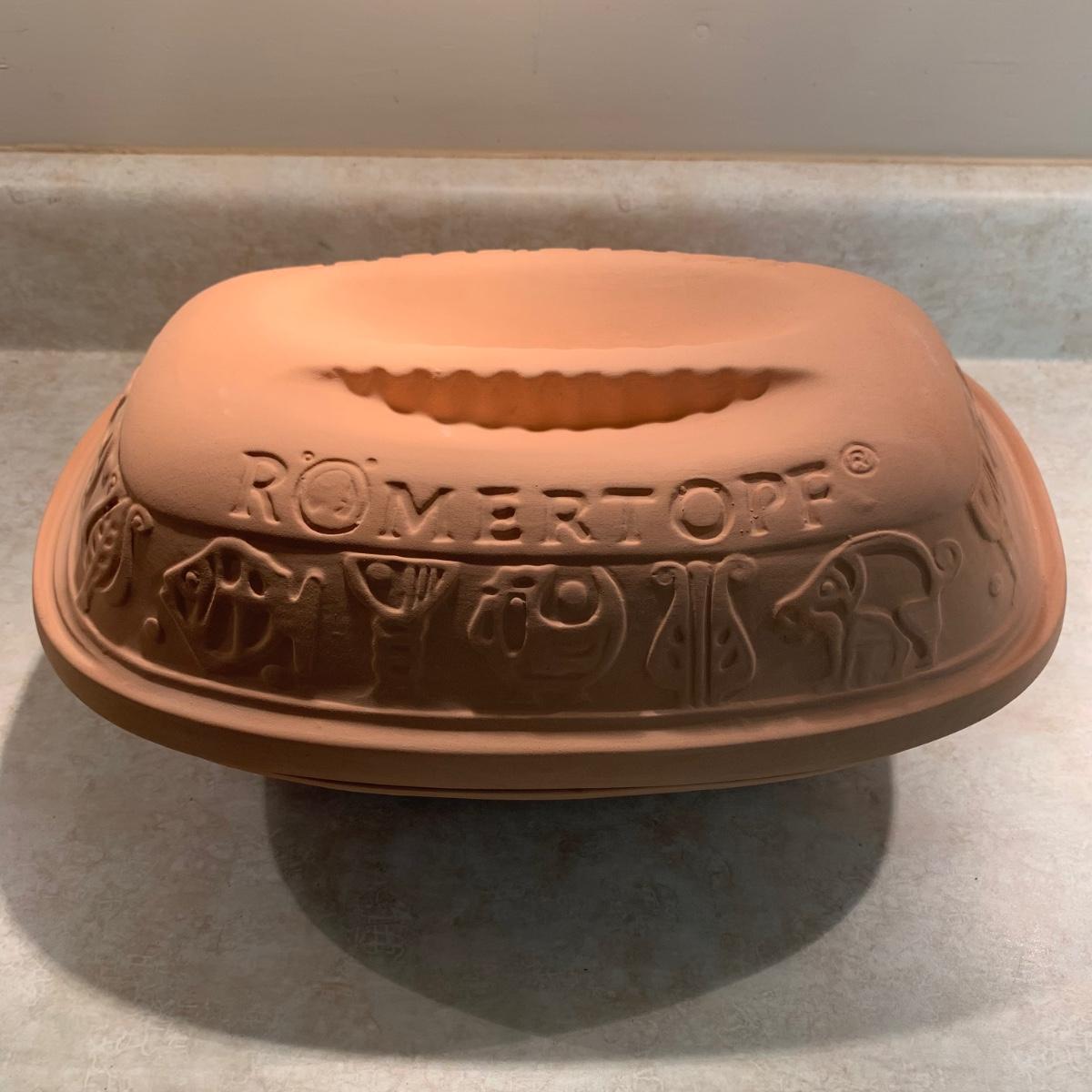 This Romertopf “original unglazed clay baker” appears to be unused. It is a solid clay baking dish with a lid. With the lid on, it measures approximately 14.5” x 10” x 7”. The baker comes with care instructions, use instructions, and some recipes. Shipping available.