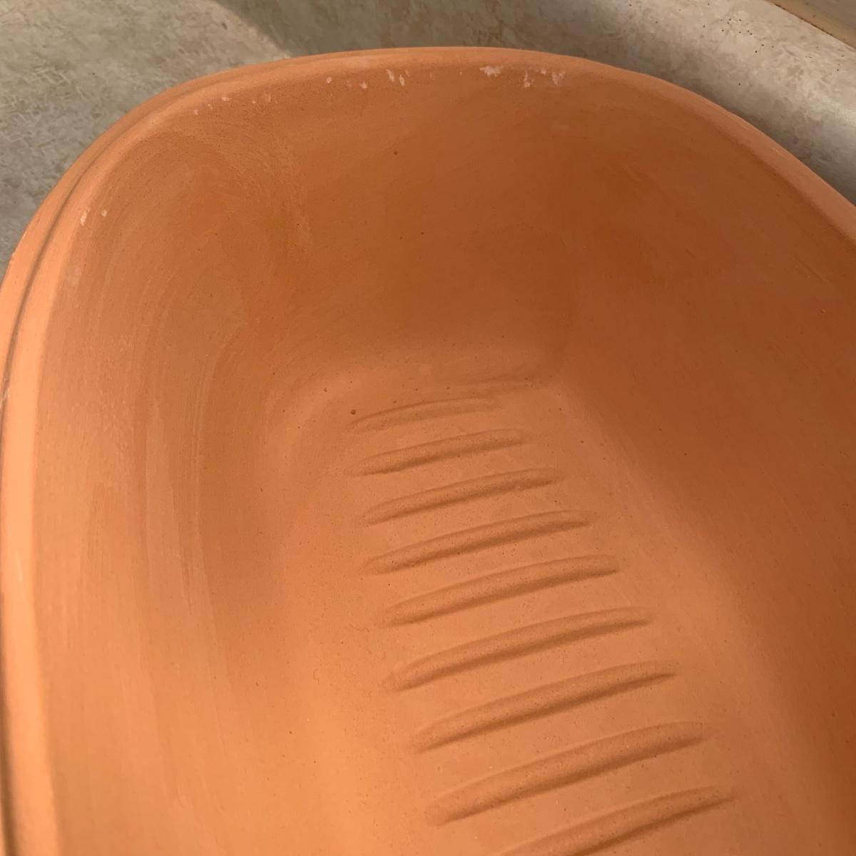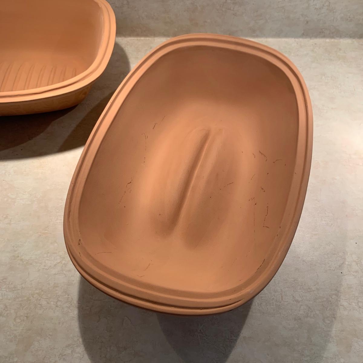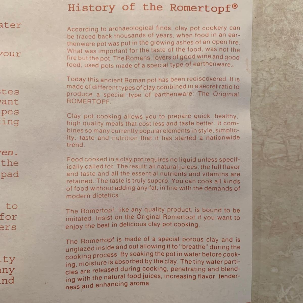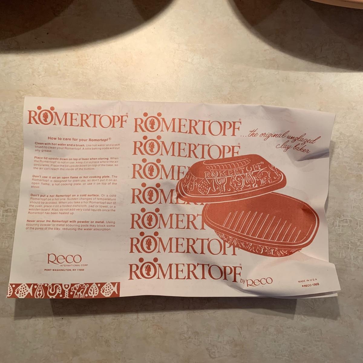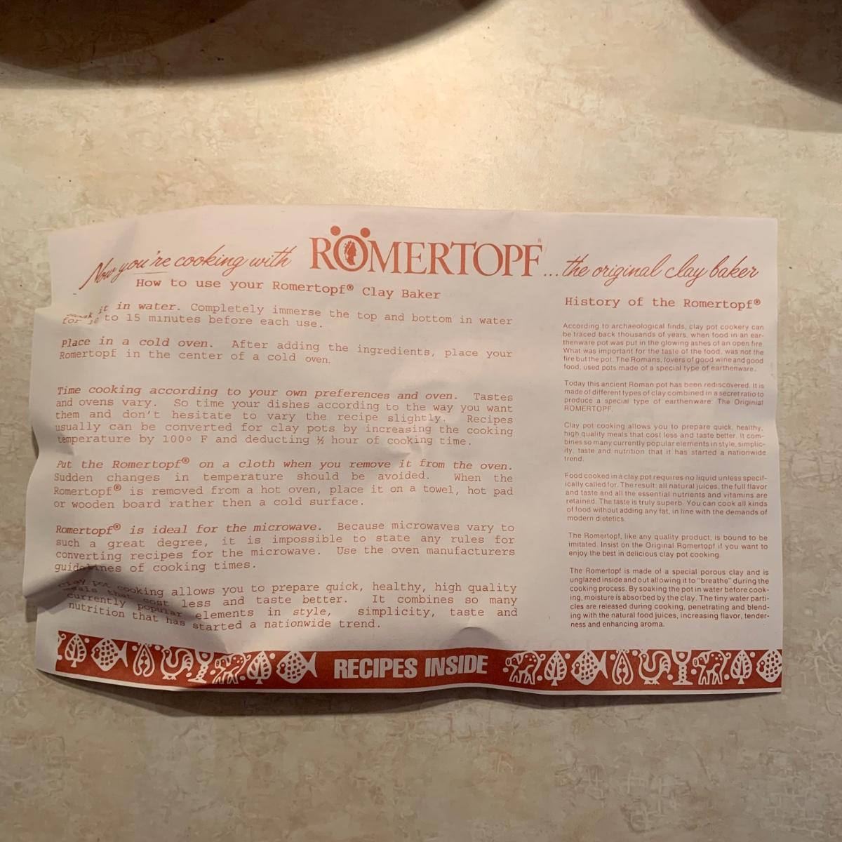 This Romertopf “original unglazed clay baker” appears to be unused. It is a solid clay baking dish with a lid. With the lid on, it measures approximately 14.5” x 10” x 7”. The baker comes with care instructions, use instructions, and some recipes. Shipping available.