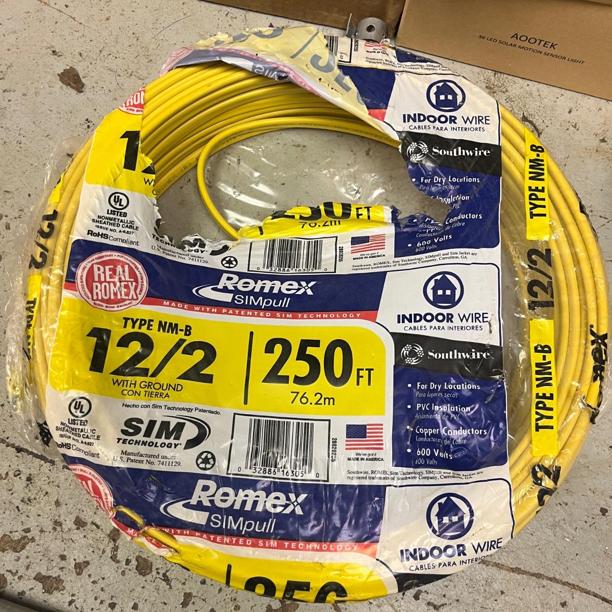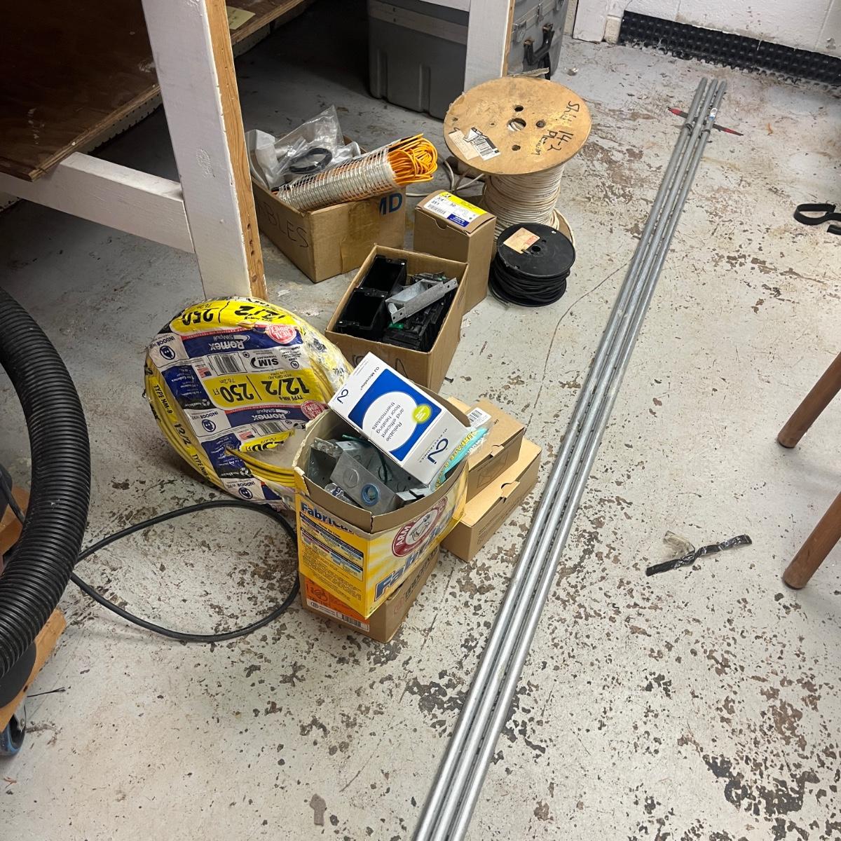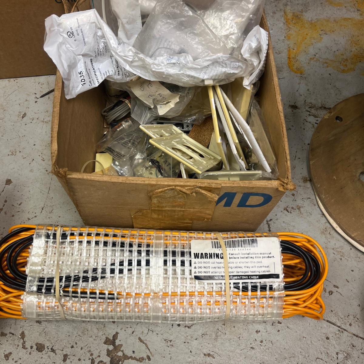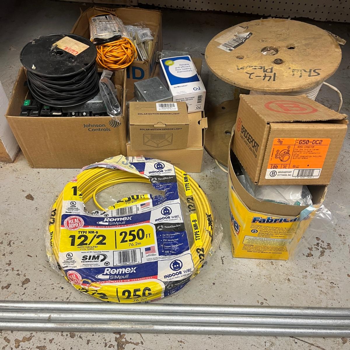 Lot includes a partial roll of 12/2 Romex, two rolls of wire, two solar motion sensor lights, three 10’ 1/2” EMT conduit, metal boxes, floor heating with thermostat and more.