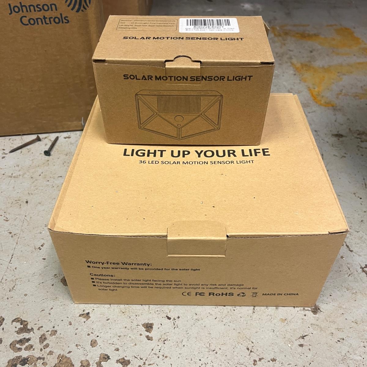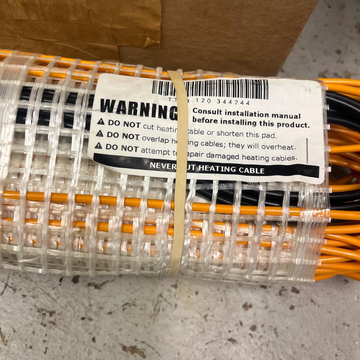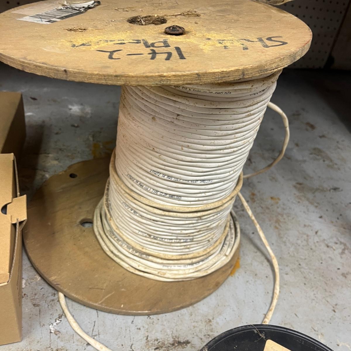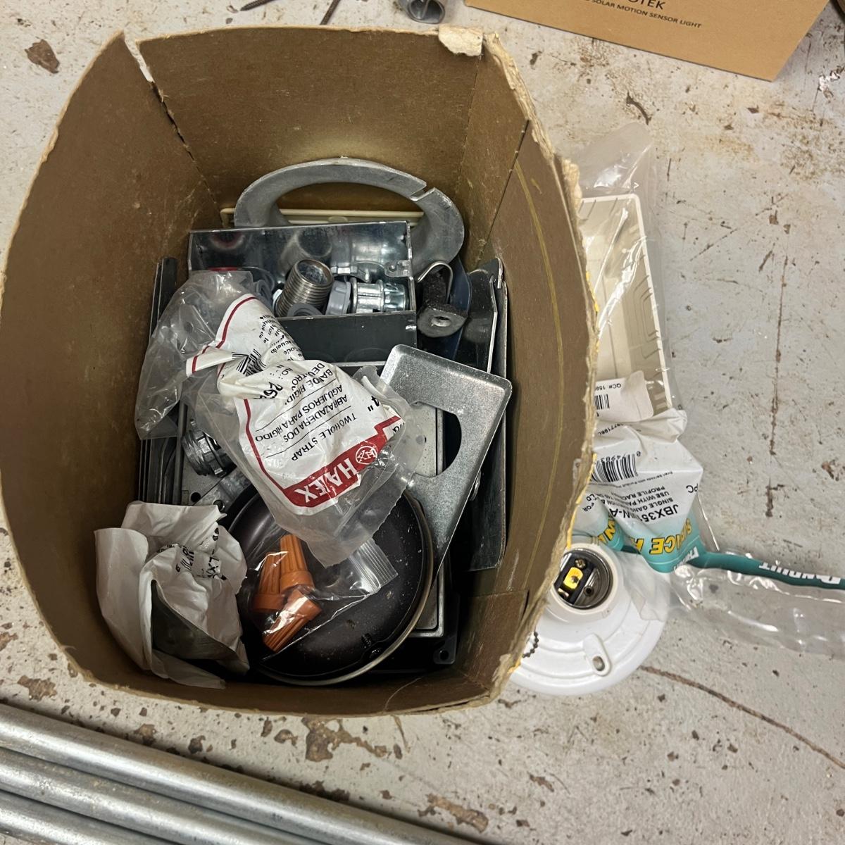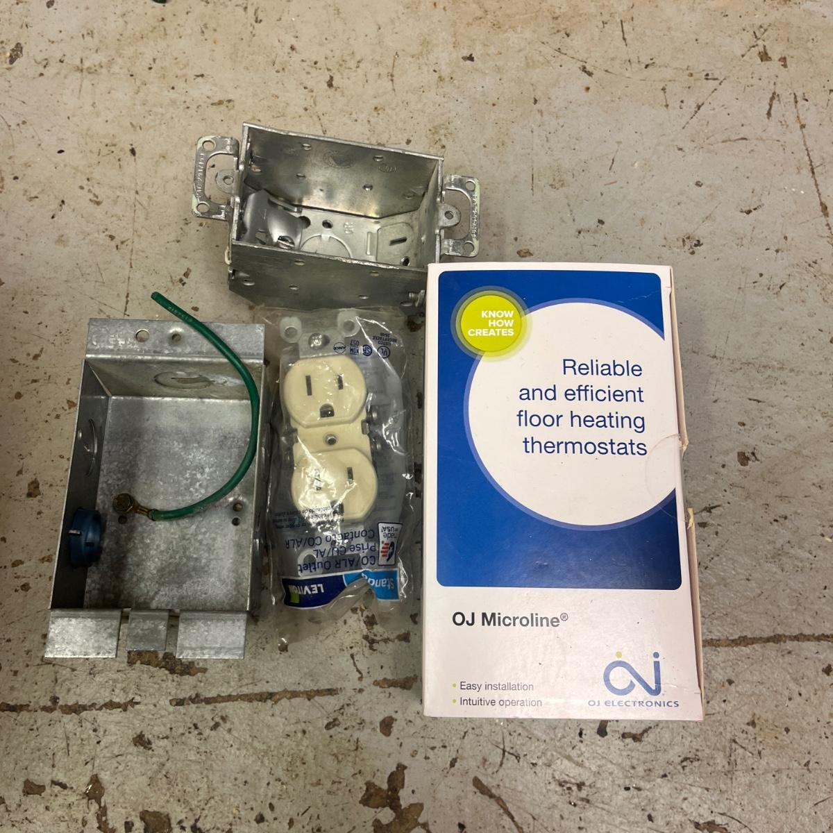 Lot includes a partial roll of 12/2 Romex, two rolls of wire, two solar motion sensor lights, three 10’ 1/2” EMT conduit, metal boxes, floor heating with thermostat and more.