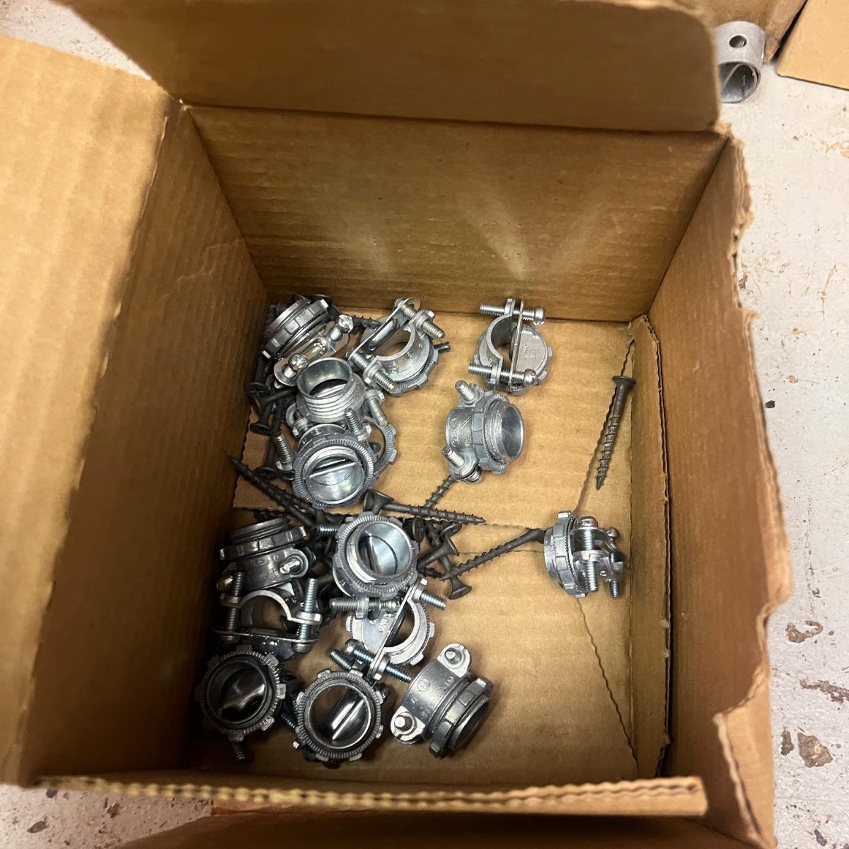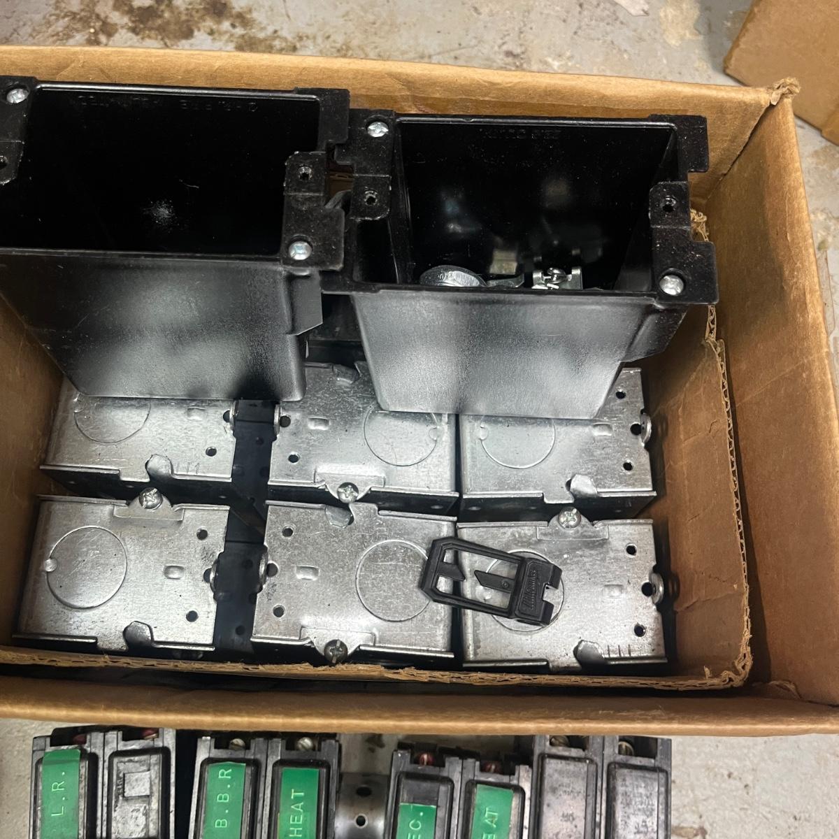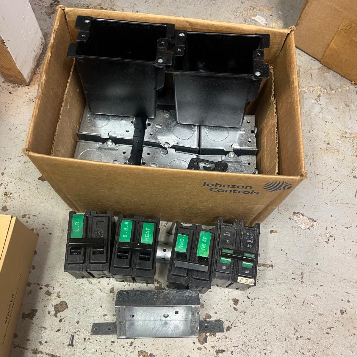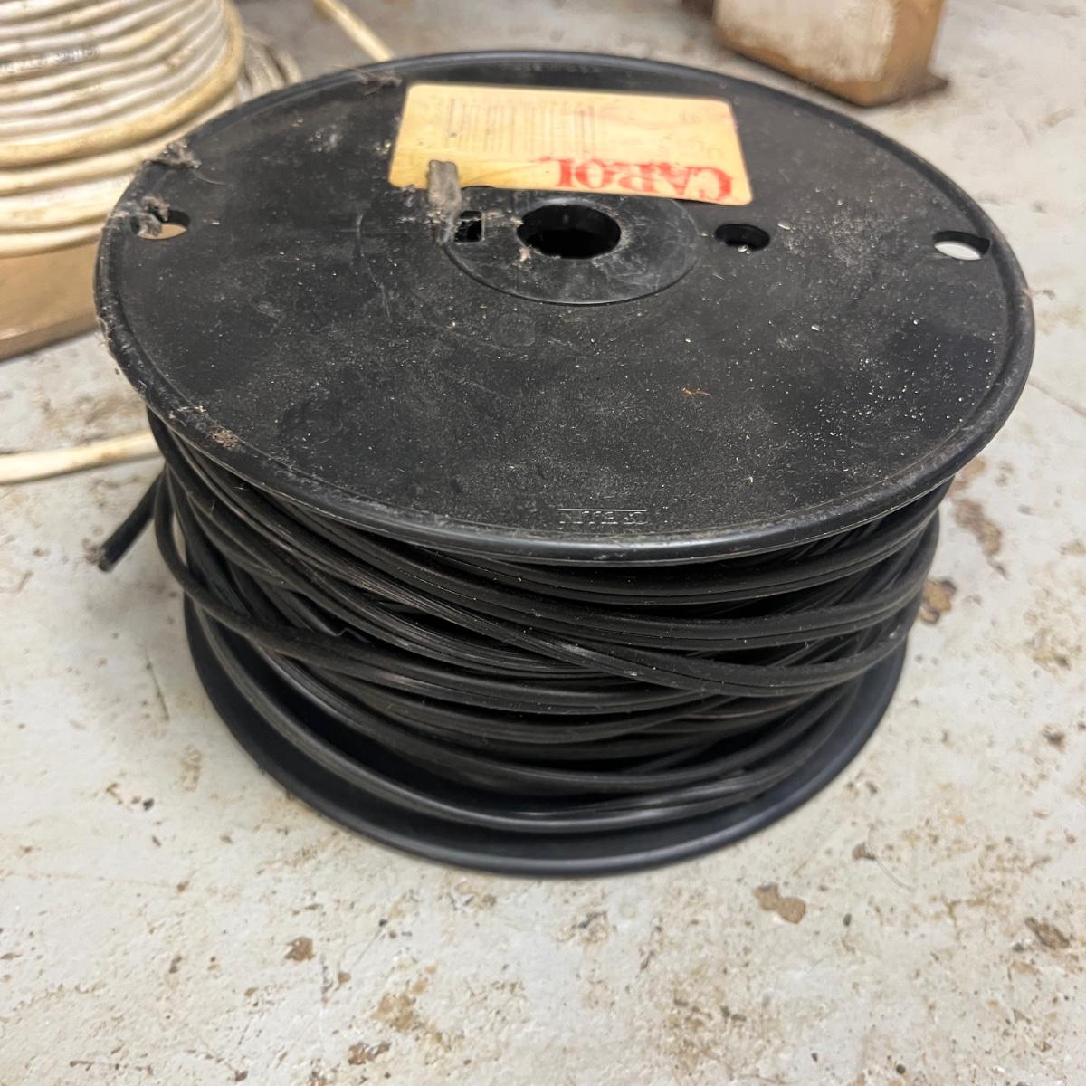 Lot includes a partial roll of 12/2 Romex, two rolls of wire, two solar motion sensor lights, three 10’ 1/2” EMT conduit, metal boxes, floor heating with thermostat and more.