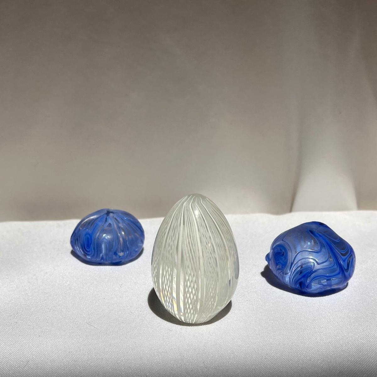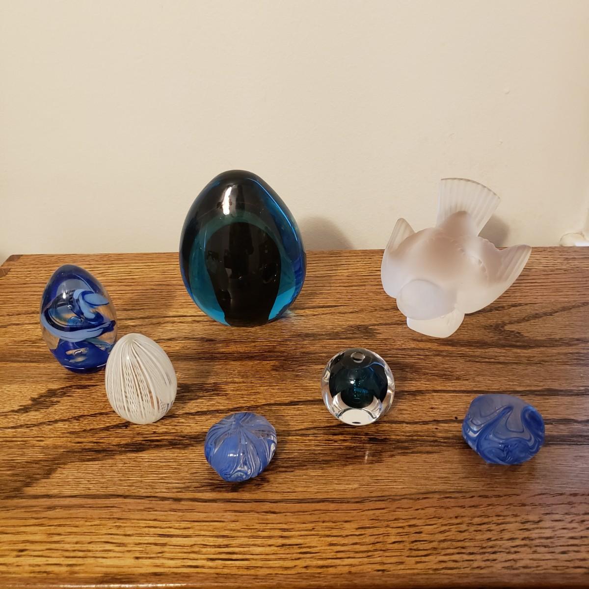 This lot includes six glass paperweights in various sizes and a glass bird. The largest paperweight appears to be a Ronneby Sweden piece, along with the egg shaped blue and clear glass paperweight. The smallest blue glass bottle measures 1.5” x 3.5”H. One paperweight is signed "Kosta", likely signifying Kosta Boda. Shipping available.