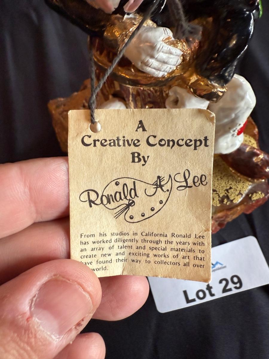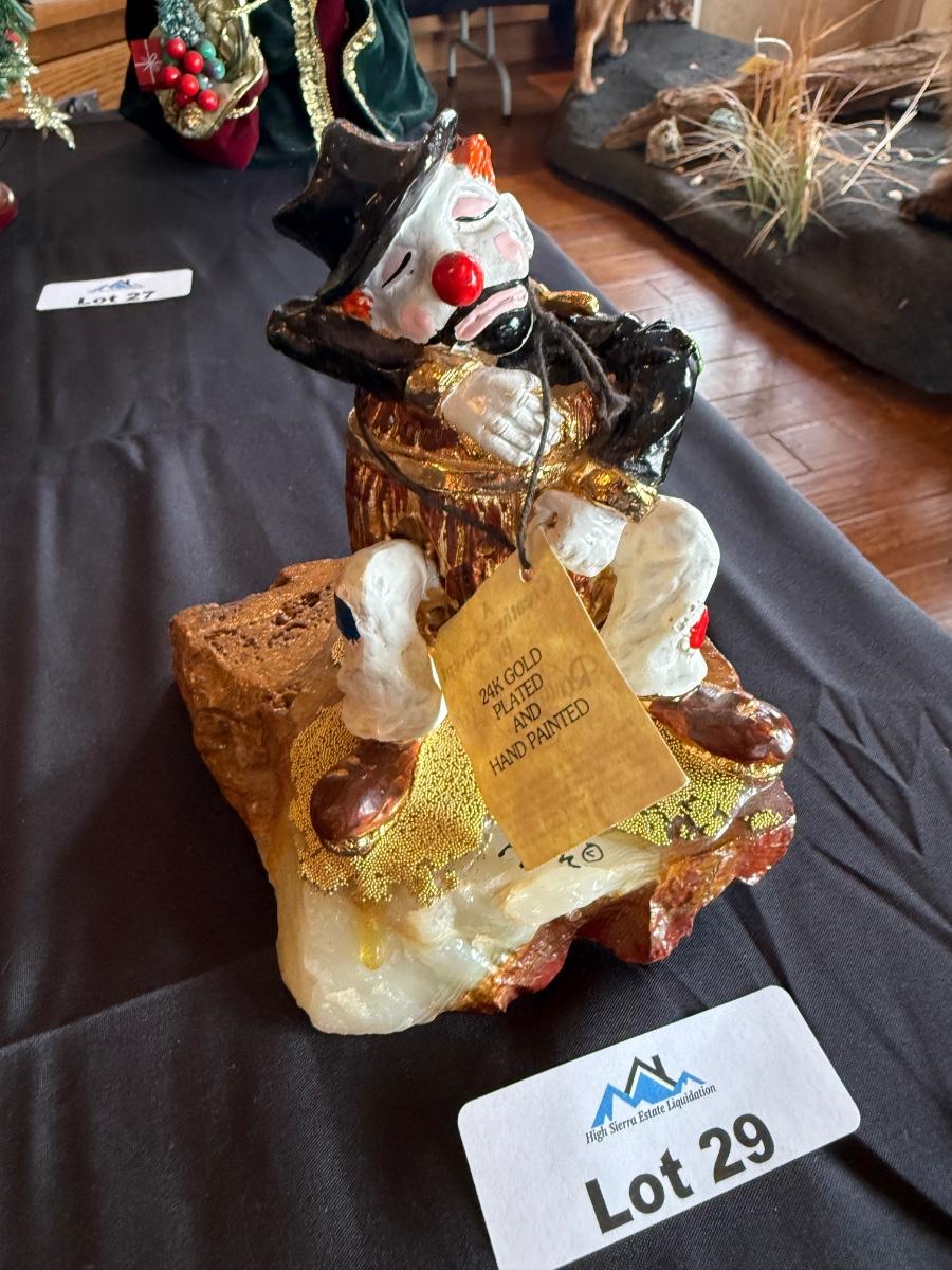 Ron Lee clown in Barrel w/dog on Stone base 24kt gold plated / hand painted