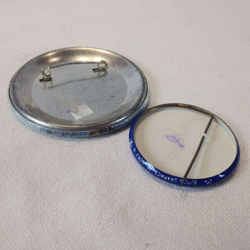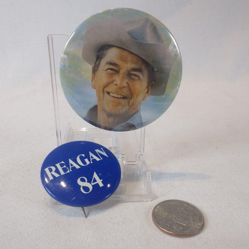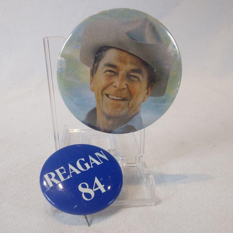 The larger Cowboy button is a great later photo of Ronnie. It is 2 1/1-inches in diameter. The smaller is an original REAGAN 84 political button. It is marked property of NRSC on edge. 1 1//2-inches in diameter. Both are in very good condition.