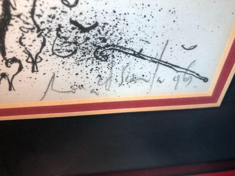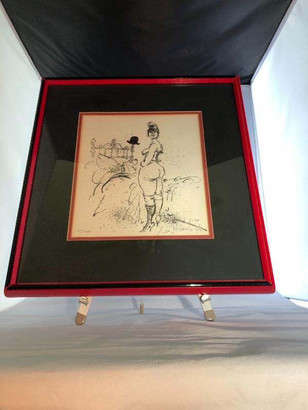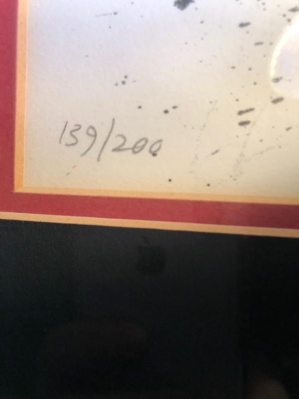 Signed by artist, numbered, 139 out of 200. Double matted with red frame. Framed piece measures 16.25” X 17.25”.
