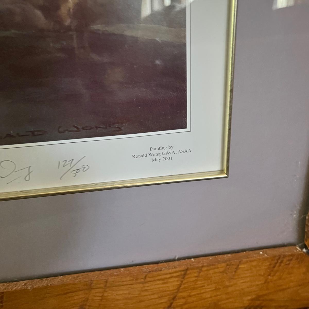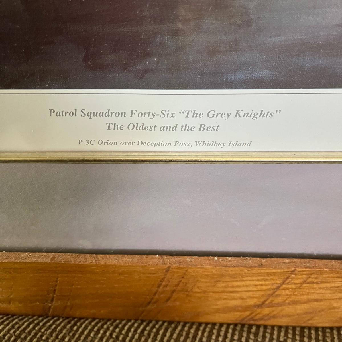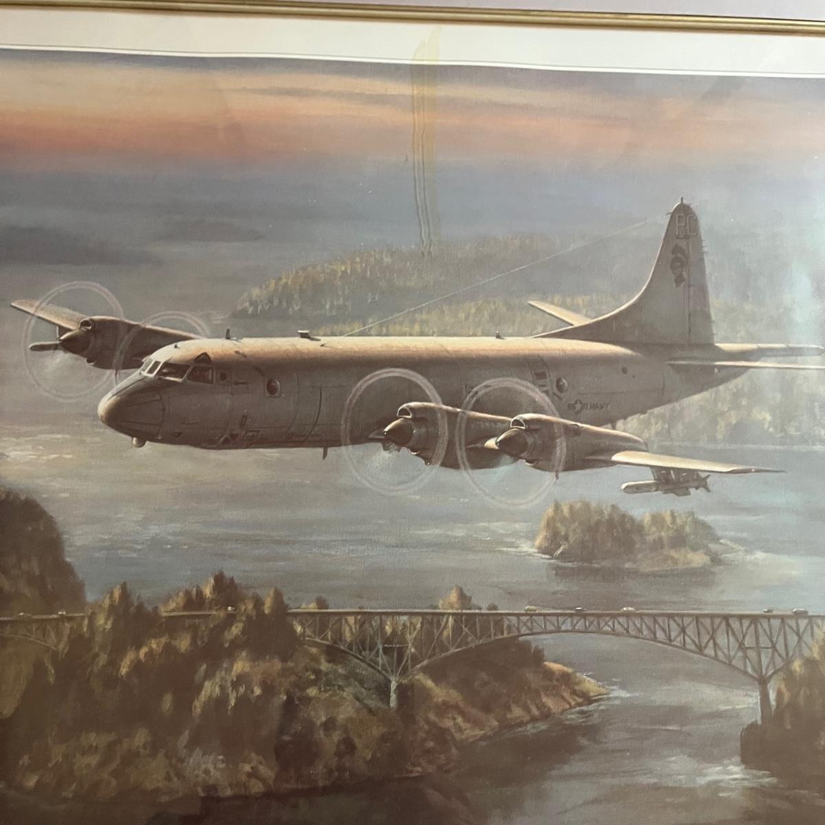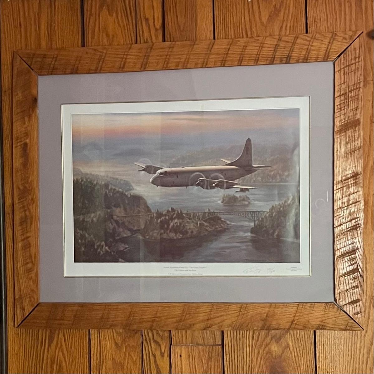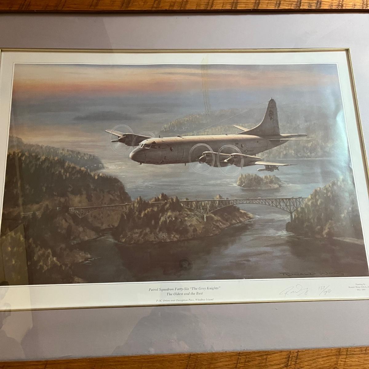 This piece of art is a pencil signed and numbered print by Ronald Wong. It depicts a P-C3 Orion over Deception Pass, Whidbey Island. Frame is wood and measures 30” x 37”.