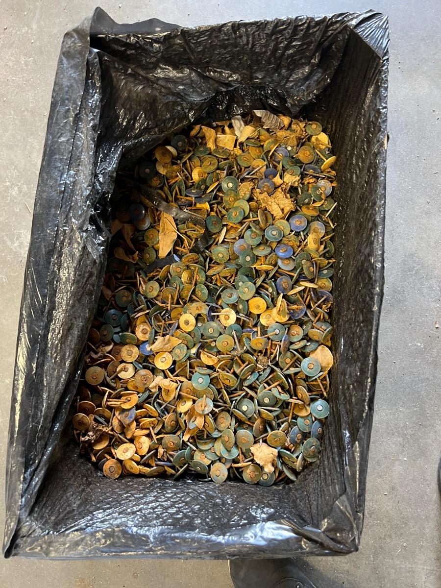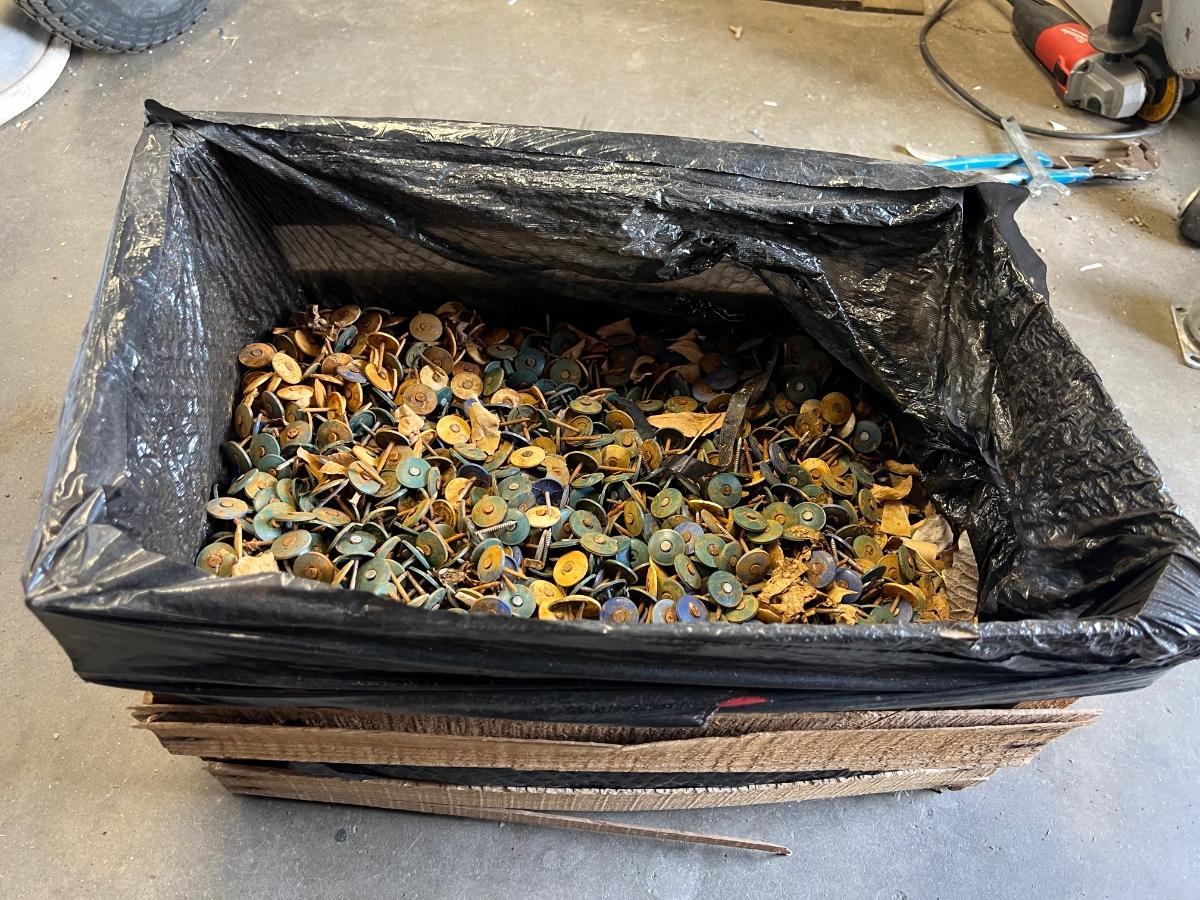 Large crate of roof nails, roofing tracks with plastic tops