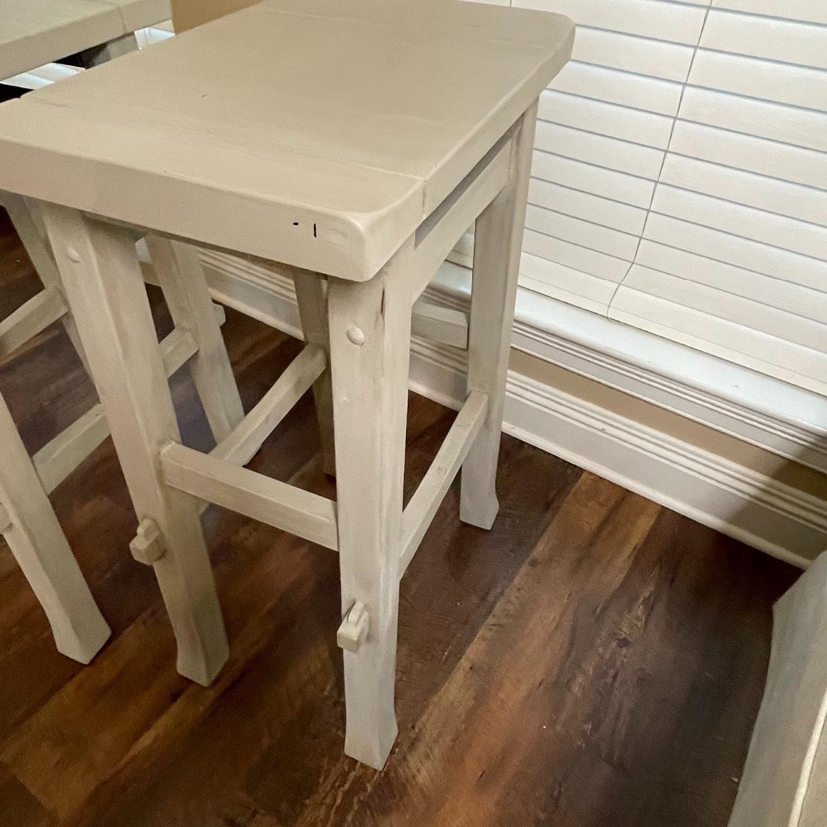 Cool gray and slightly distressed. Wood stools are bar height - seat at 30”.