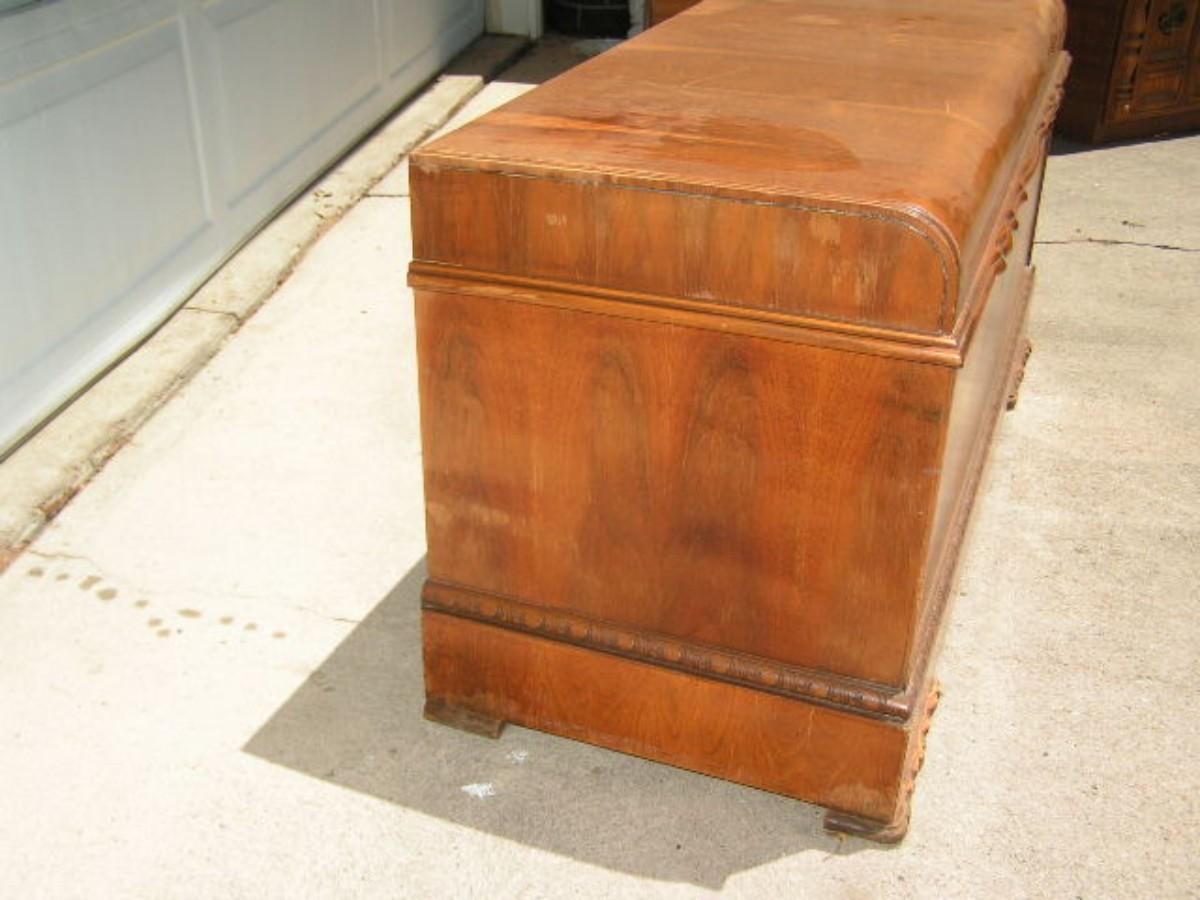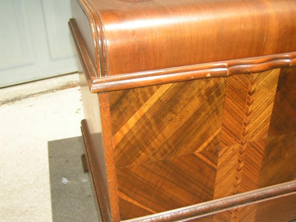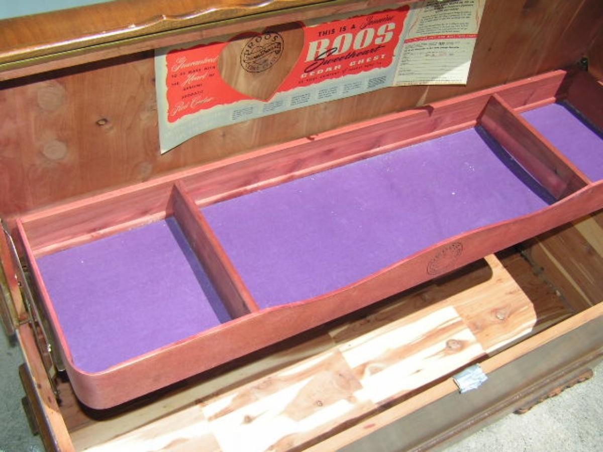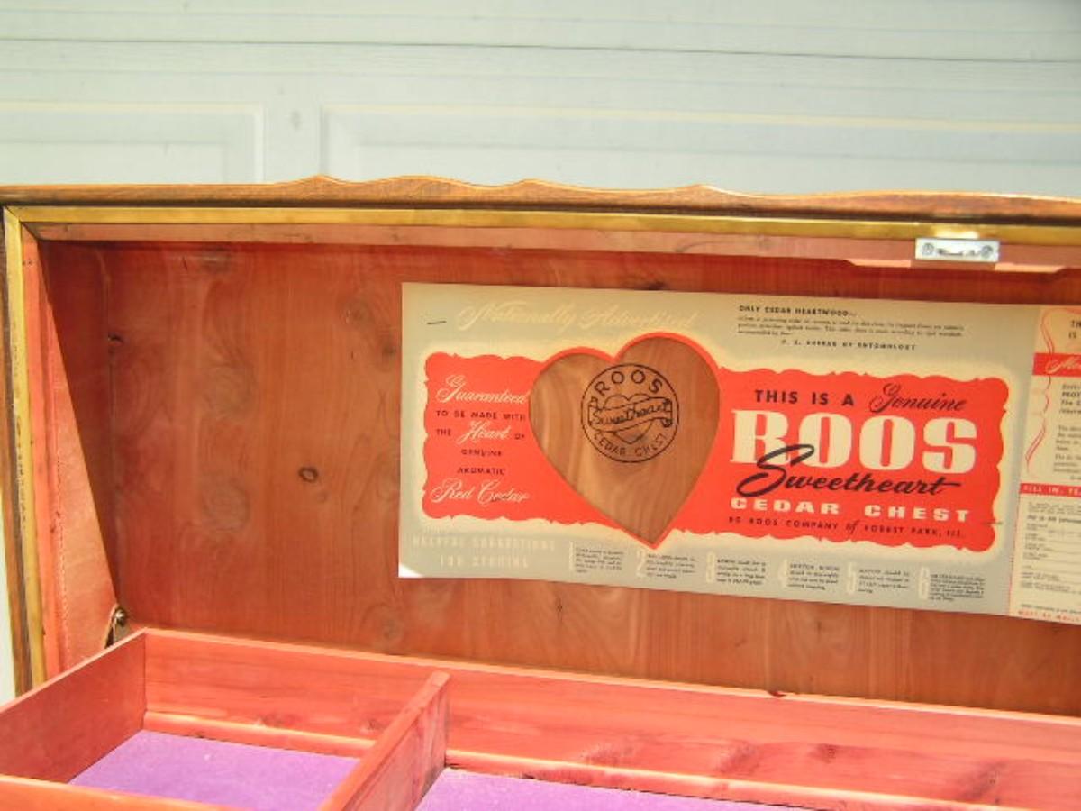More furniture elsewhere in this sale. ROOS cedar chest. Vintage unknown. Beautiful intricately inlaid pattern front. Solid construction and still in physically stong condition. Finish is blemished for lack of love over the years, needs some TLC to get it back in shape. Lock has been drilled and needs replaced. ROOS was a premier manufacturer of cedar chests among other fine furniture from Chicago IL. About 48"x18"x23"tall