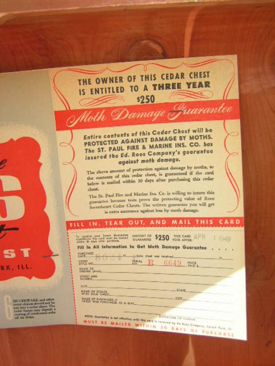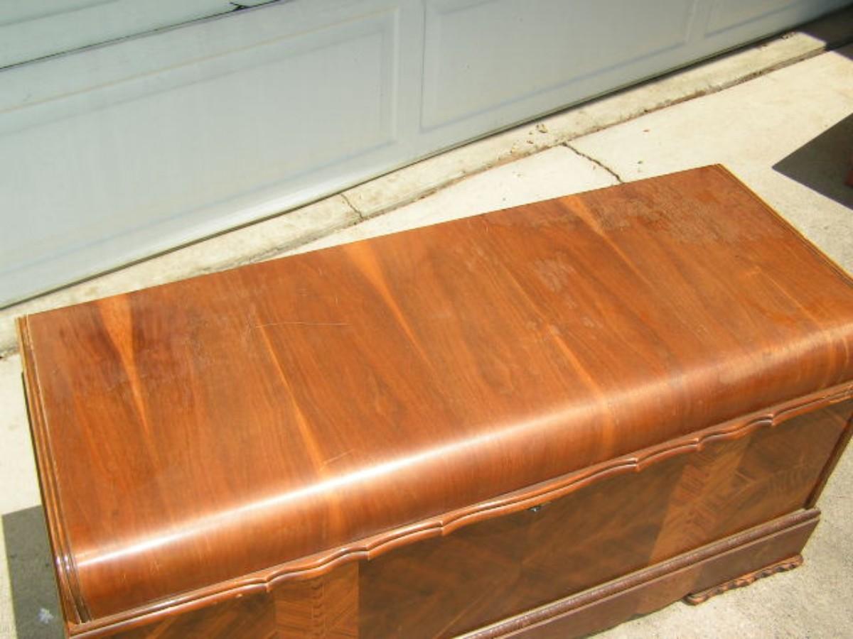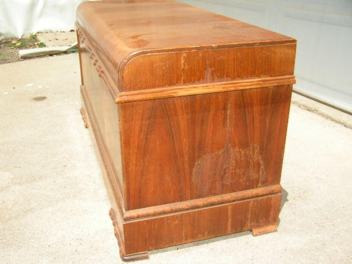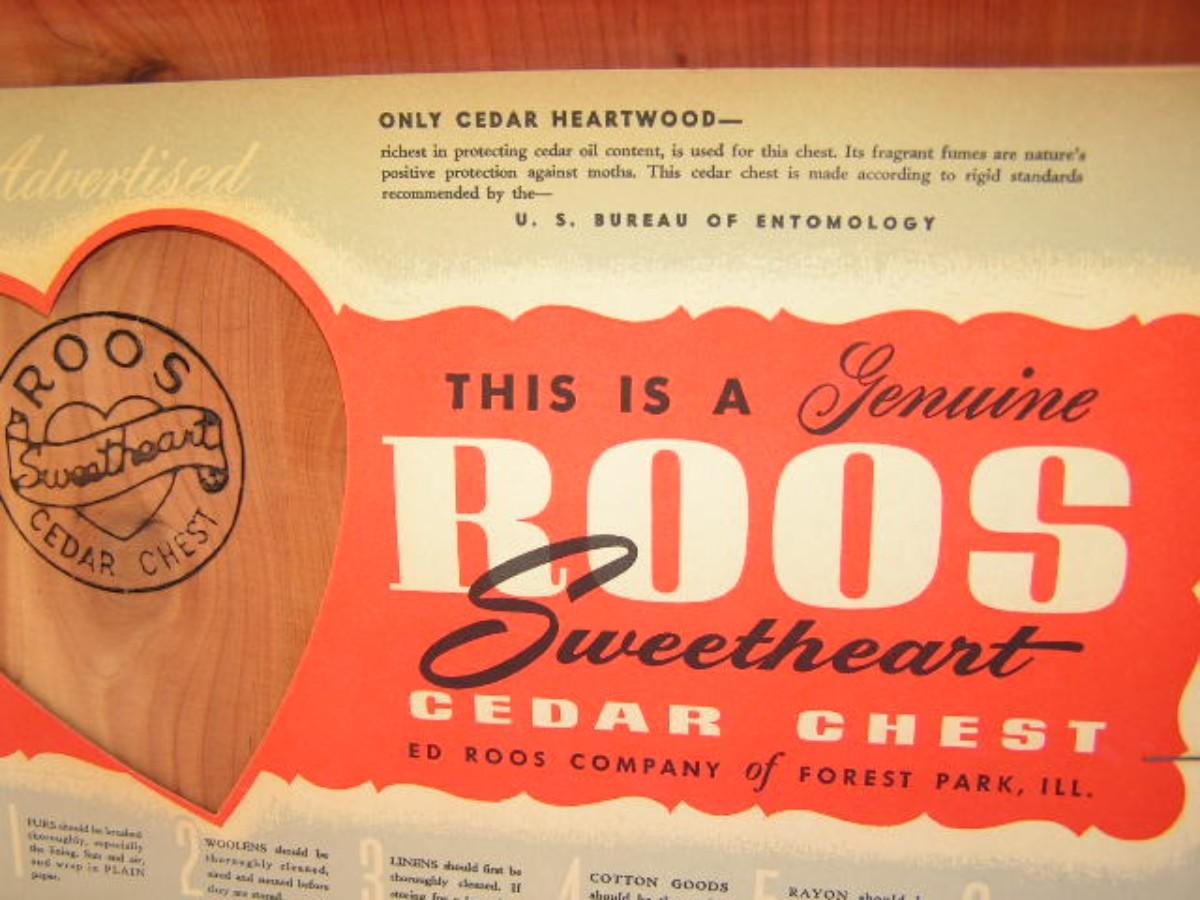 More furniture elsewhere in this sale. ROOS cedar chest. Vintage unknown. Beautiful intricately inlaid pattern front. Solid construction and still in physically stong condition. Finish is blemished for lack of love over the years, needs some TLC to get it back in shape. Lock has been drilled and needs replaced. ROOS was a premier manufacturer of cedar chests among other fine furniture from Chicago IL. About 48"x18"x23"tall