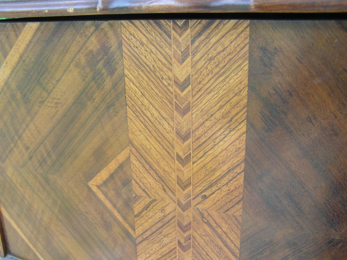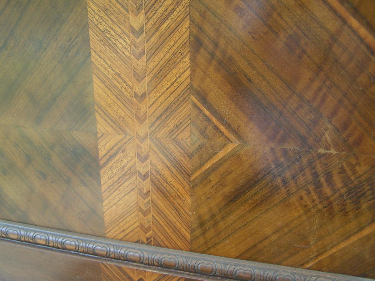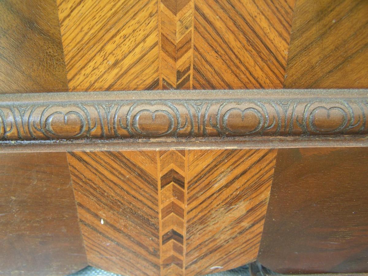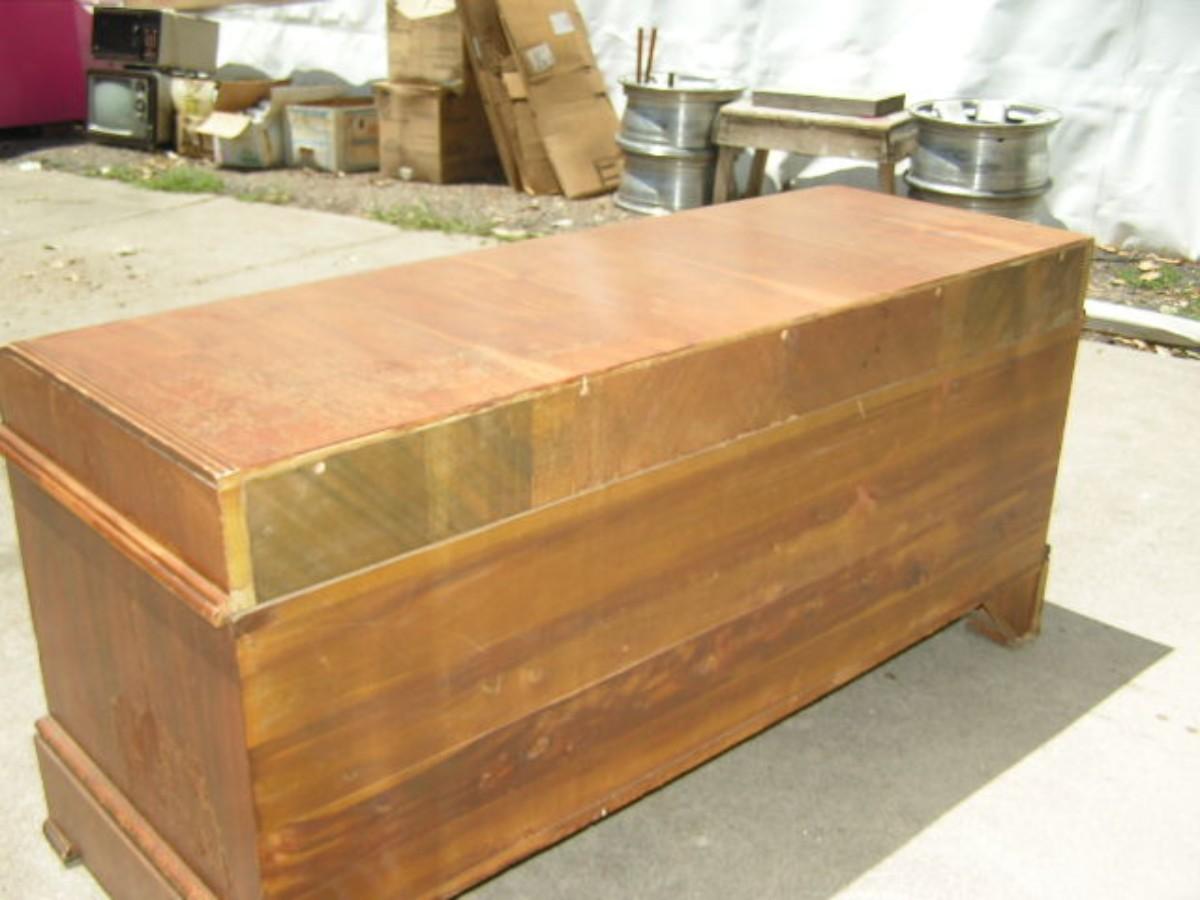 More furniture elsewhere in this sale. ROOS cedar chest. Vintage unknown. Beautiful intricately inlaid pattern front. Solid construction and still in physically stong condition. Finish is blemished for lack of love over the years, needs some TLC to get it back in shape. Lock has been drilled and needs replaced. ROOS was a premier manufacturer of cedar chests among other fine furniture from Chicago IL. About 48"x18"x23"tall