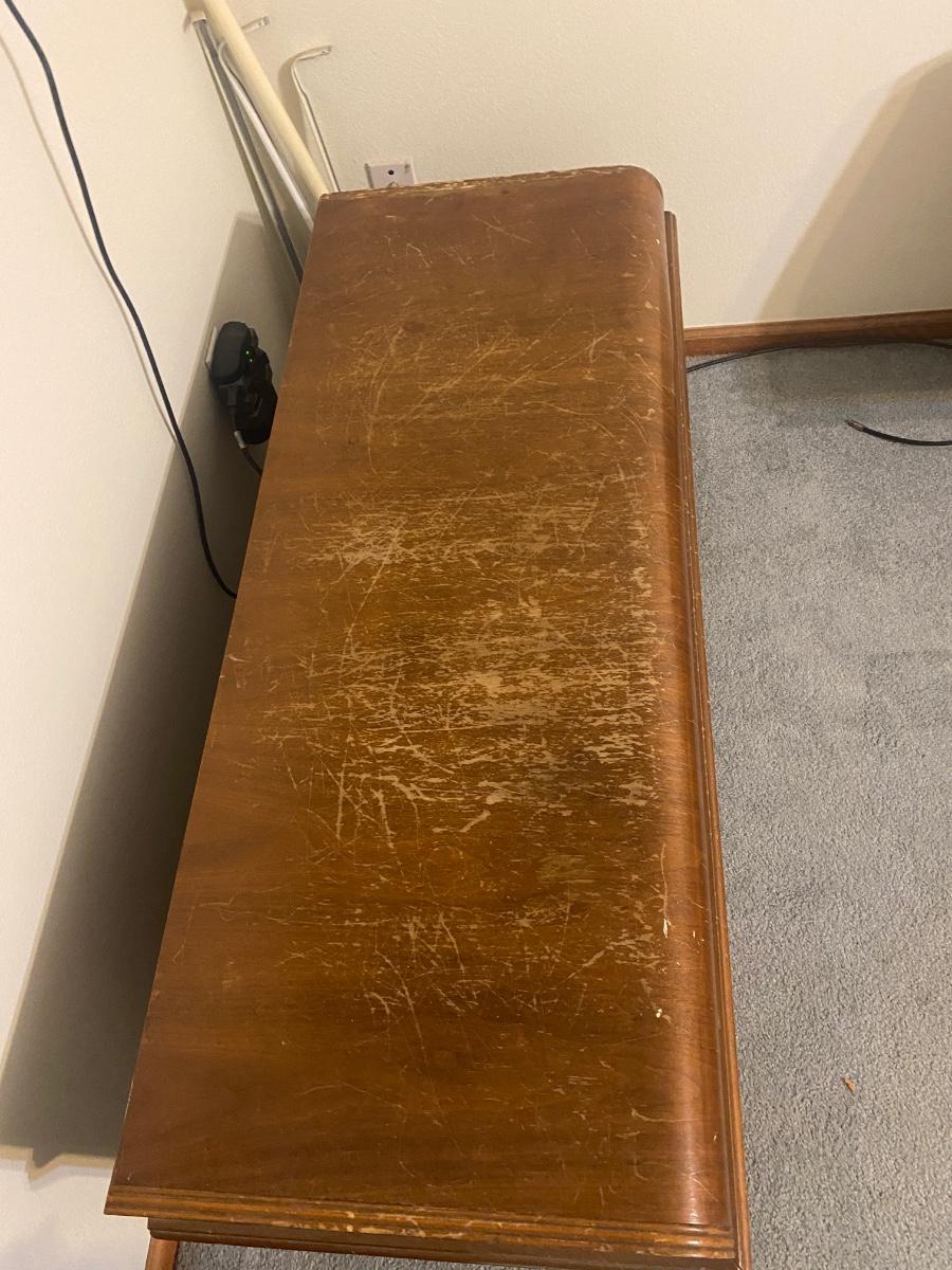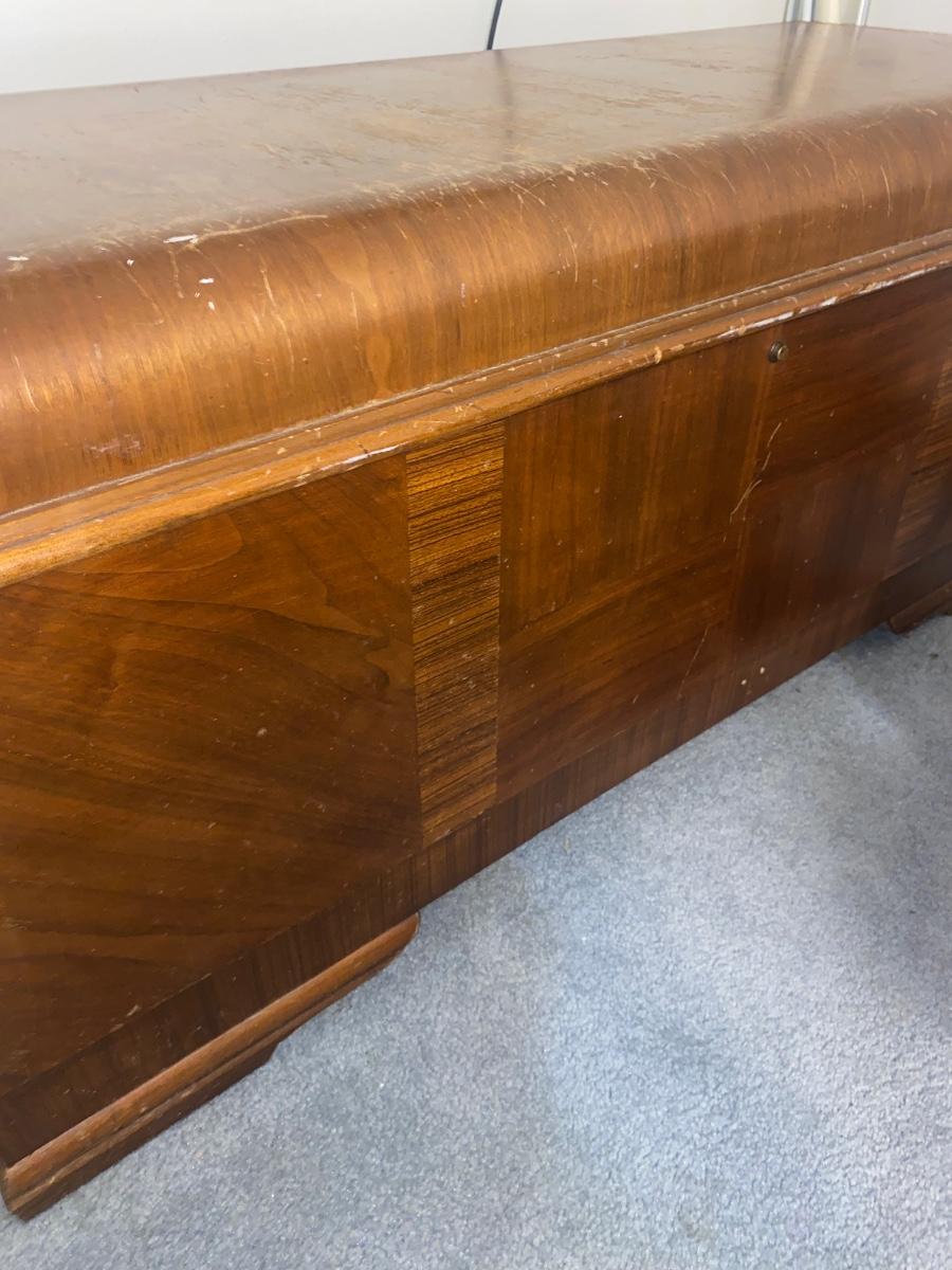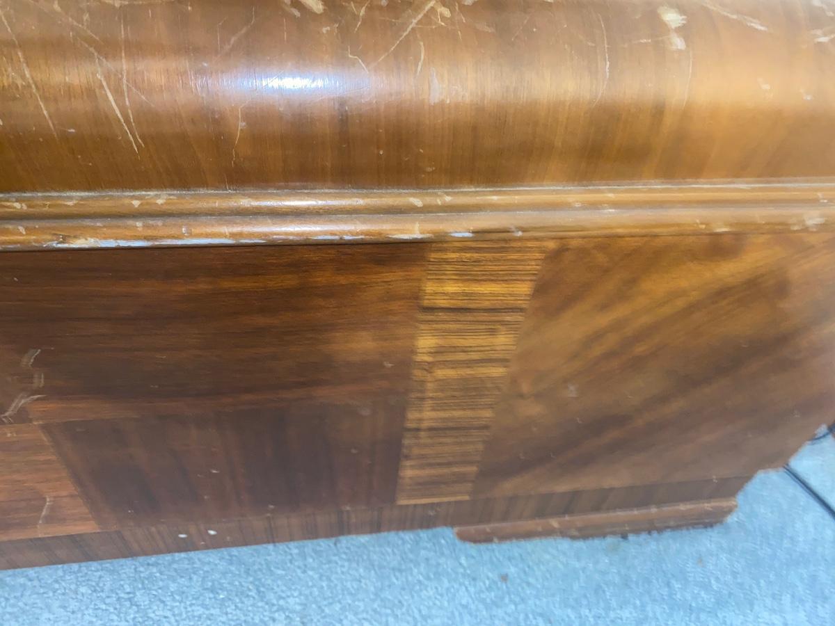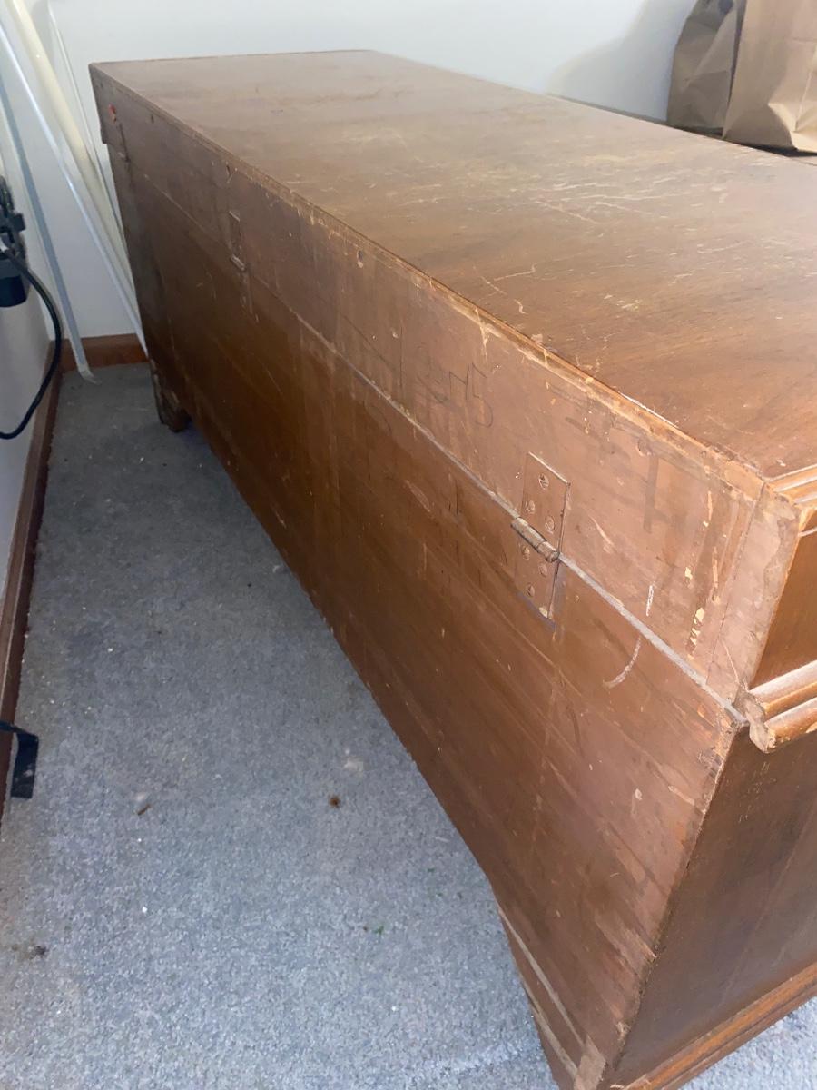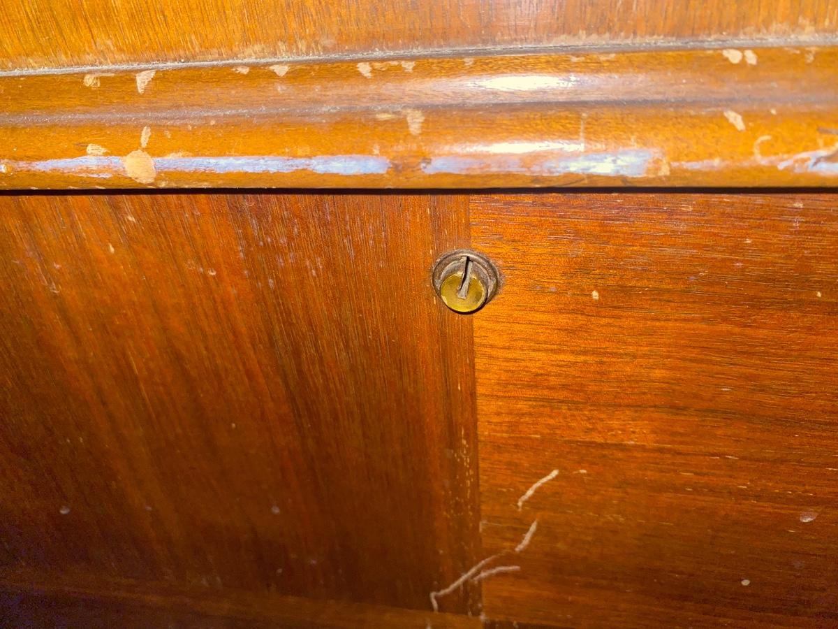 There is a loss of finish on the top but this is a beautiful old piece. Could not locate the key.