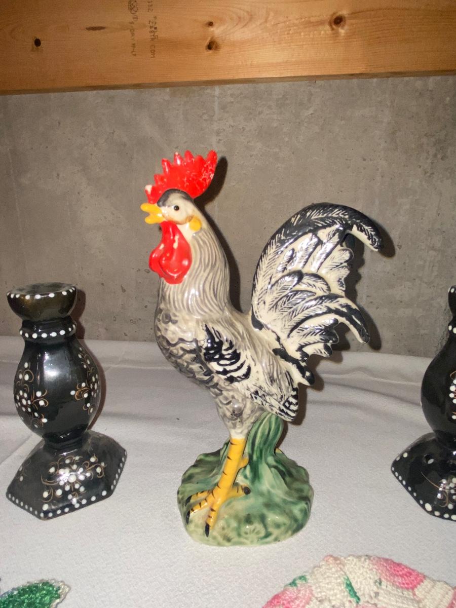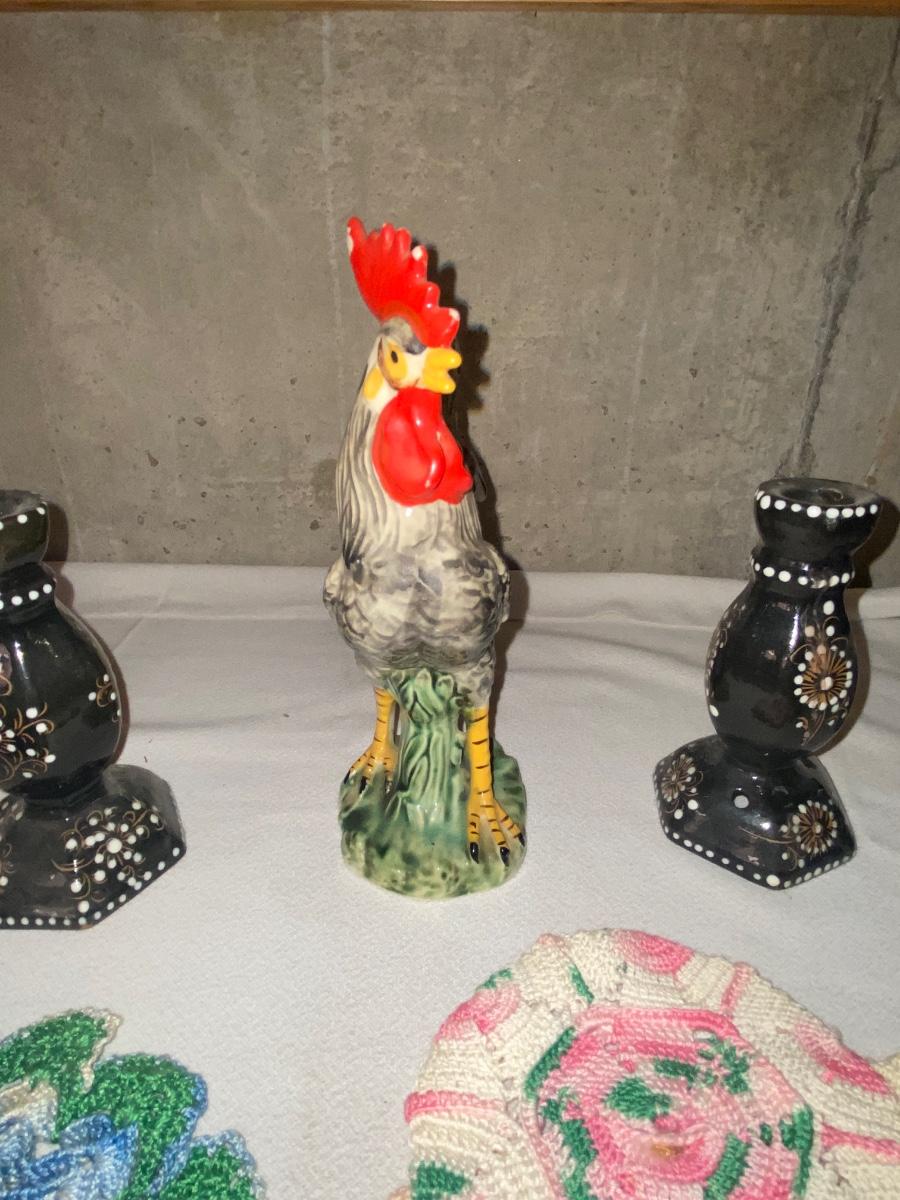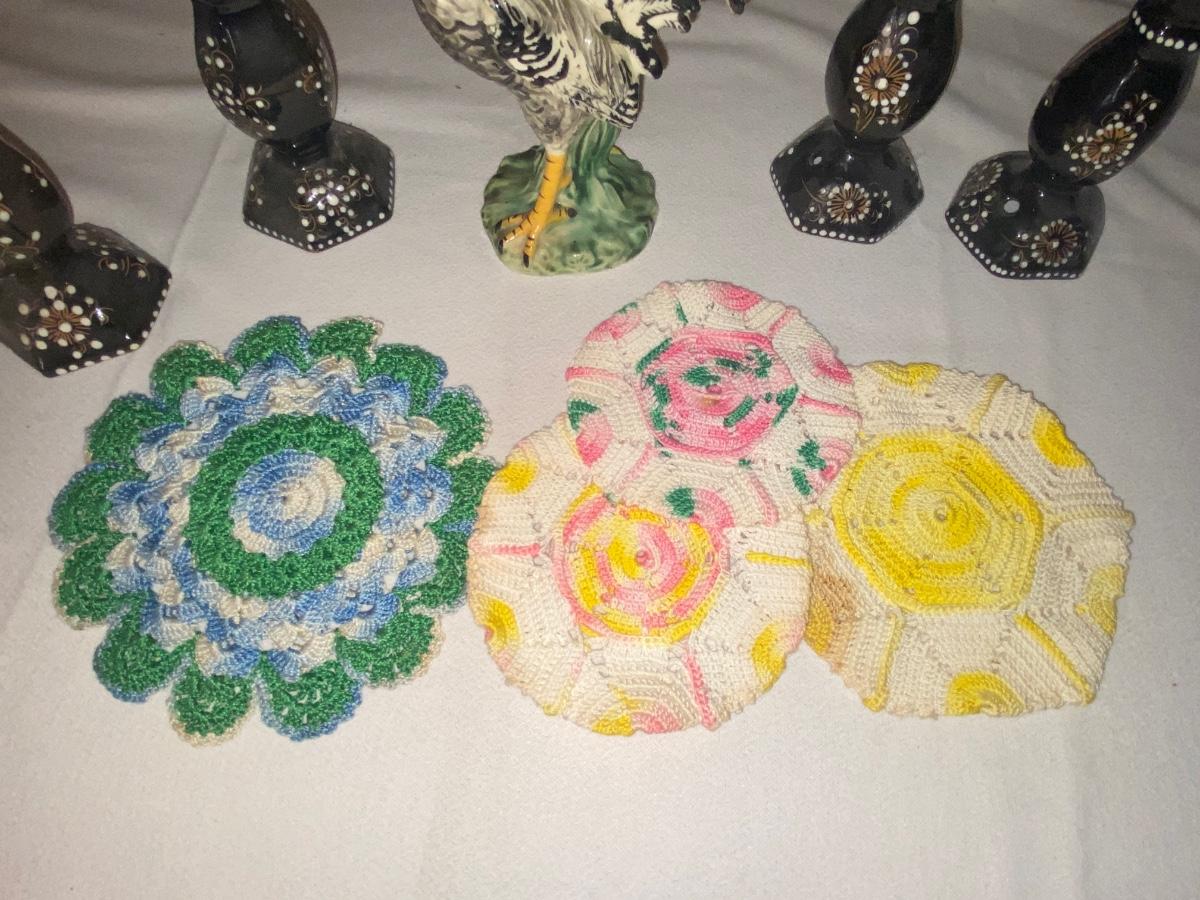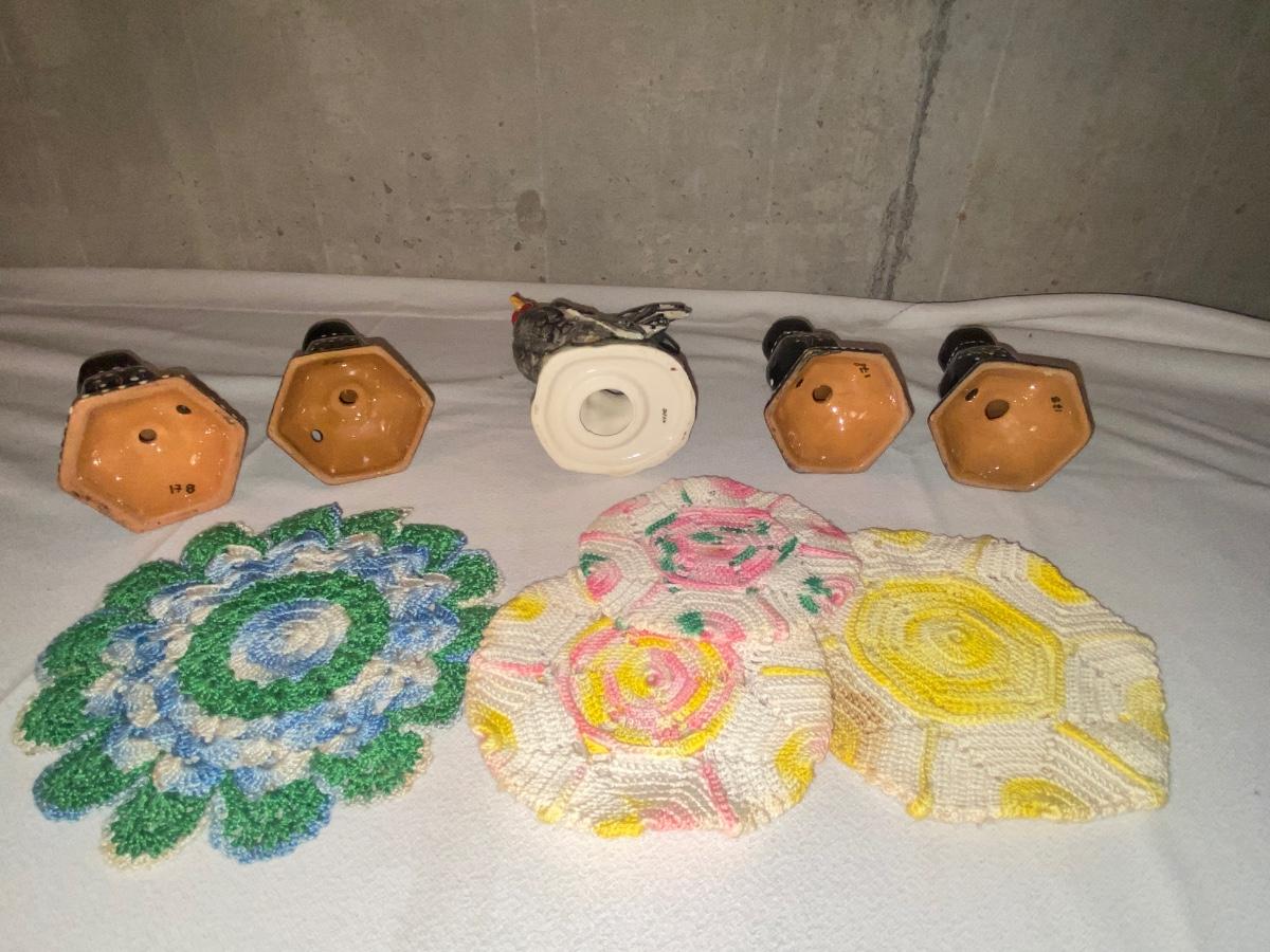 ROOSTER, CANDLESTICK HOLDERS, AND COLORFUL DOILIES,