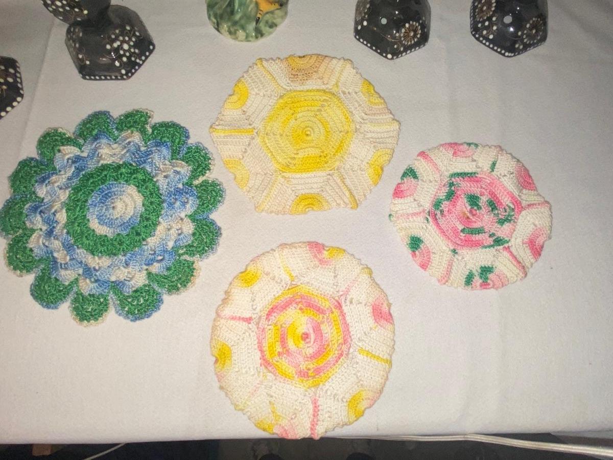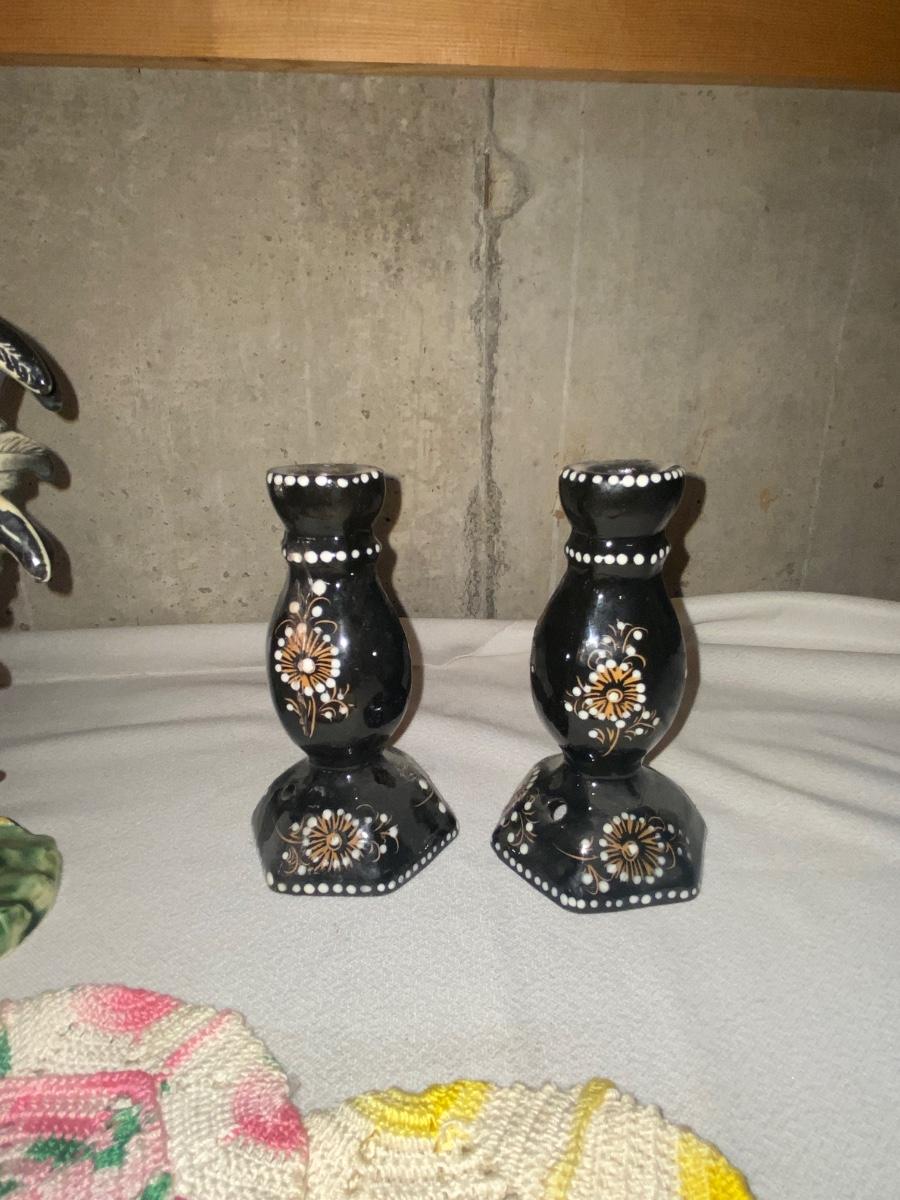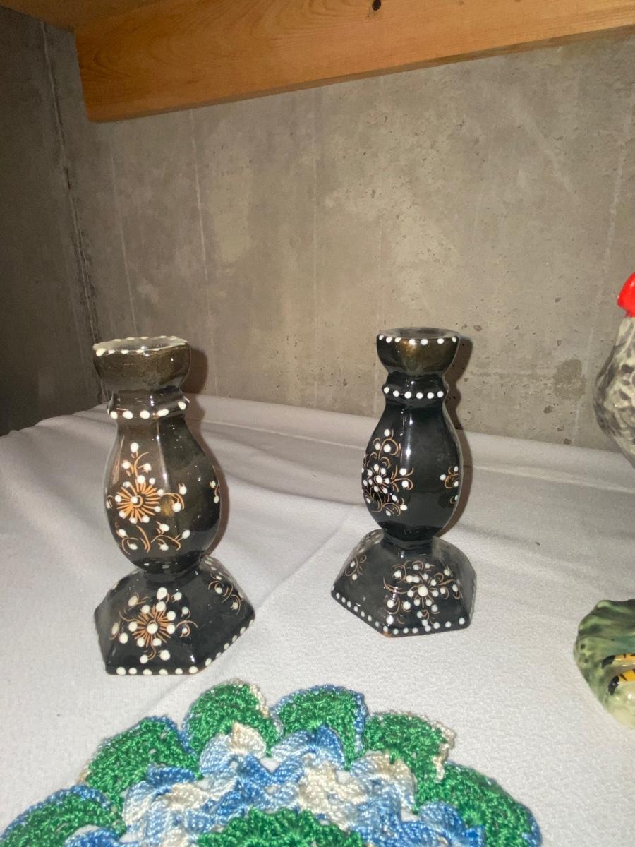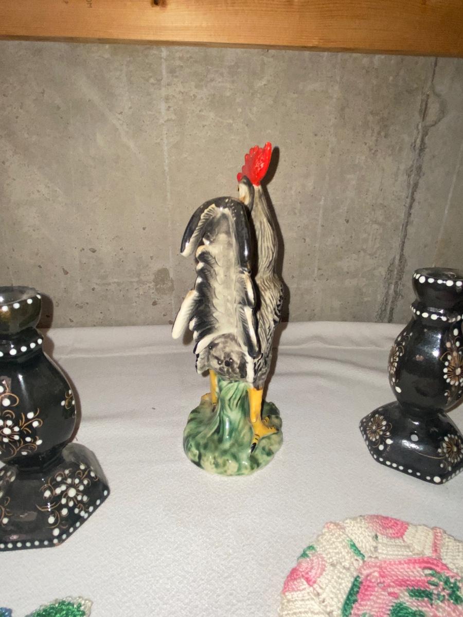 ROOSTER, CANDLESTICK HOLDERS, AND COLORFUL DOILIES,