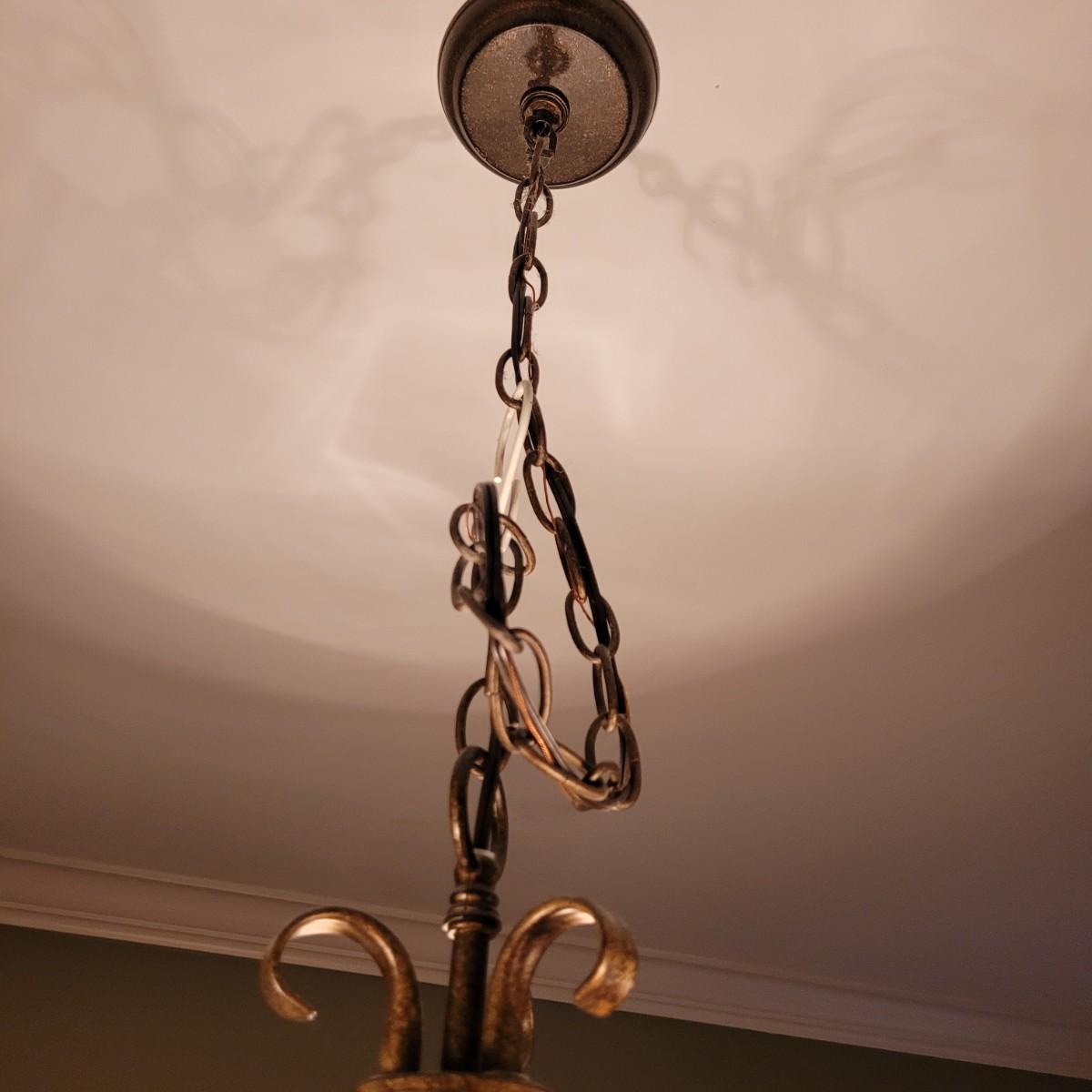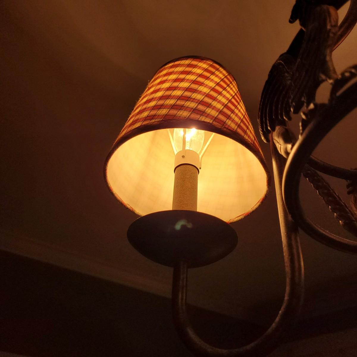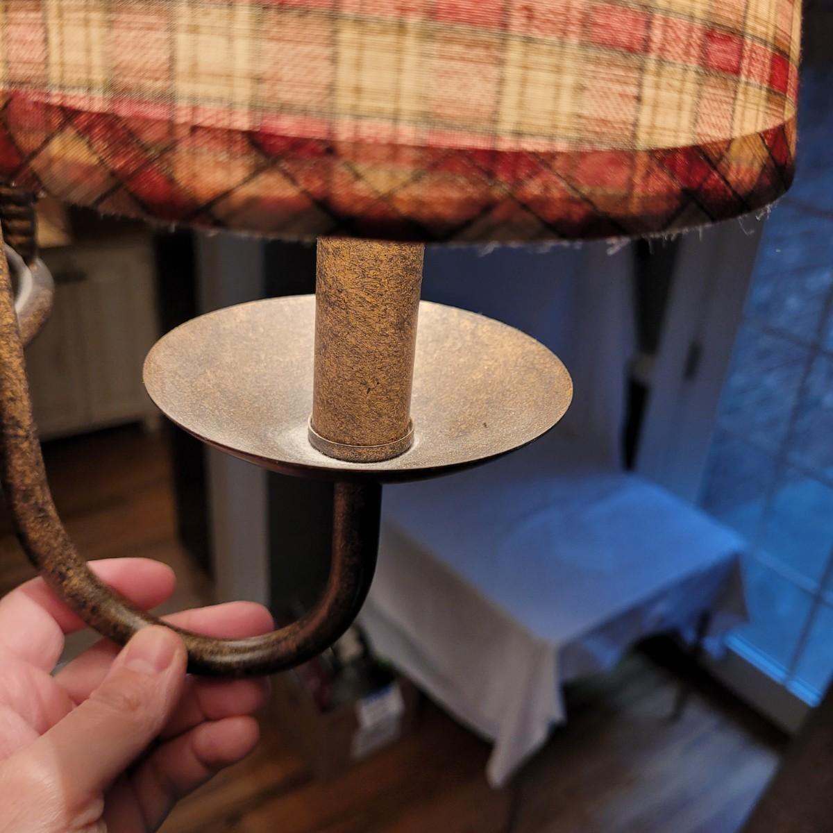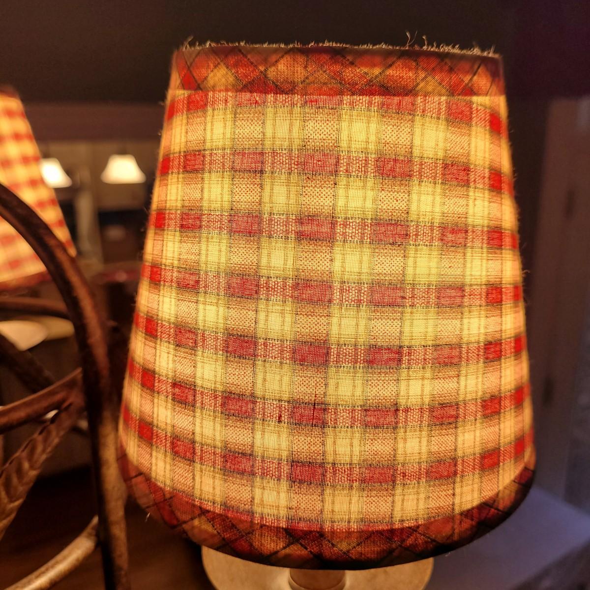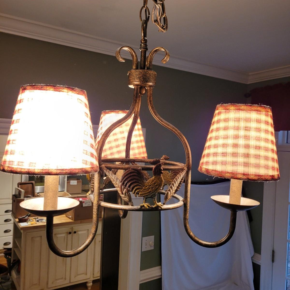This metal rooster chandelier has three lights covered with country style plaid lampshades. Measures approximately 20” W x 15”H from top of chandelier (chain not included in measurement). Local pick up only. Winning bidder must bring ladder (ceiling is 9’ high) and appropriate tools to remove from ceiling. Winning bidder is responsible for removing the unit from the mount and wiring and must bring wire caps for loose wires. Power will be shut off for removal.