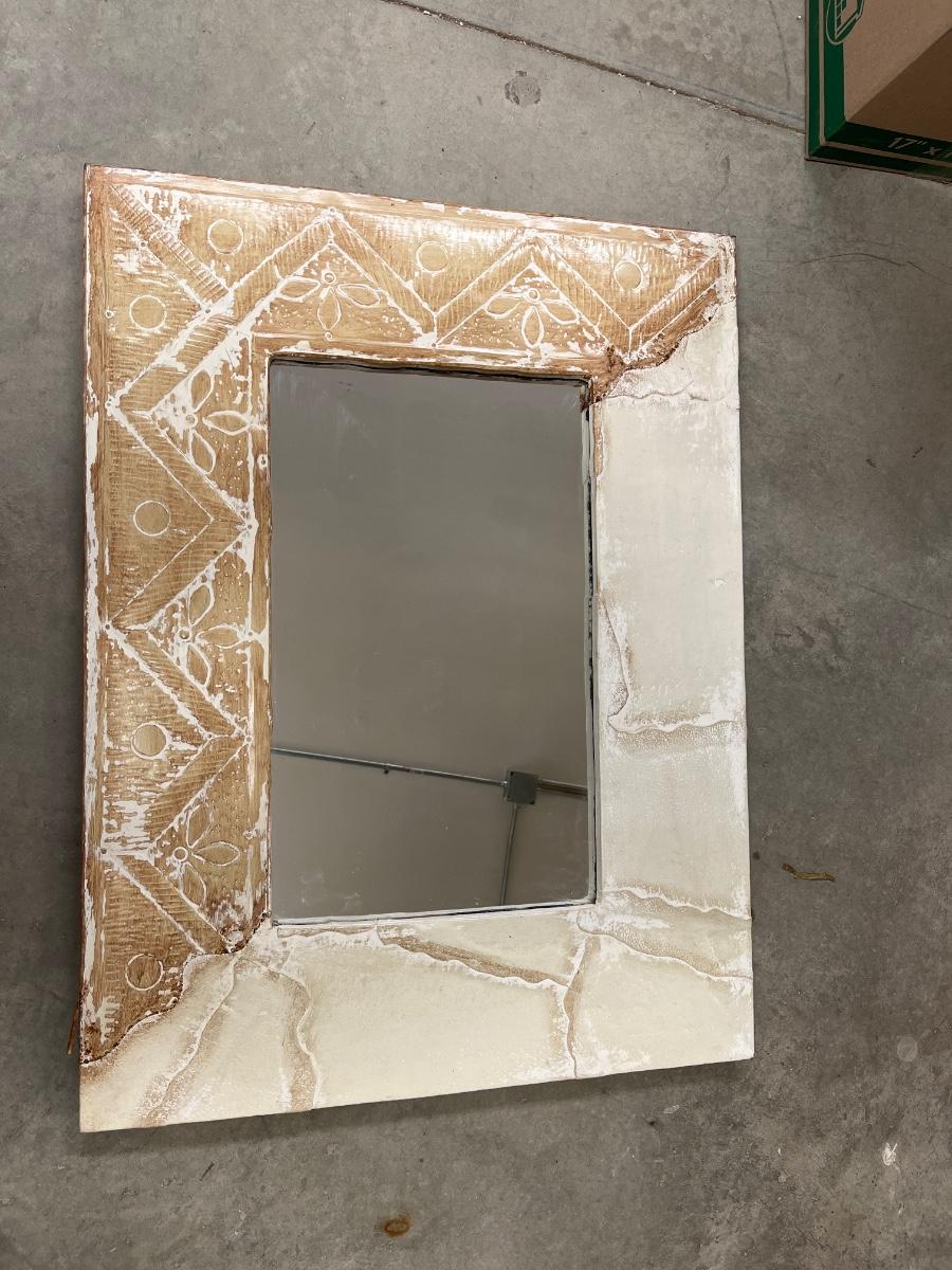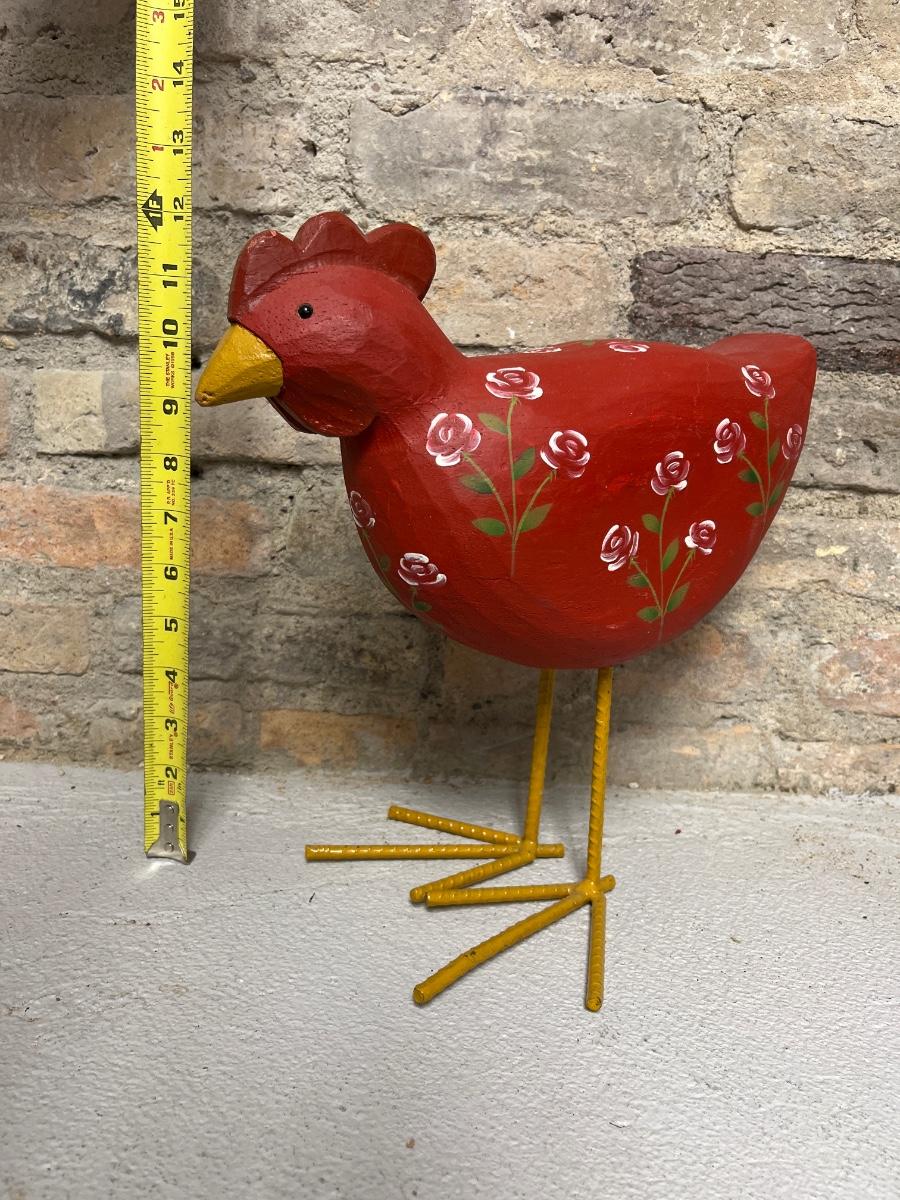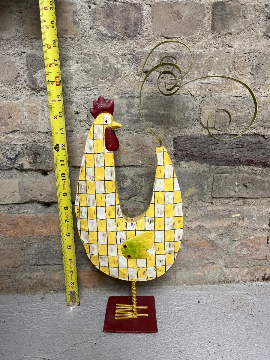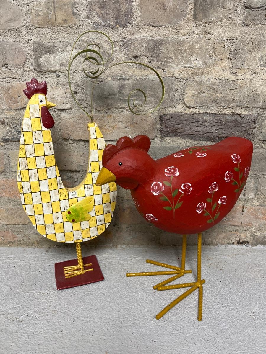 Awesome Farmhouse decor. A rooster and chicken with rebar legs and feet as well as an interesting mirror and mirrored tray,
