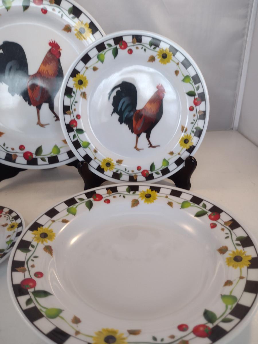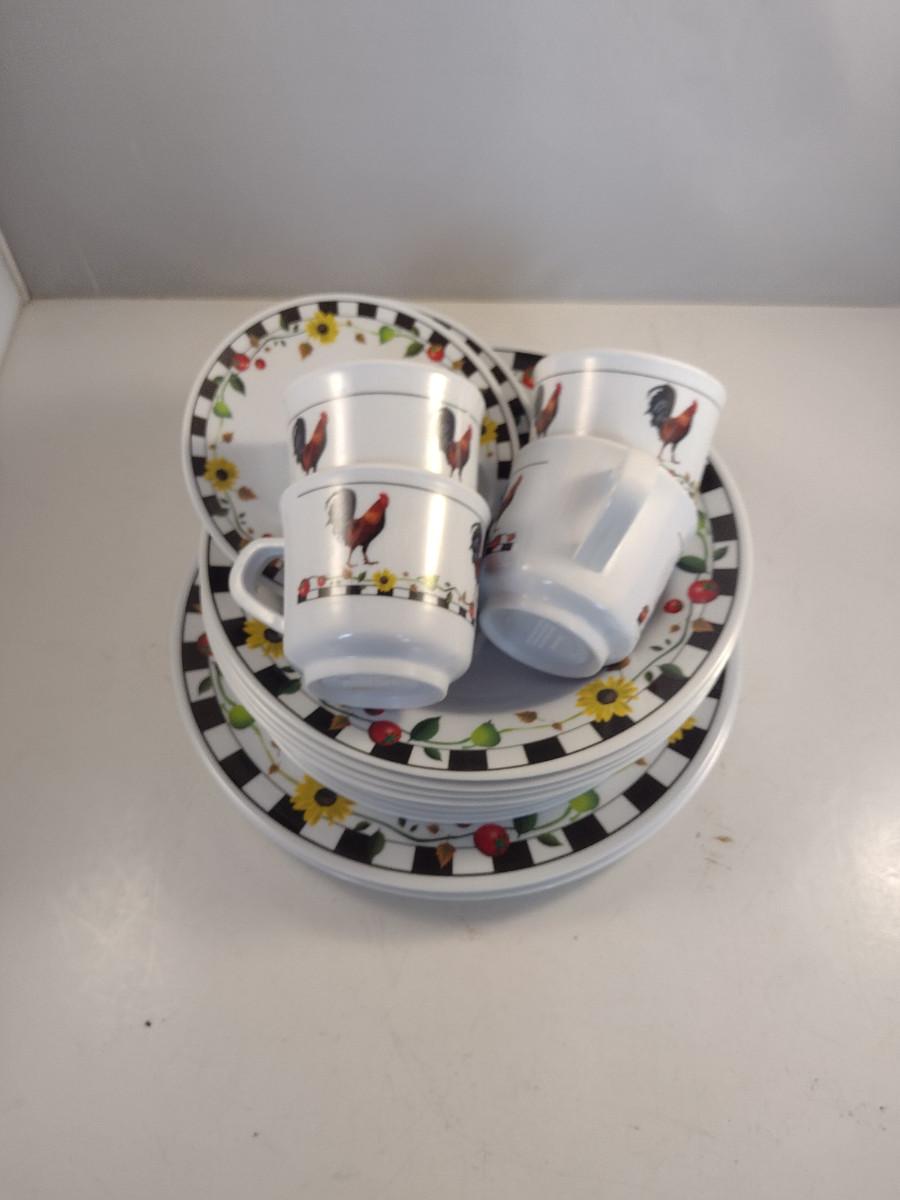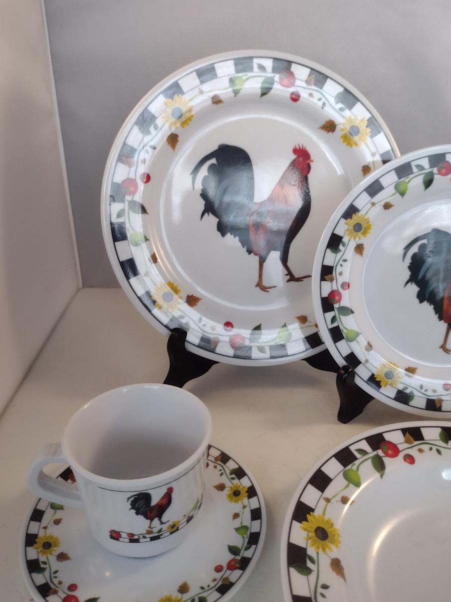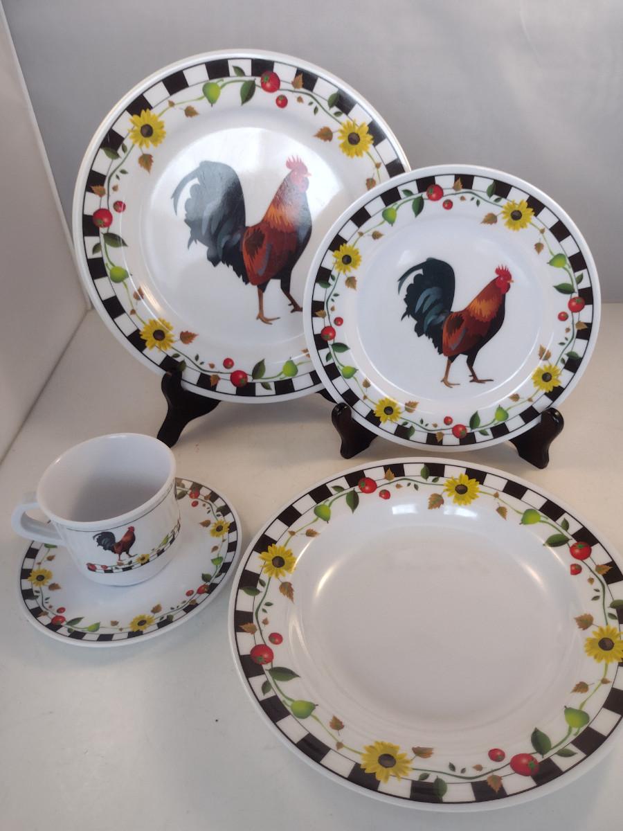 Rooster Design Plastic Dinnerware- 20 Pieces. Four of each: dinner plate, salad plate, soup bowl, cup, and saucer.