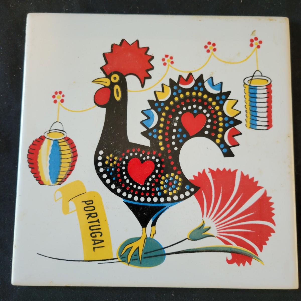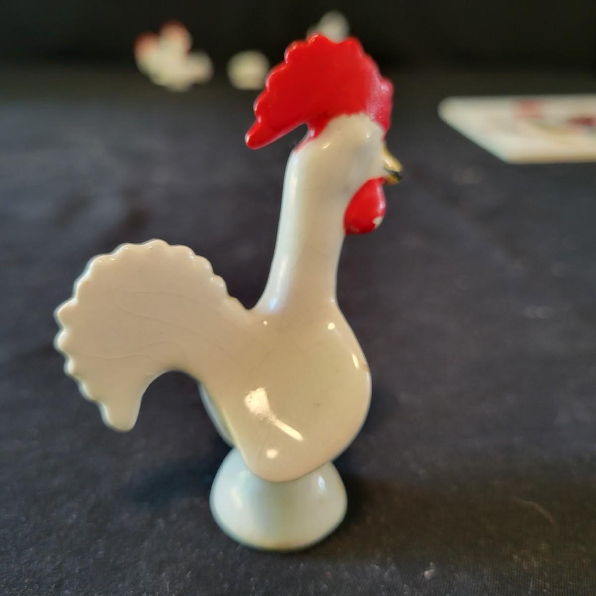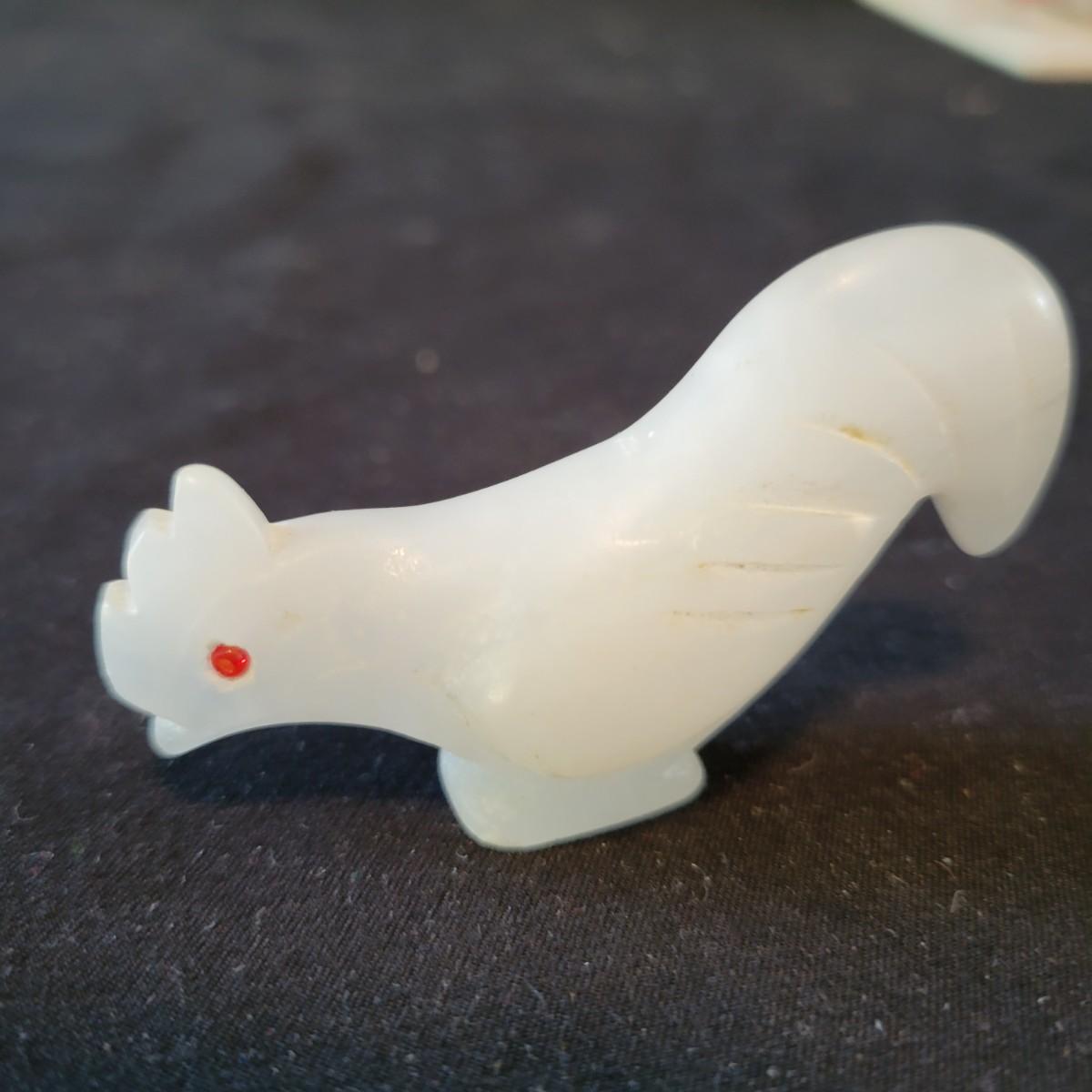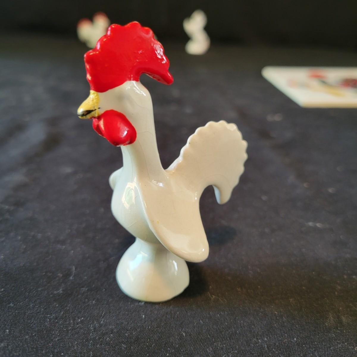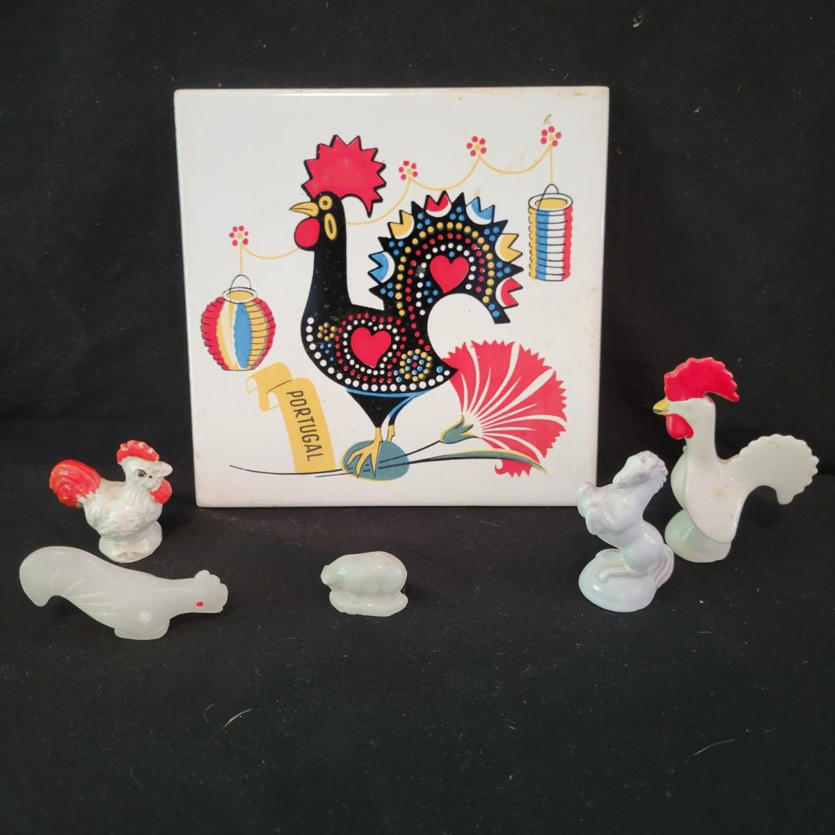 A collection of rooster figurines, 2 are made of porcelain and 1 carved from quartz. Also includes a stallion and lamb made of porcelain. Lot also includes a ceramic tile featuring a Rooster that was manufactured in Portugal. Tile measures approximately 6" sq. Shipping available