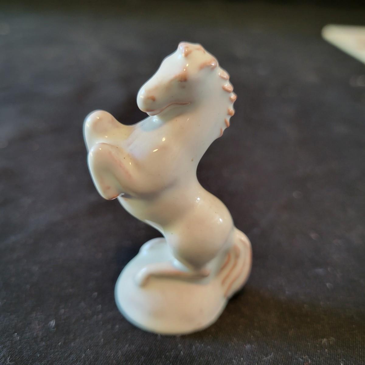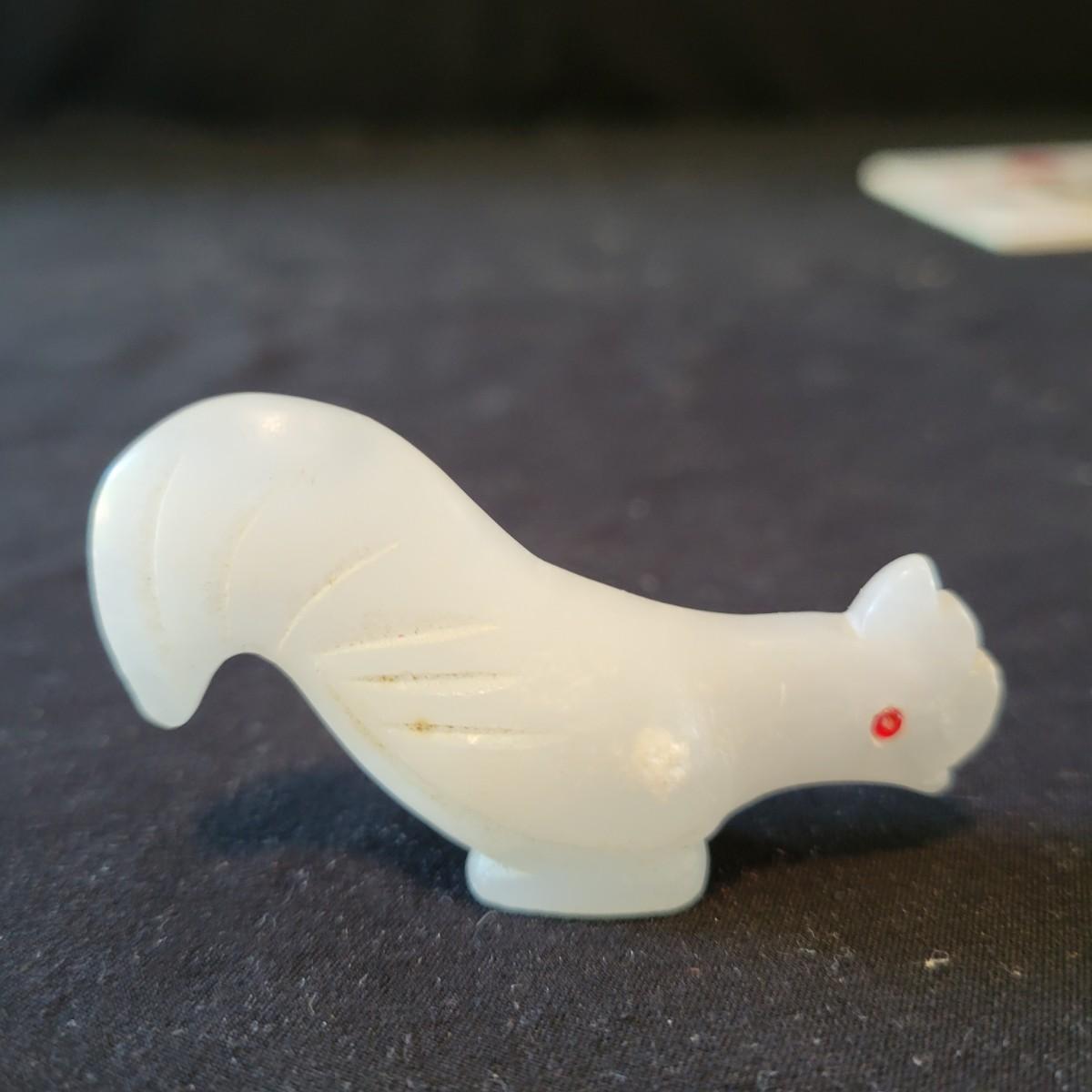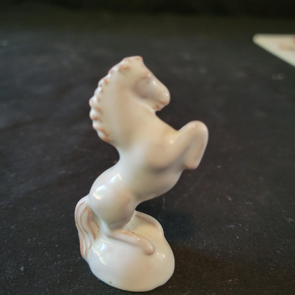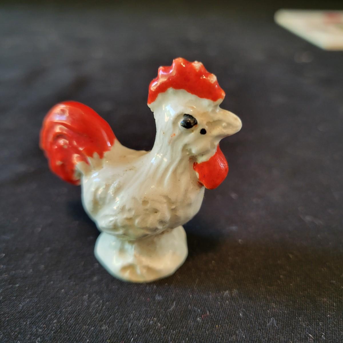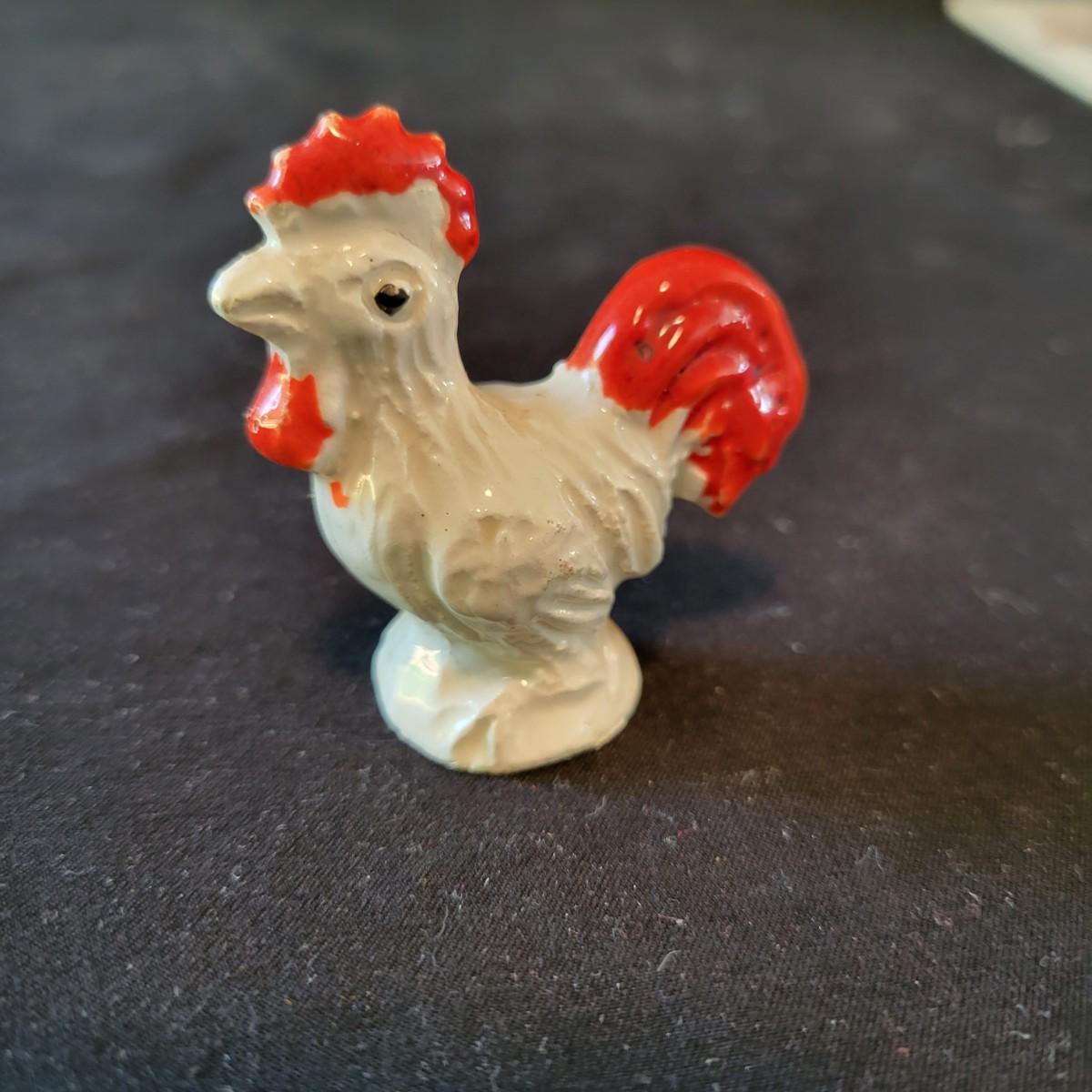A collection of rooster figurines, 2 are made of porcelain and 1 carved from quartz. Also includes a stallion and lamb made of porcelain. Lot also includes a ceramic tile featuring a Rooster that was manufactured in Portugal. Tile measures approximately 6" sq. Shipping available