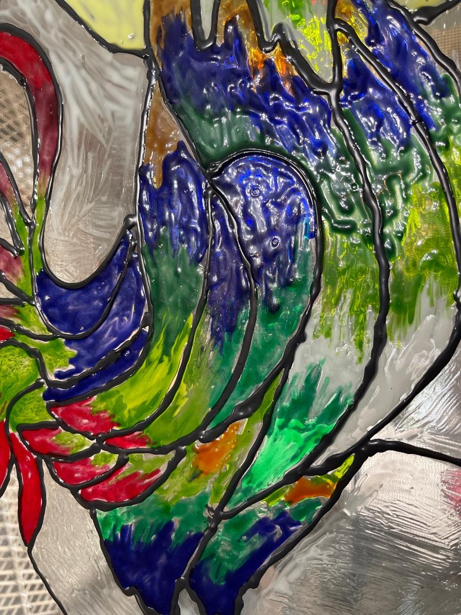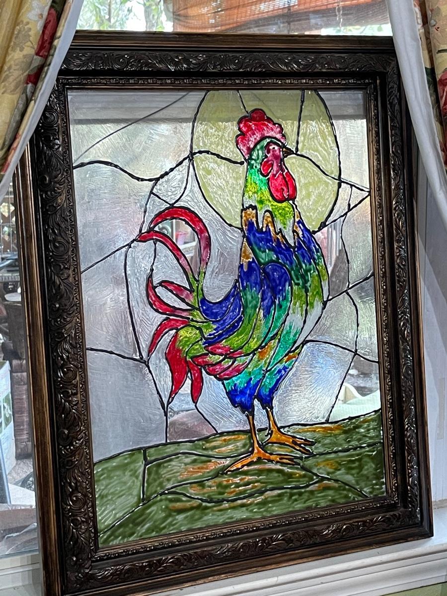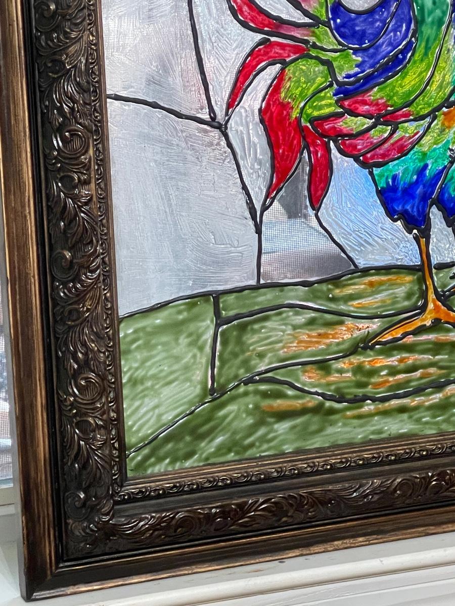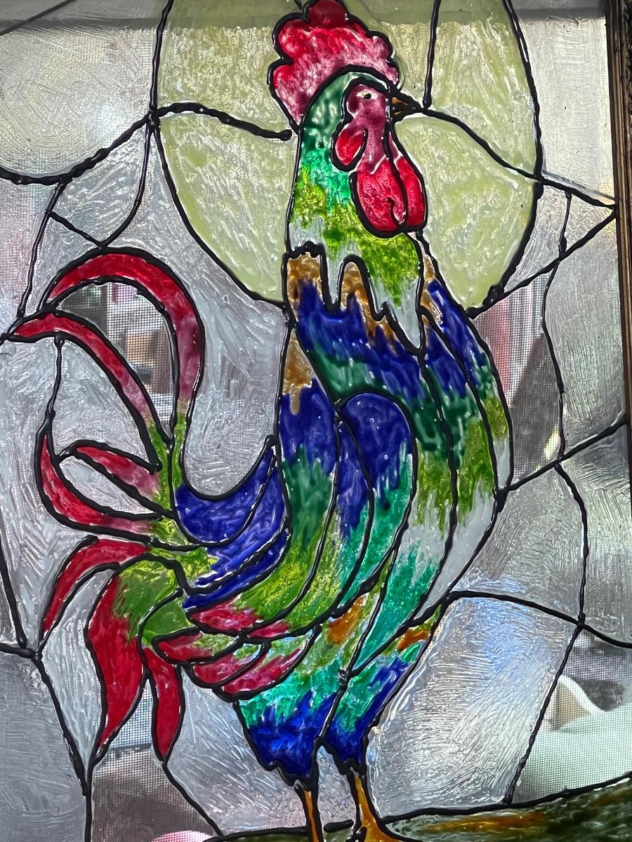 Made to look like stained glass. This rooster is actually hand painted. Needs to a new hang wire on back. 29 x 24