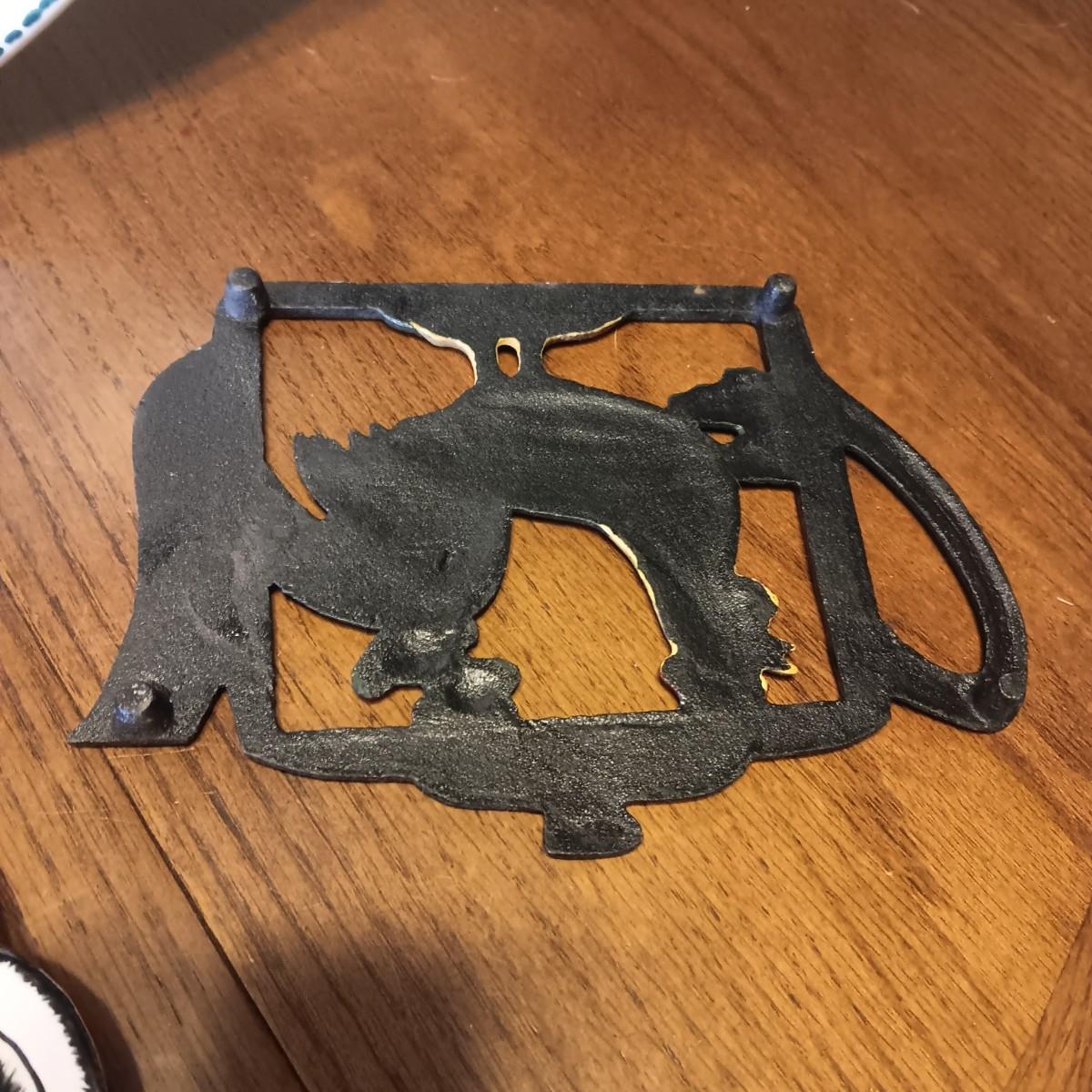 ROOSTER SERVING DISHES AND 2 CAST IRON TRIVETS